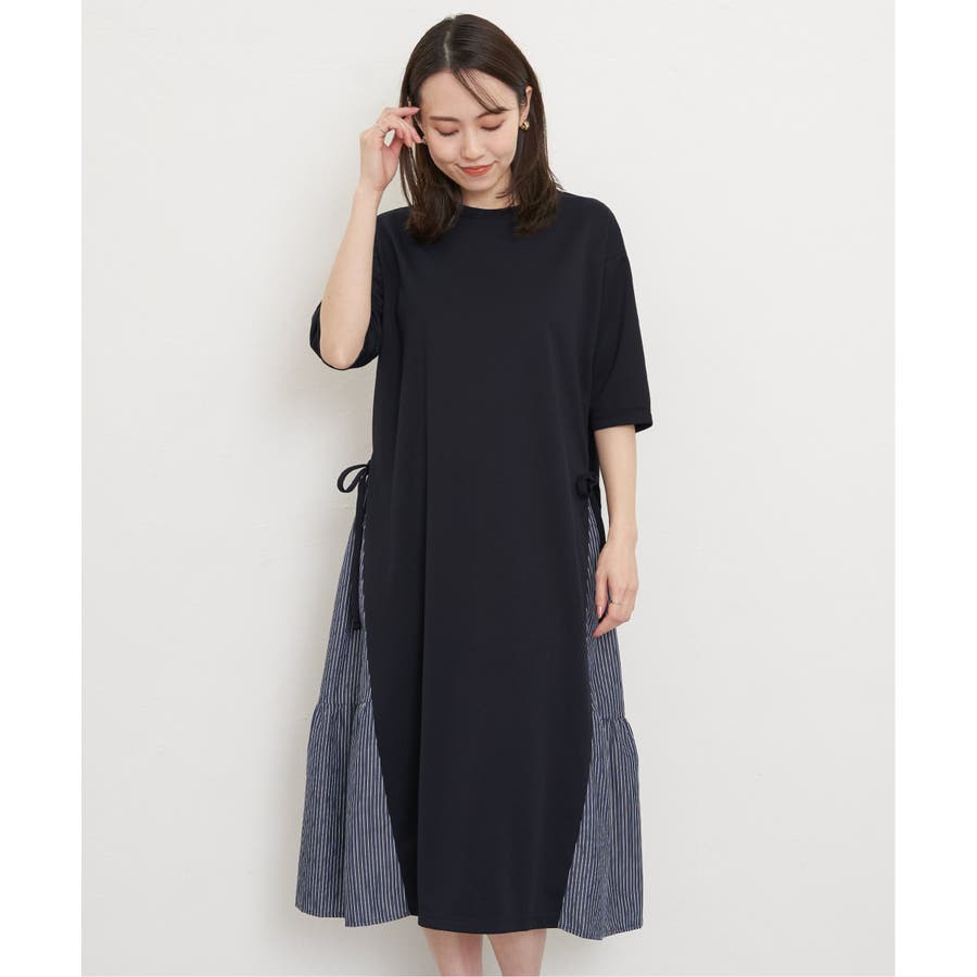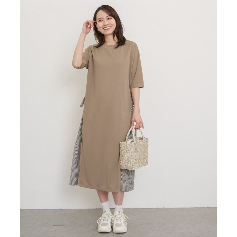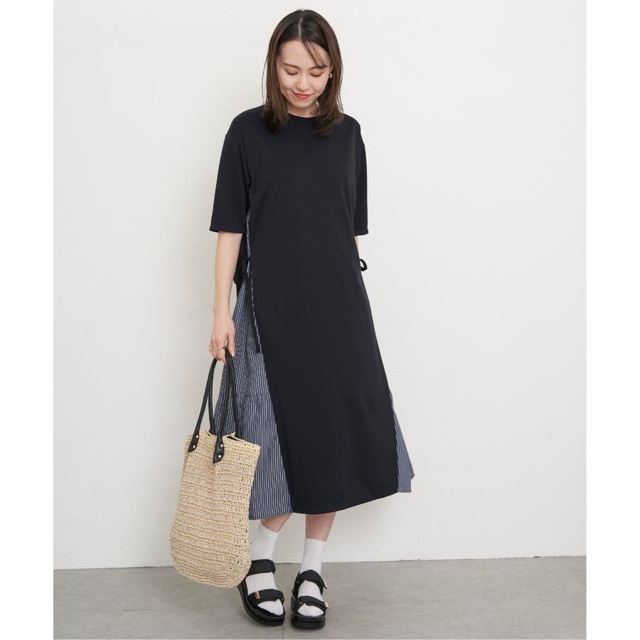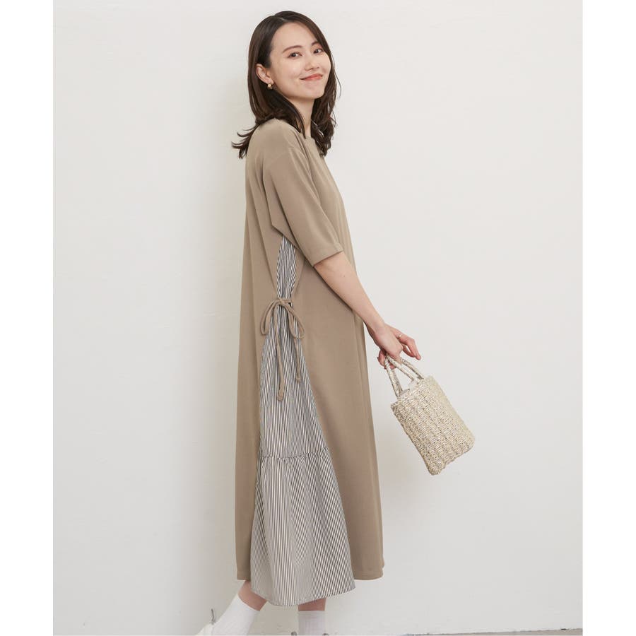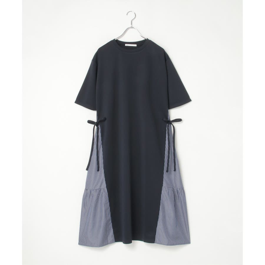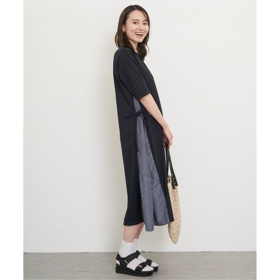サイドをストライプ柄で切り替えた異素材デザインのワンピース。