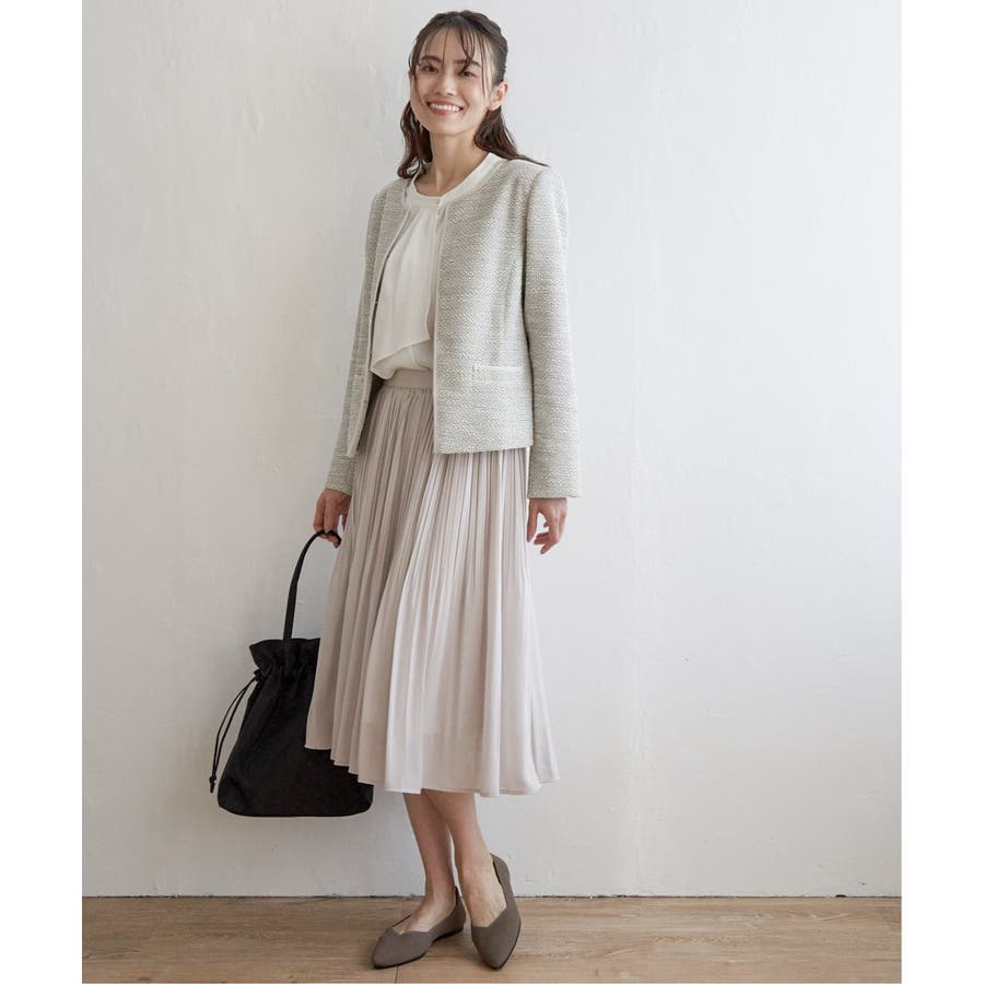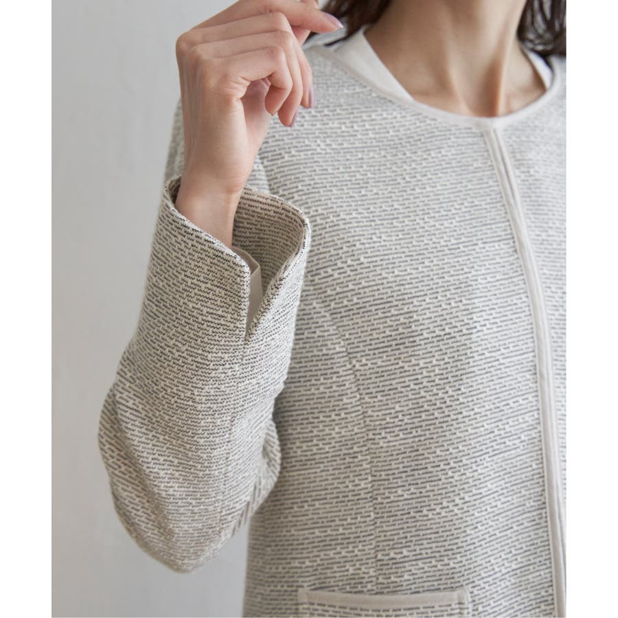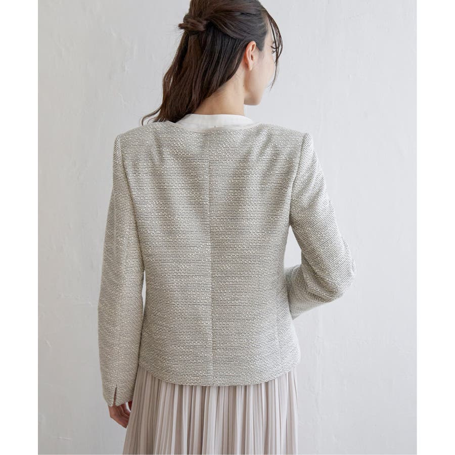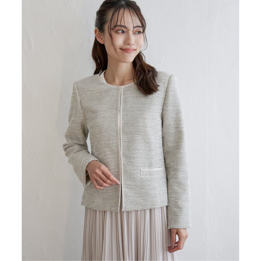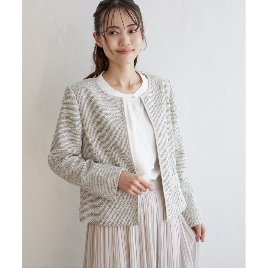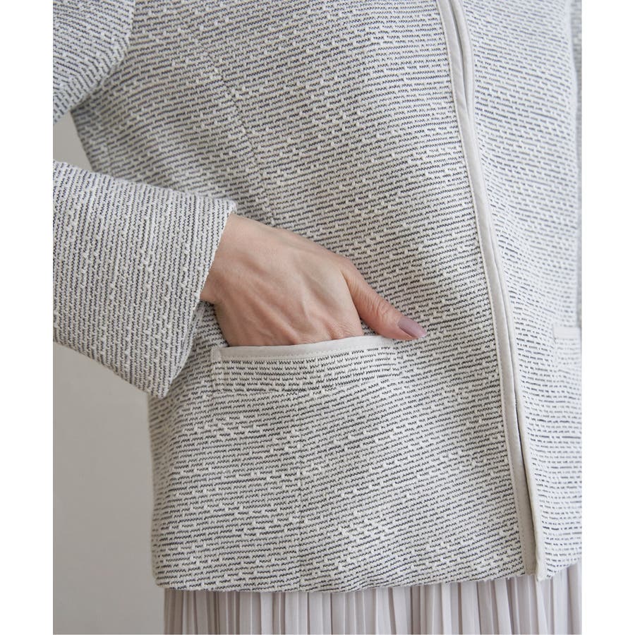王道なノーカラーデザインと、同色のパインピングが大人可愛いジャケットです。