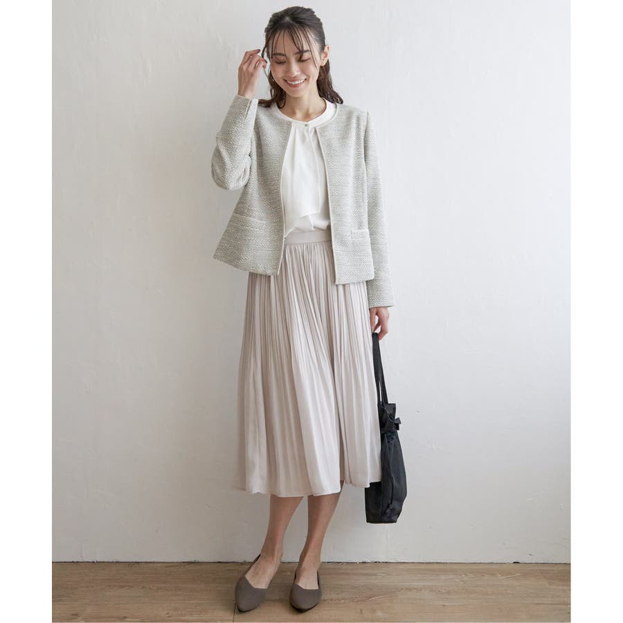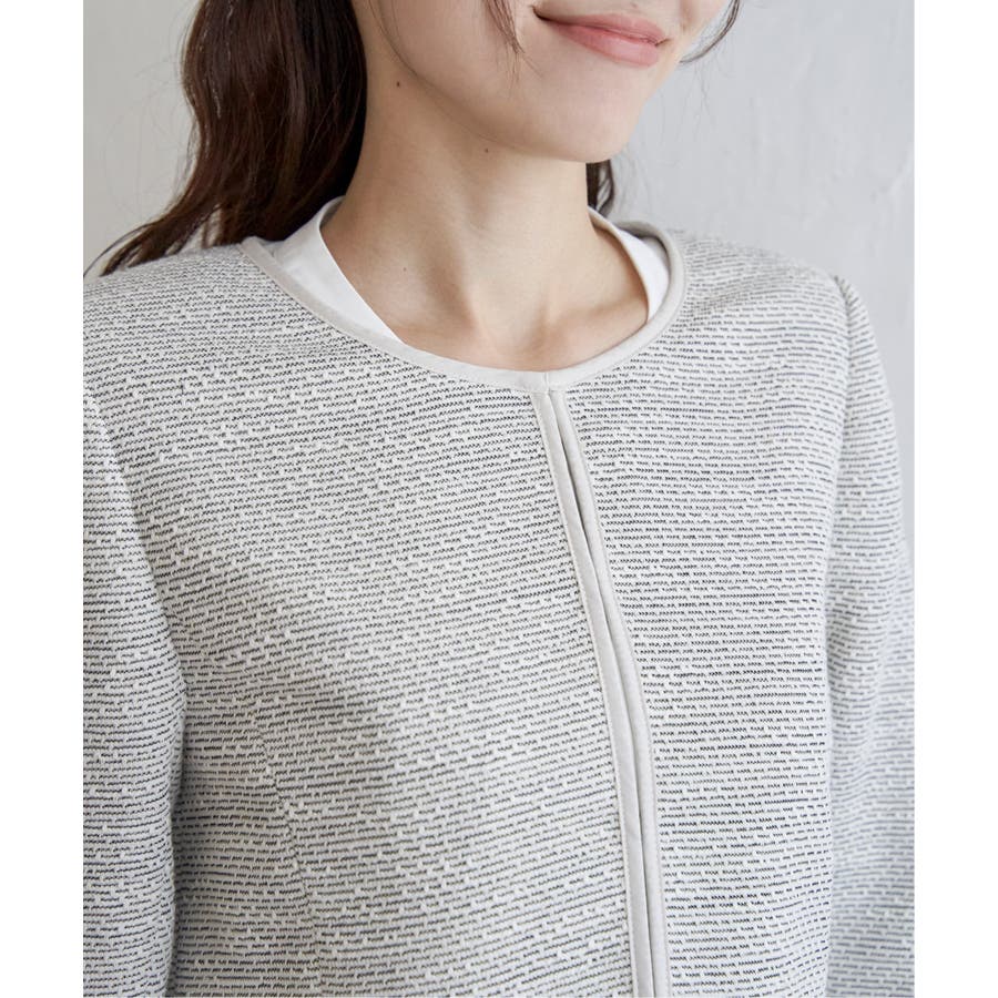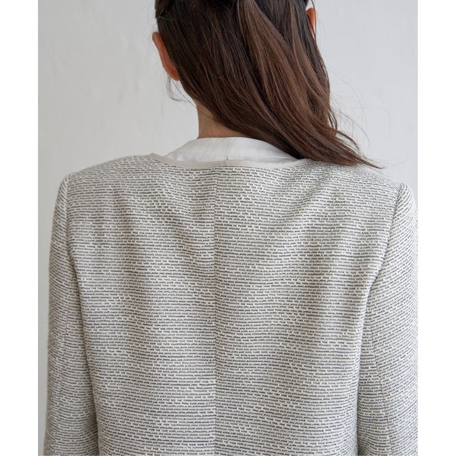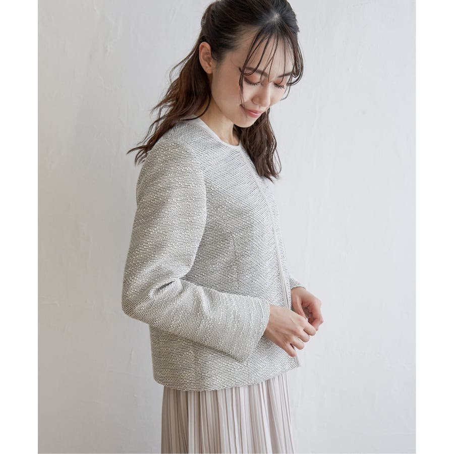 シンプルで使いやすいツイードノーカラージャケットは、カットソー素材で伸縮性も高く、裏地もカットソーなのでノンストレスで使いやすい!