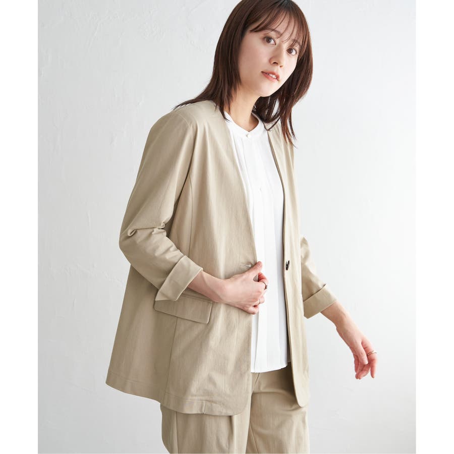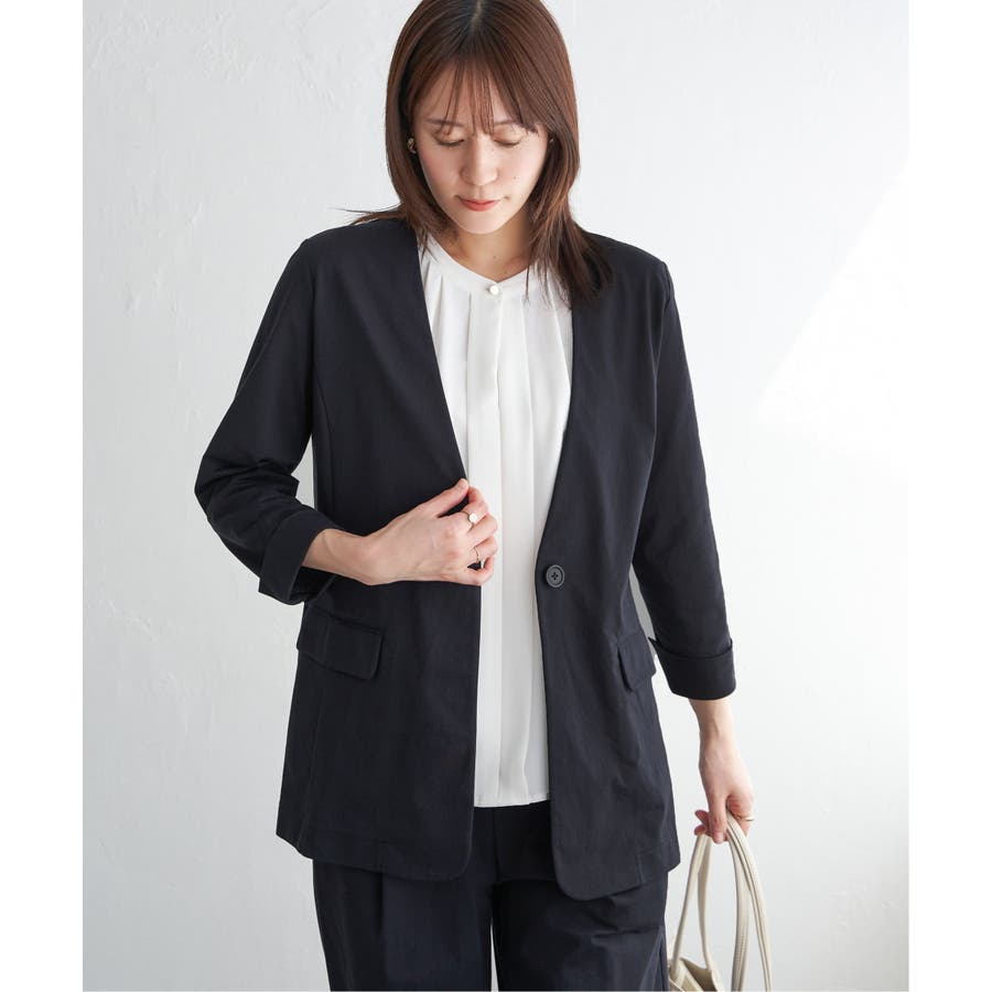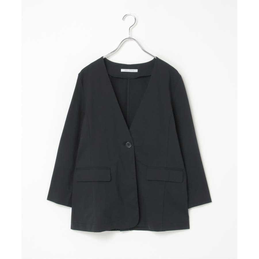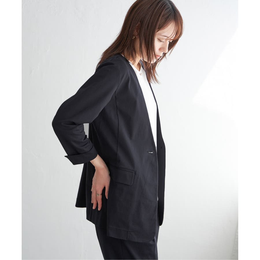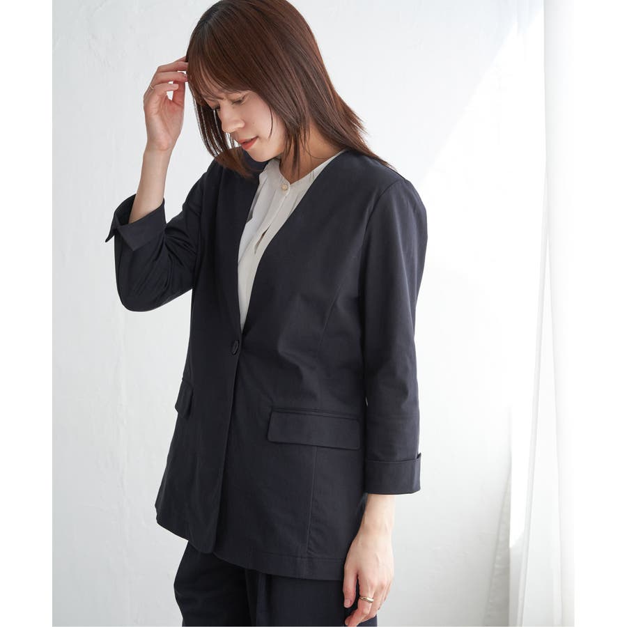 ベーシックなVネックデザインで、どんなシーンでも活躍するノーカラージャケット。