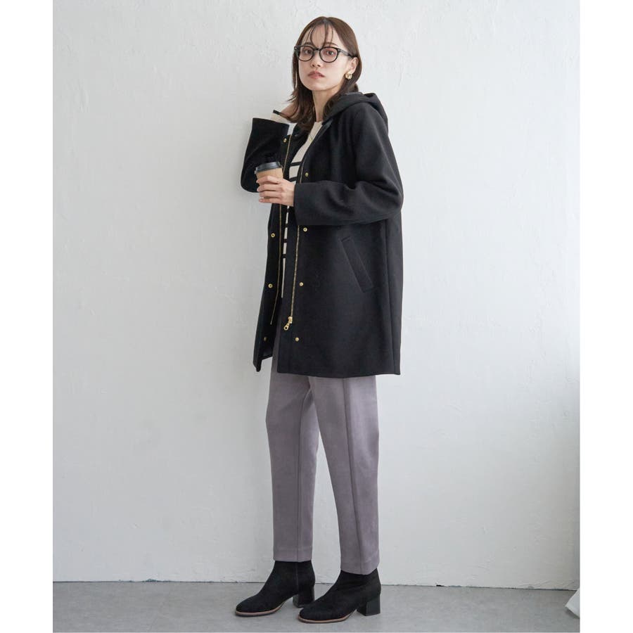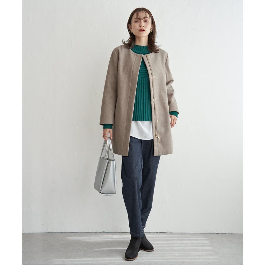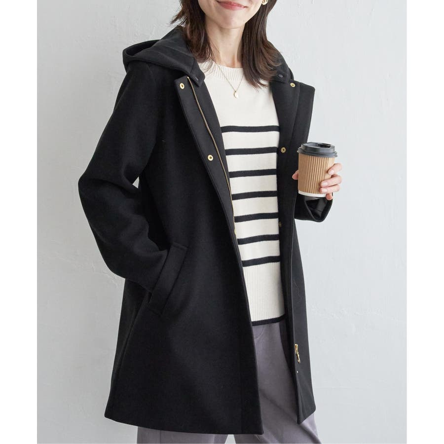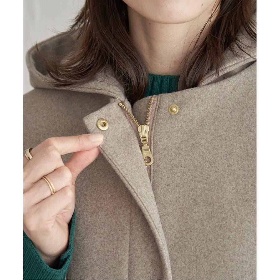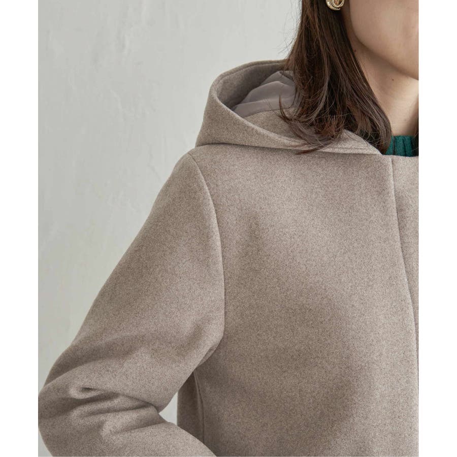 フードを外すときちんと感が更に増し、首回りをすっきり魅せることができるノーカラーコートに。