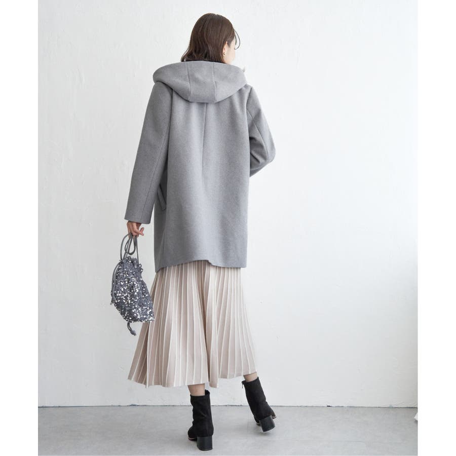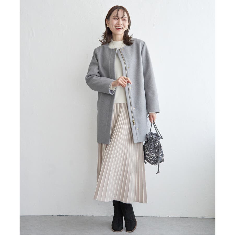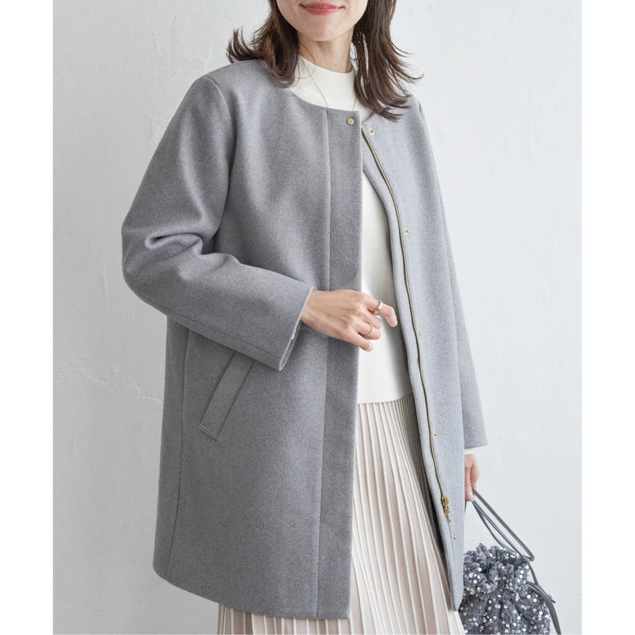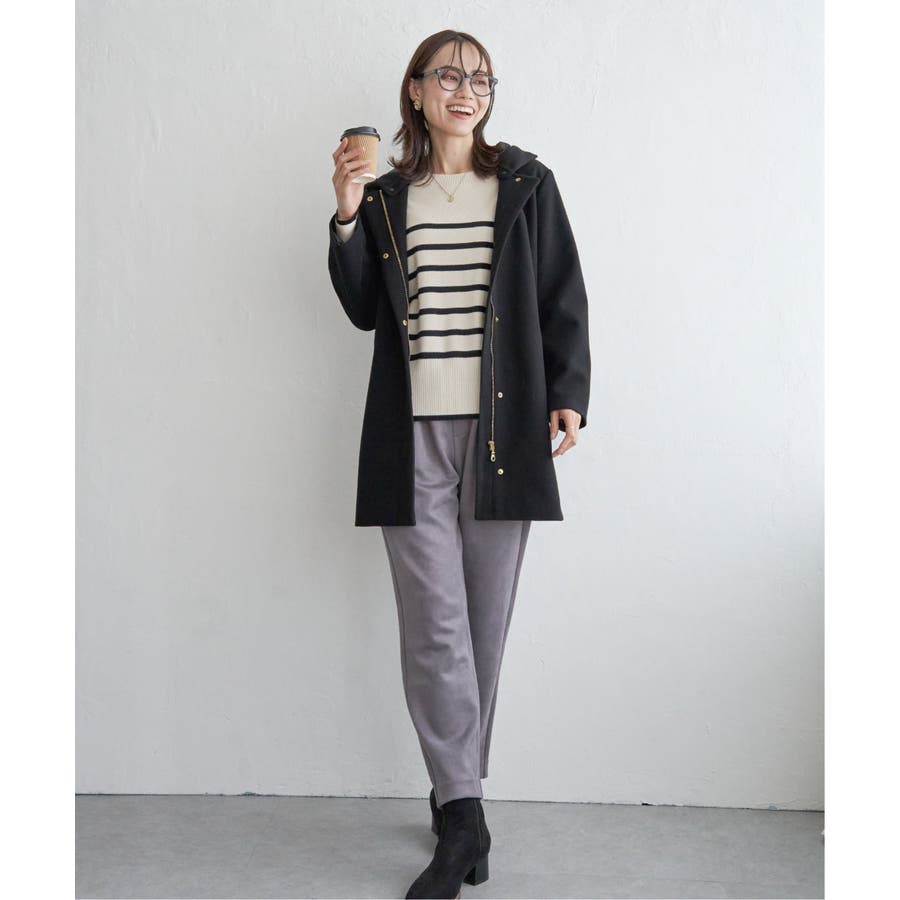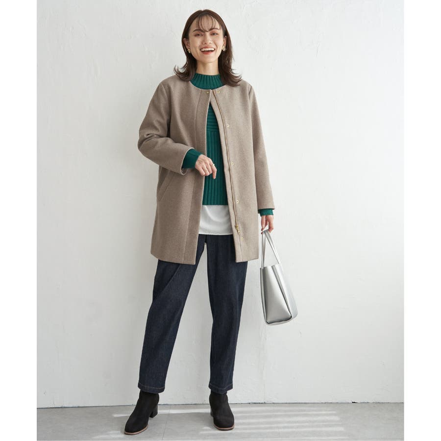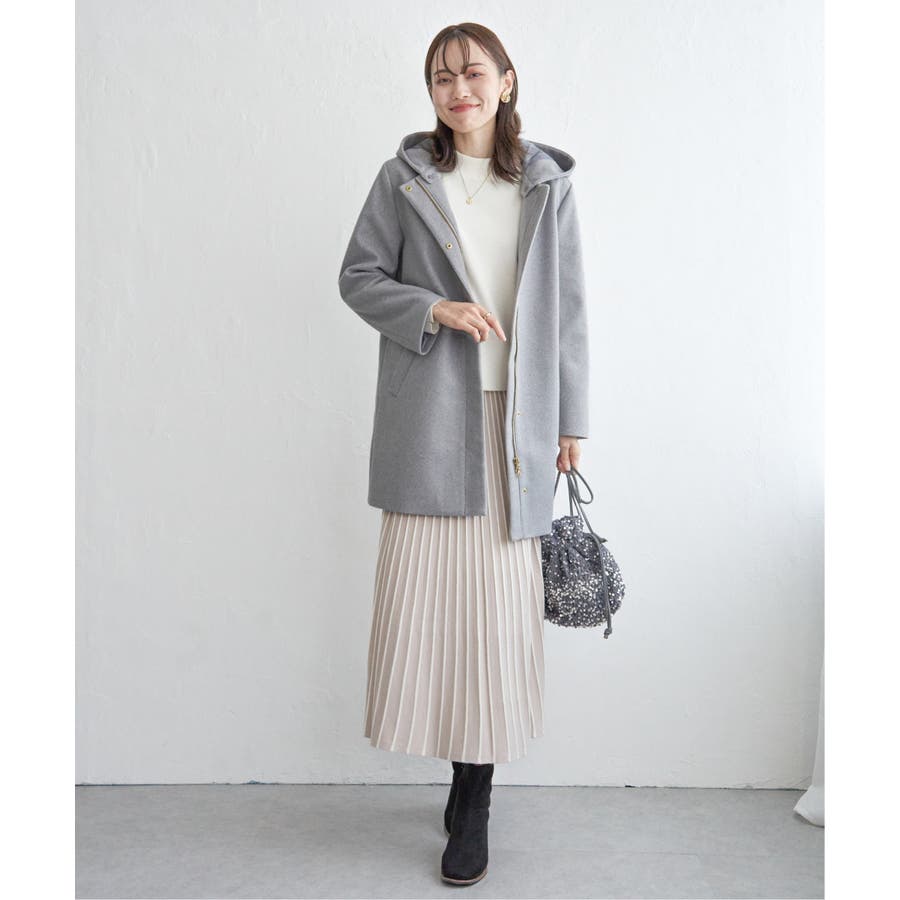 フードを外すときちんと感が更に増し、首回りをすっきり魅せることができるノーカラーコートに。