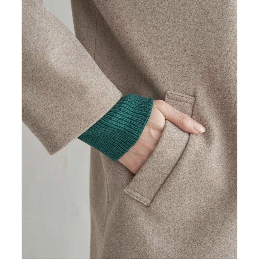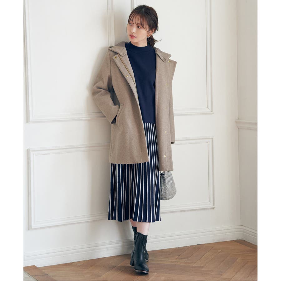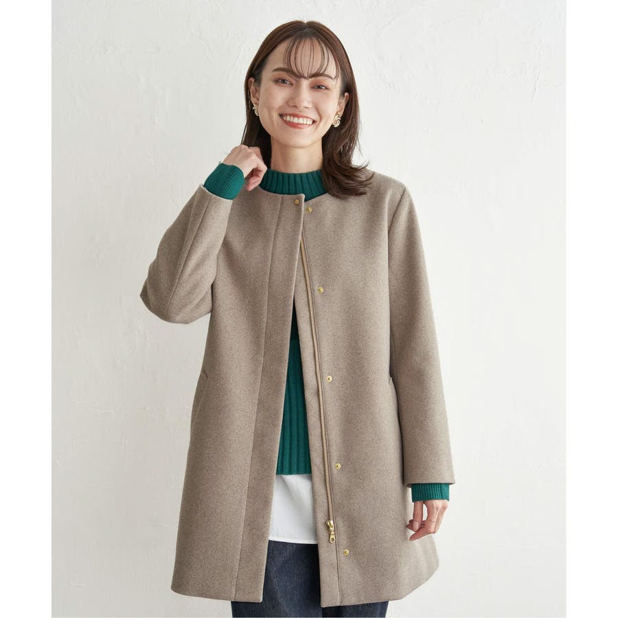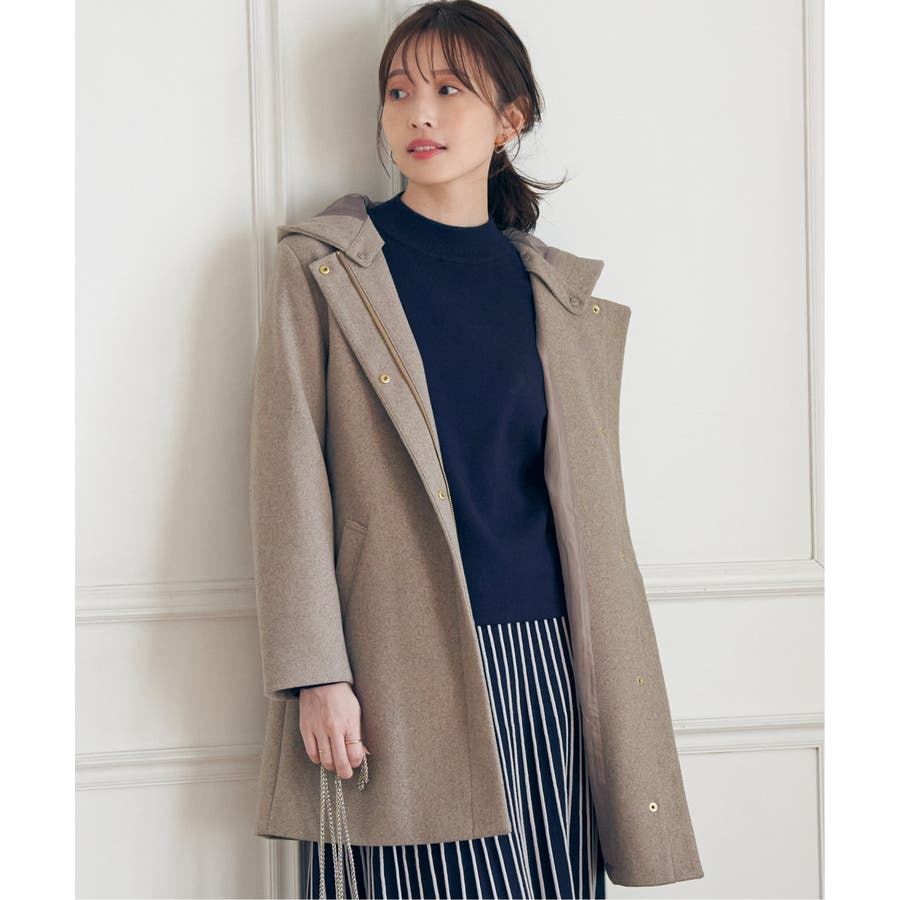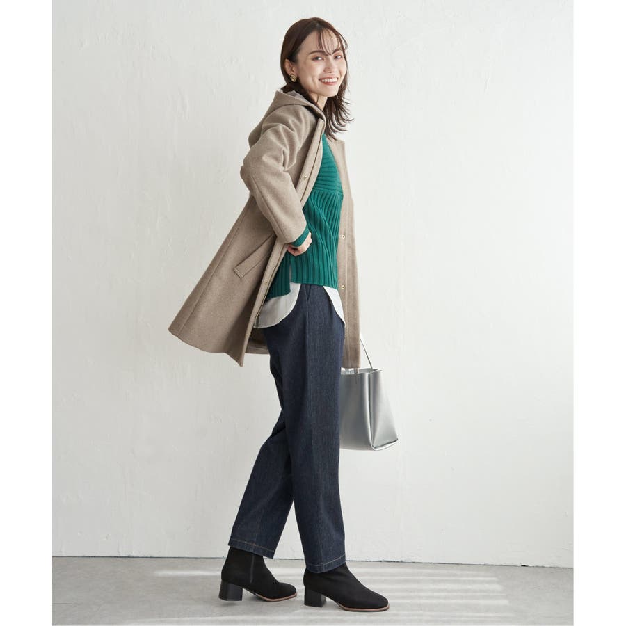 フードを外すときちんと感が更に増し、首回りをすっきり魅せることができるノーカラーコートに。