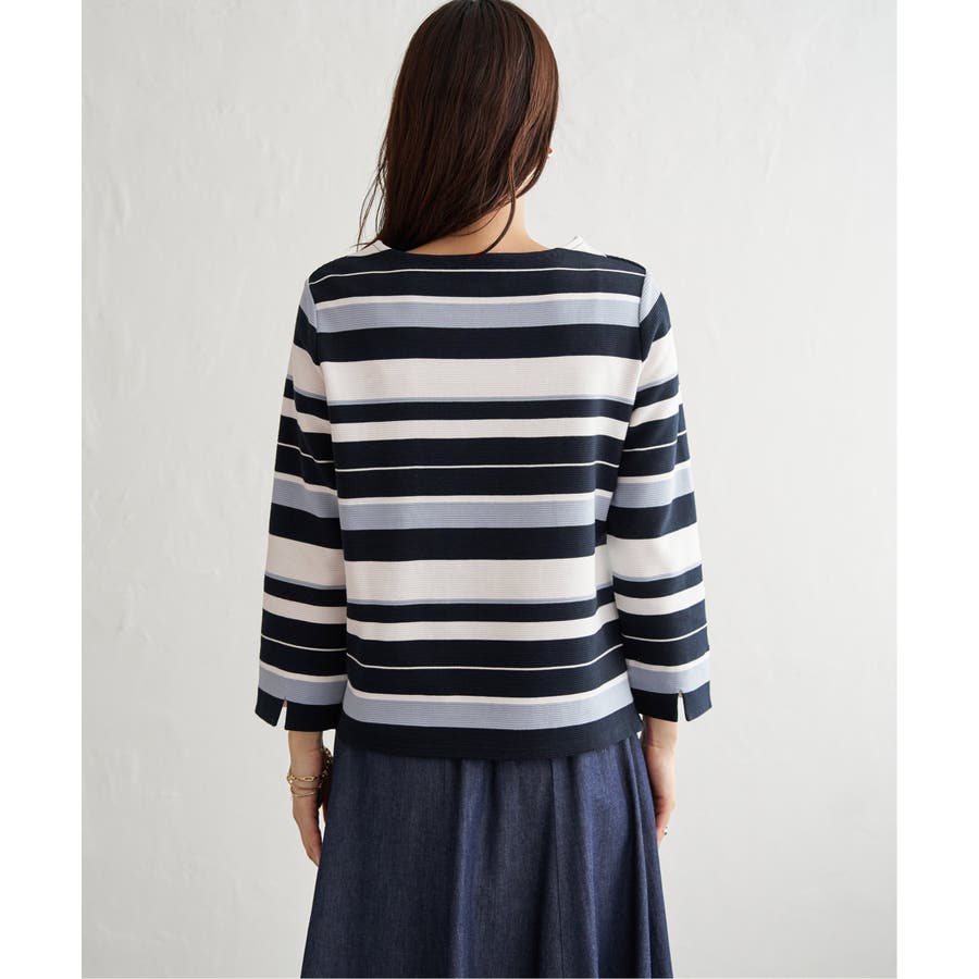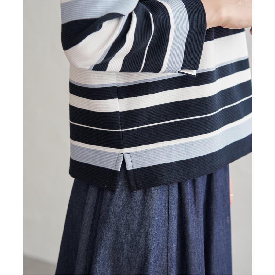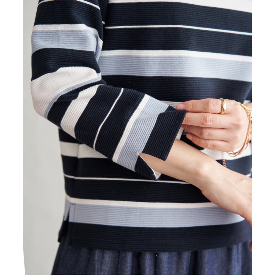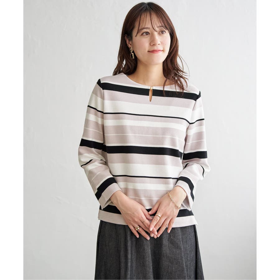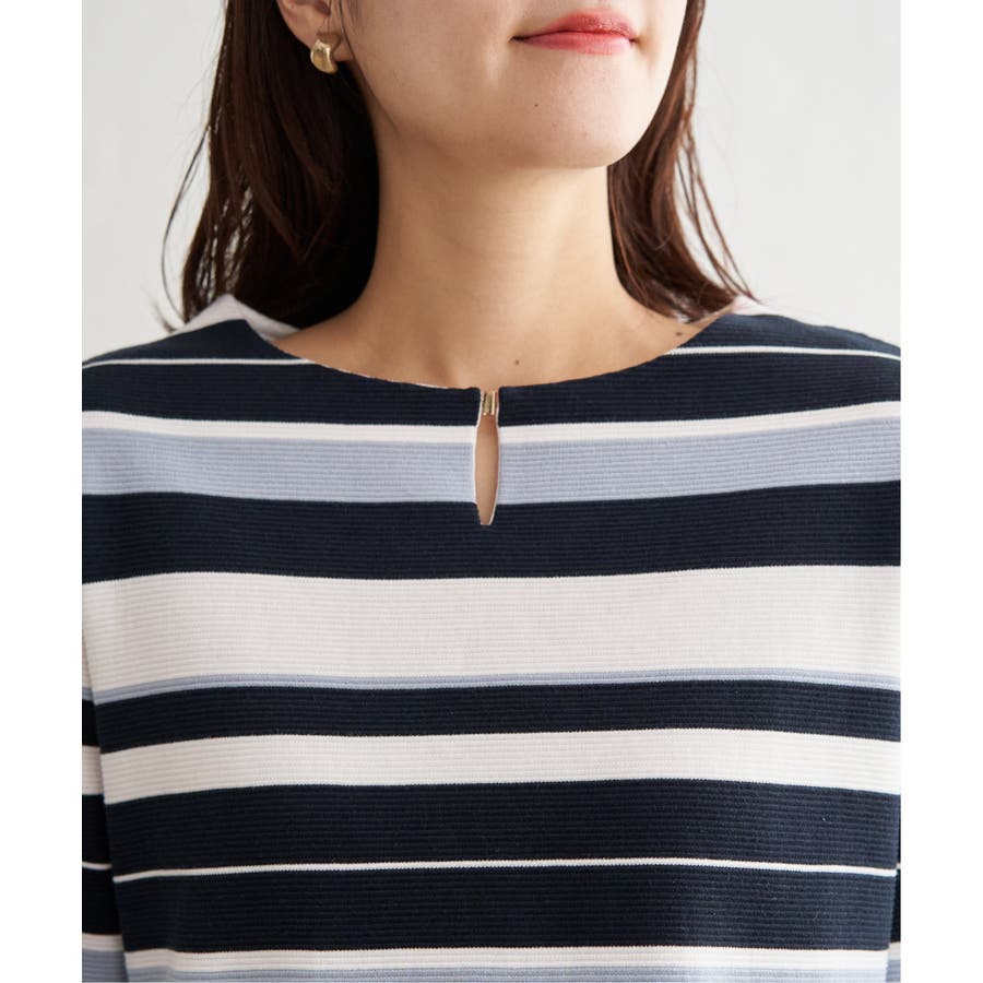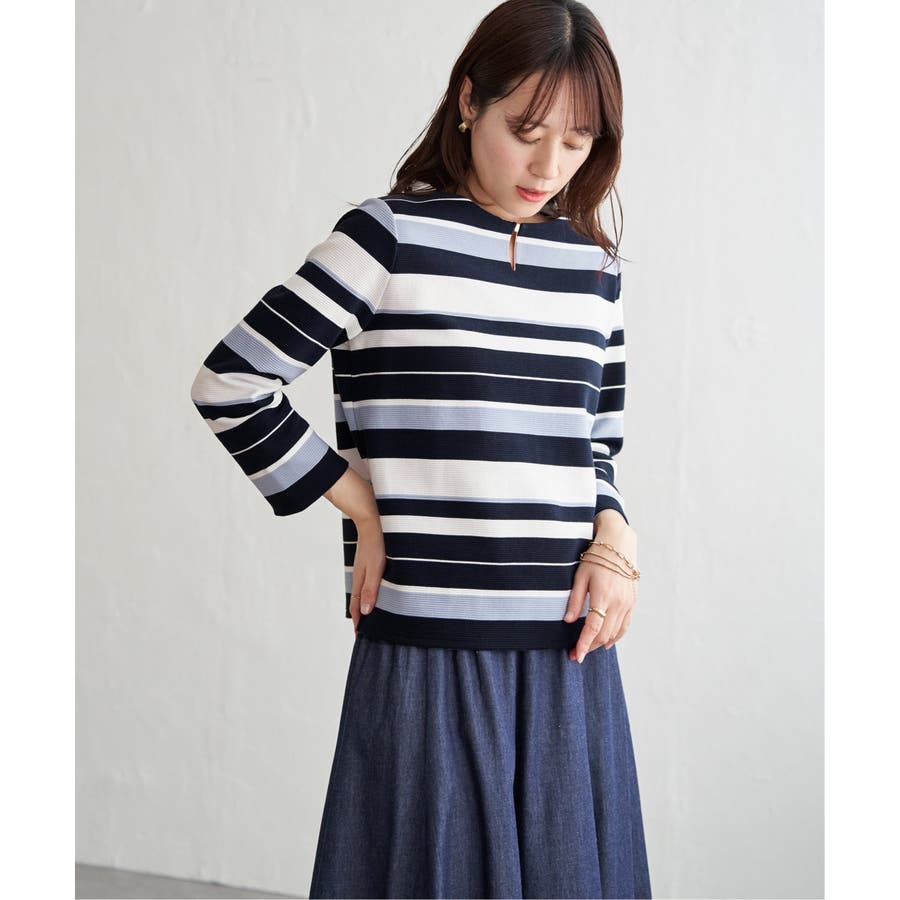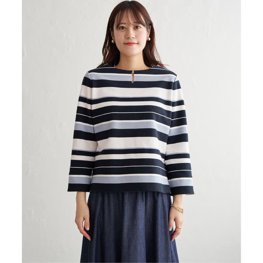 リップル素材ならではの凹凸感が印象的な、ボーダー柄キーネックプルオーバー。