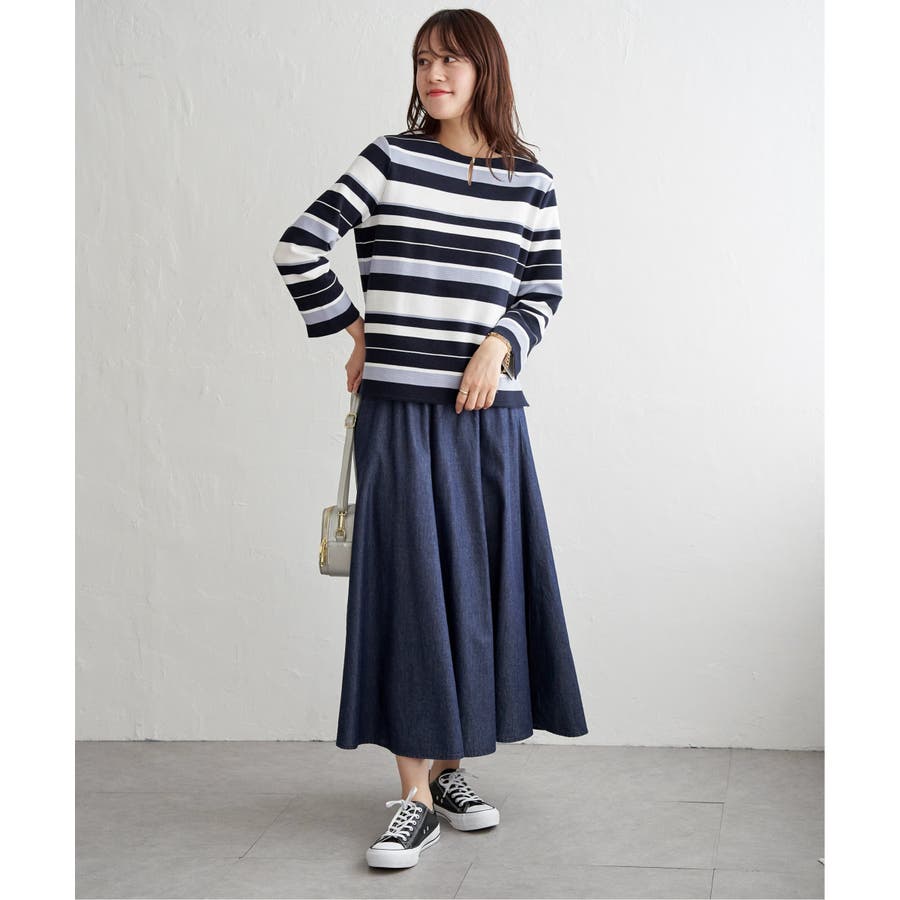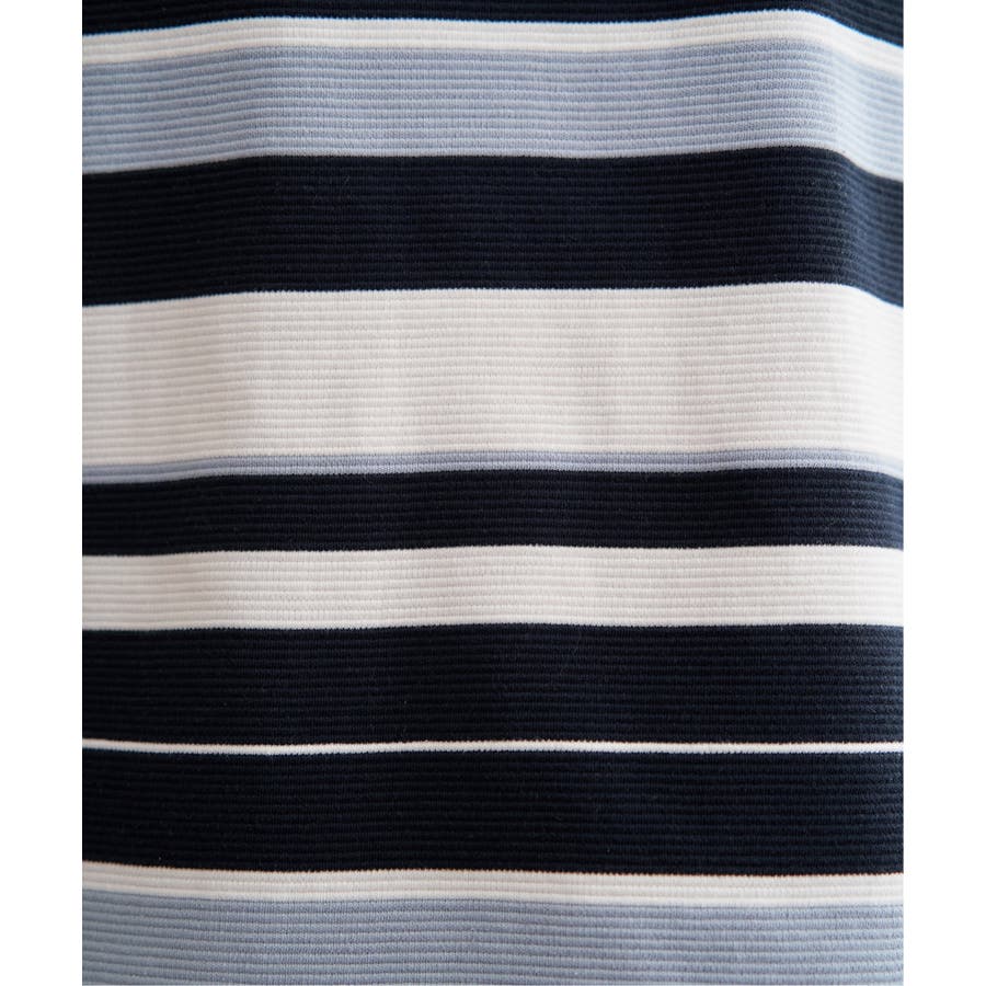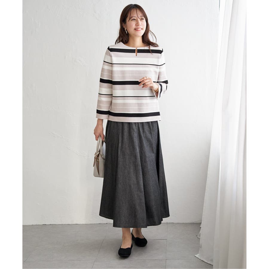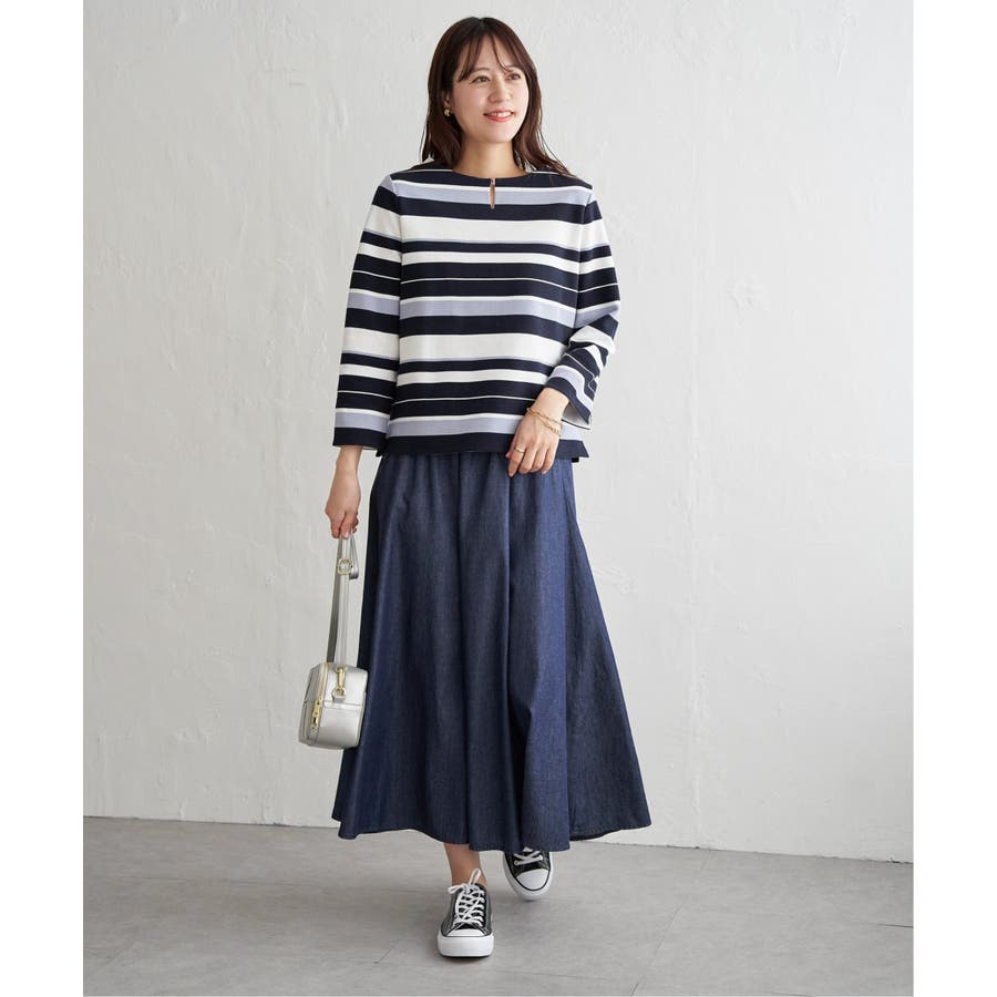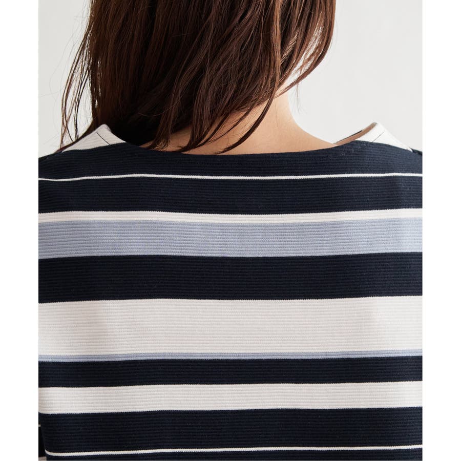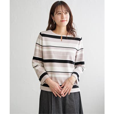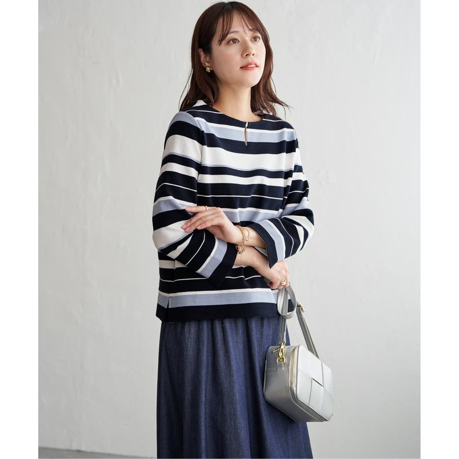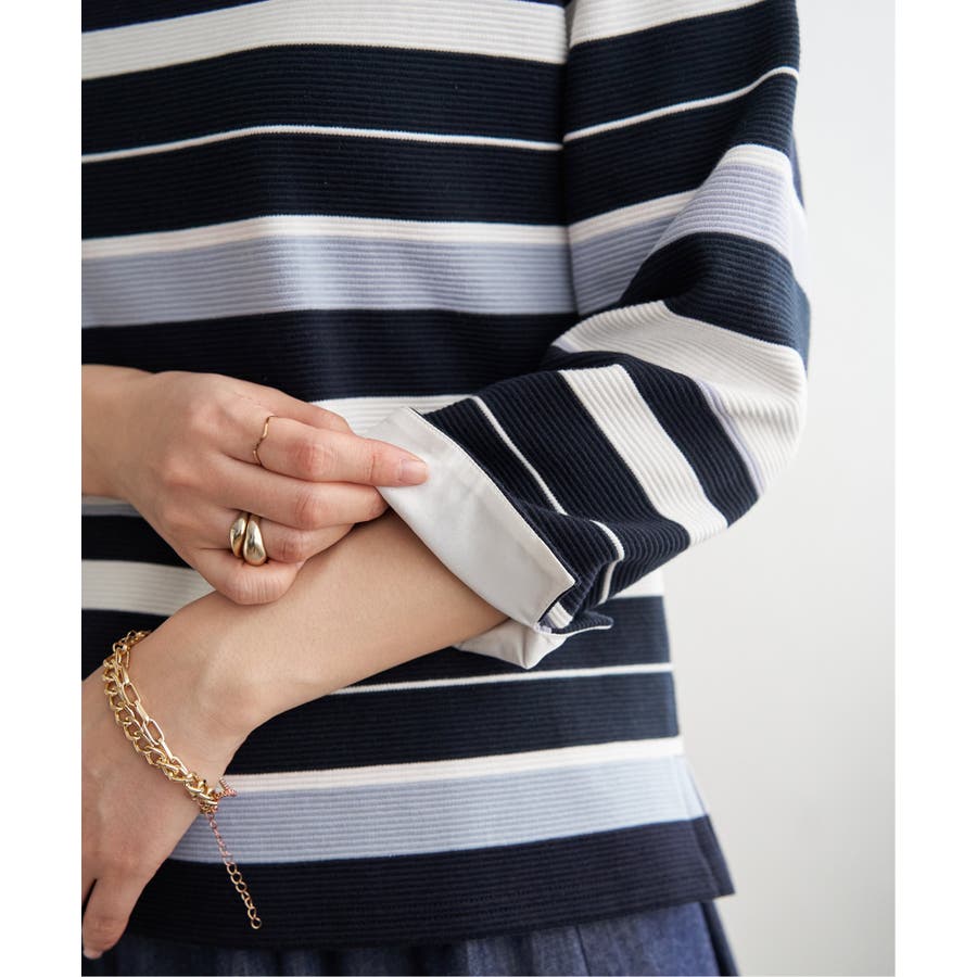 リップル素材ならではの凹凸感が印象的な、ボーダー柄キーネックプルオーバー。
