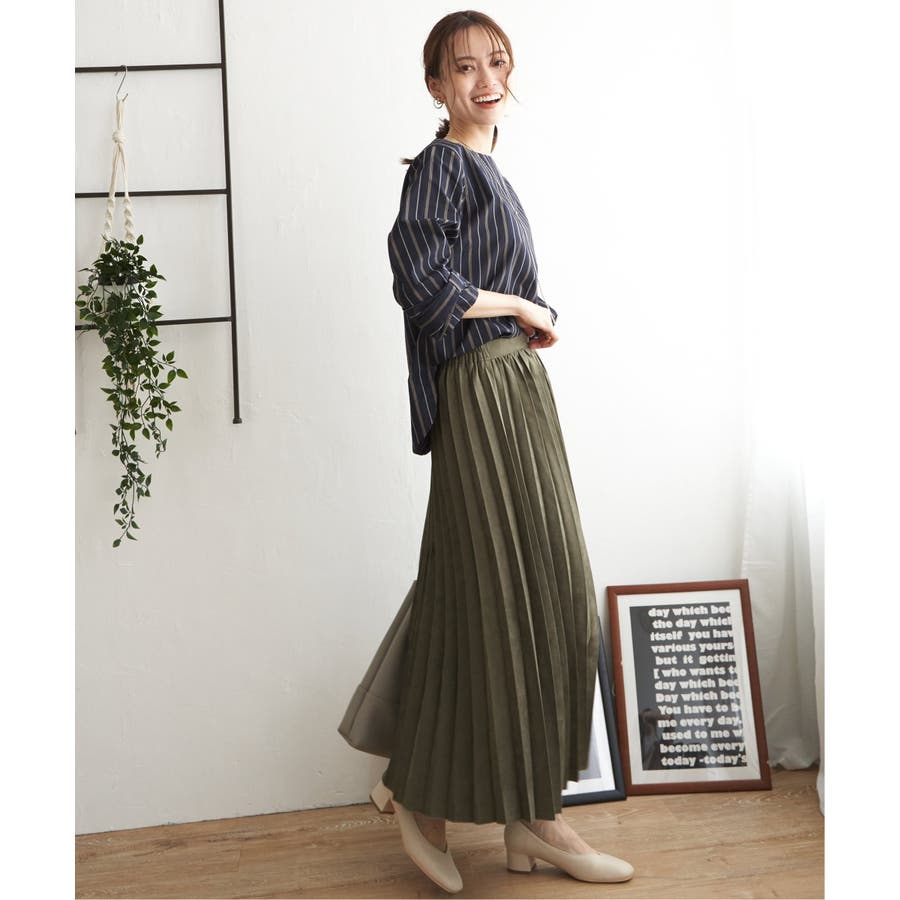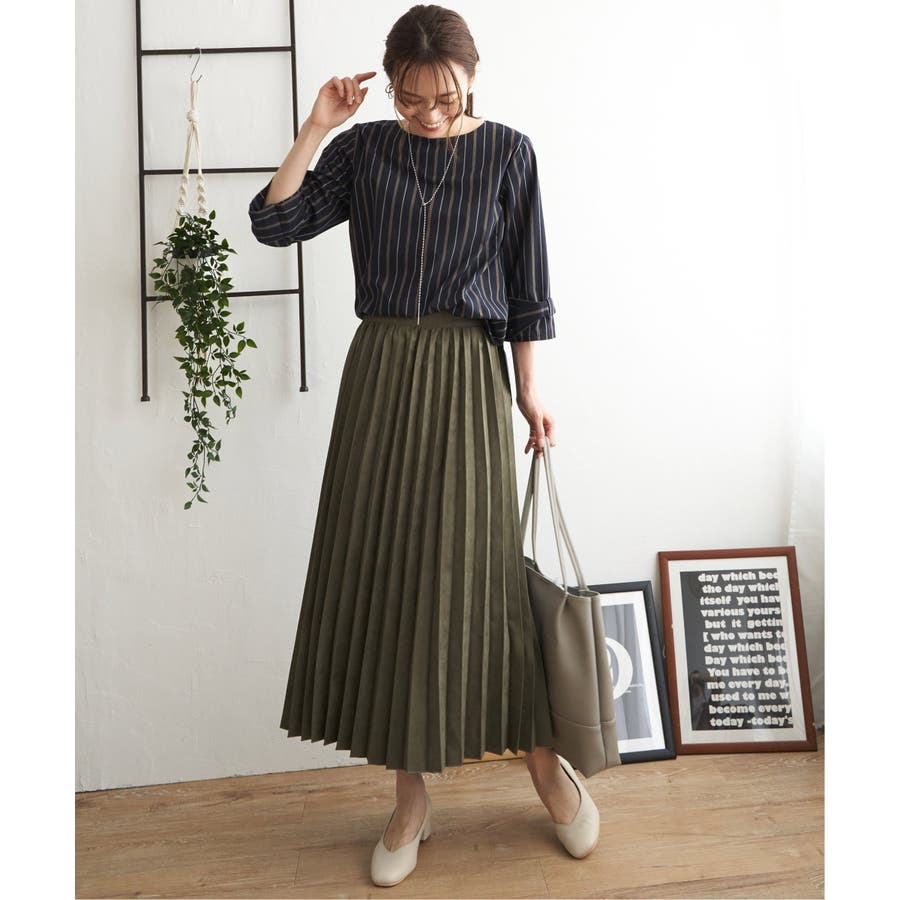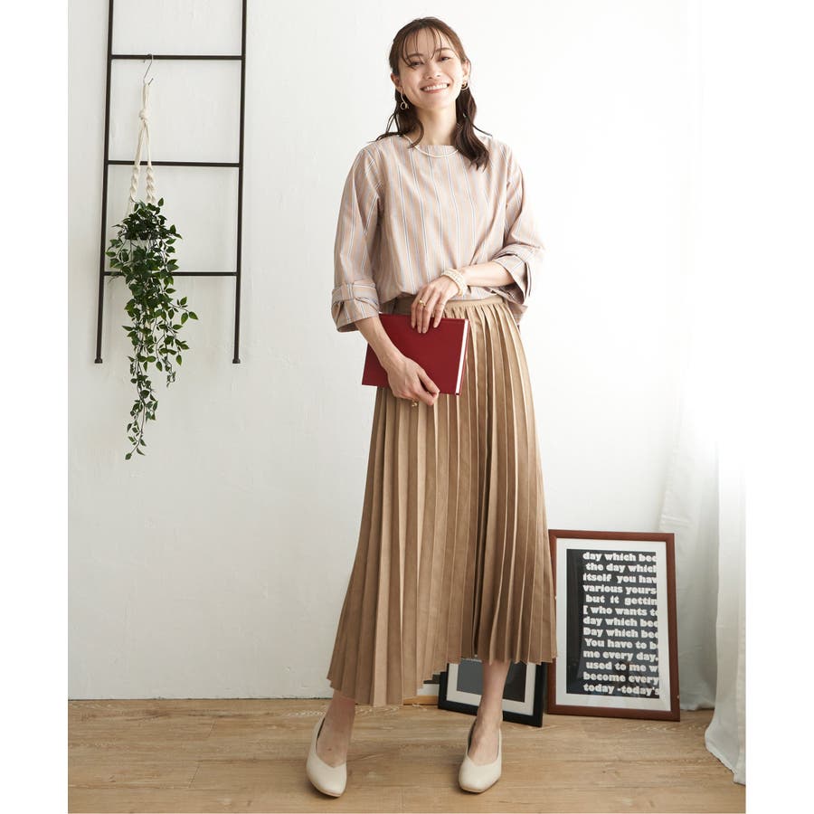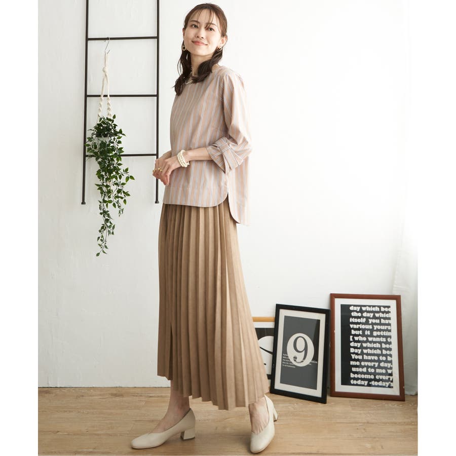 プリーツスカートやフレアスカートにはトップスインで着るとバランス良くまとまります。