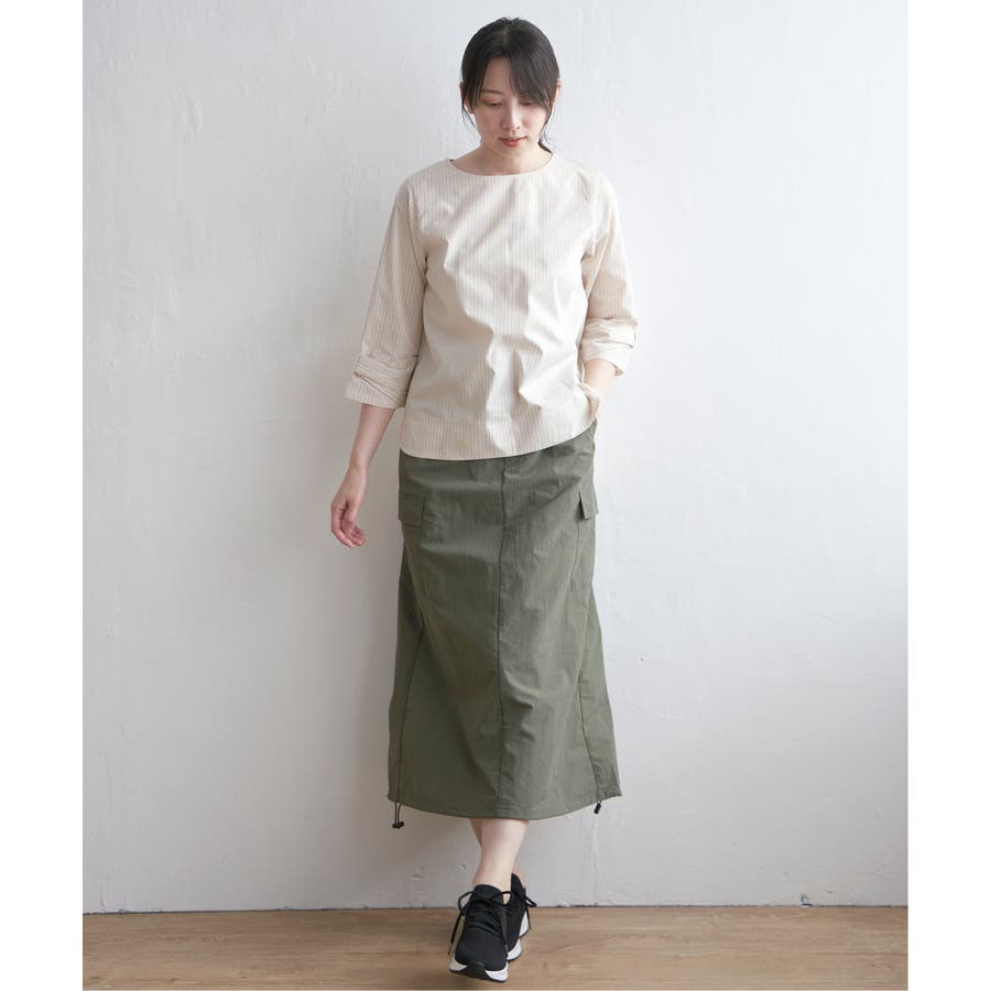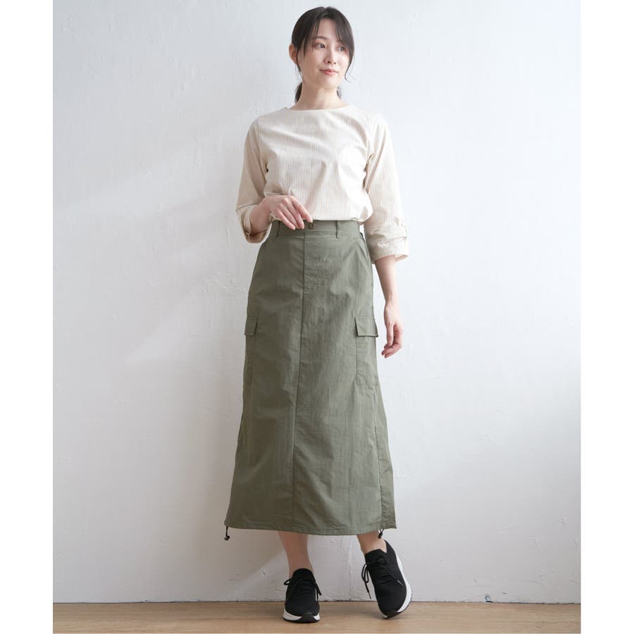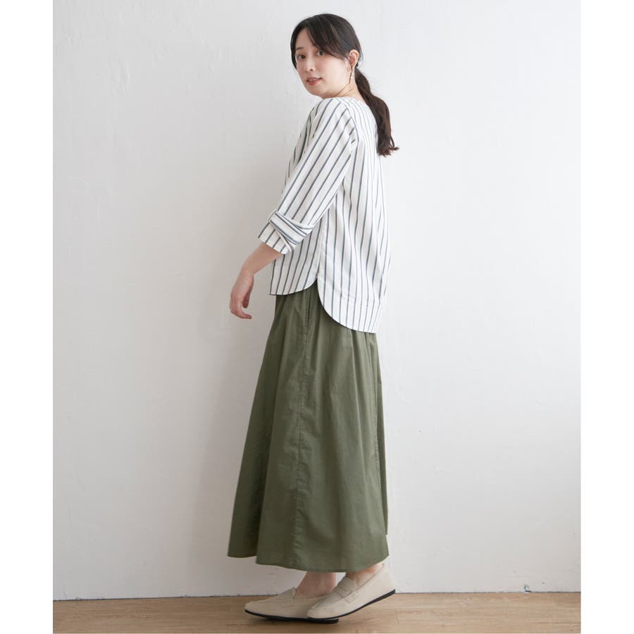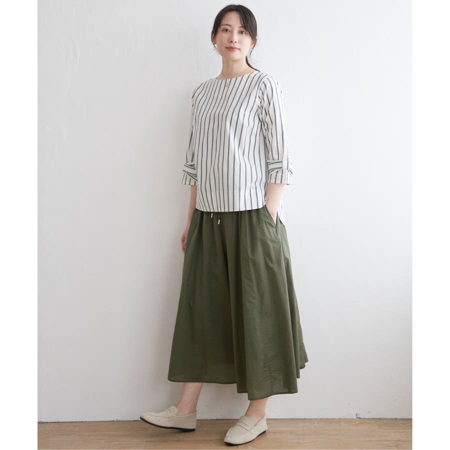 プリーツスカートやフレアスカートにはトップスインで着るとバランス良くまとまります。