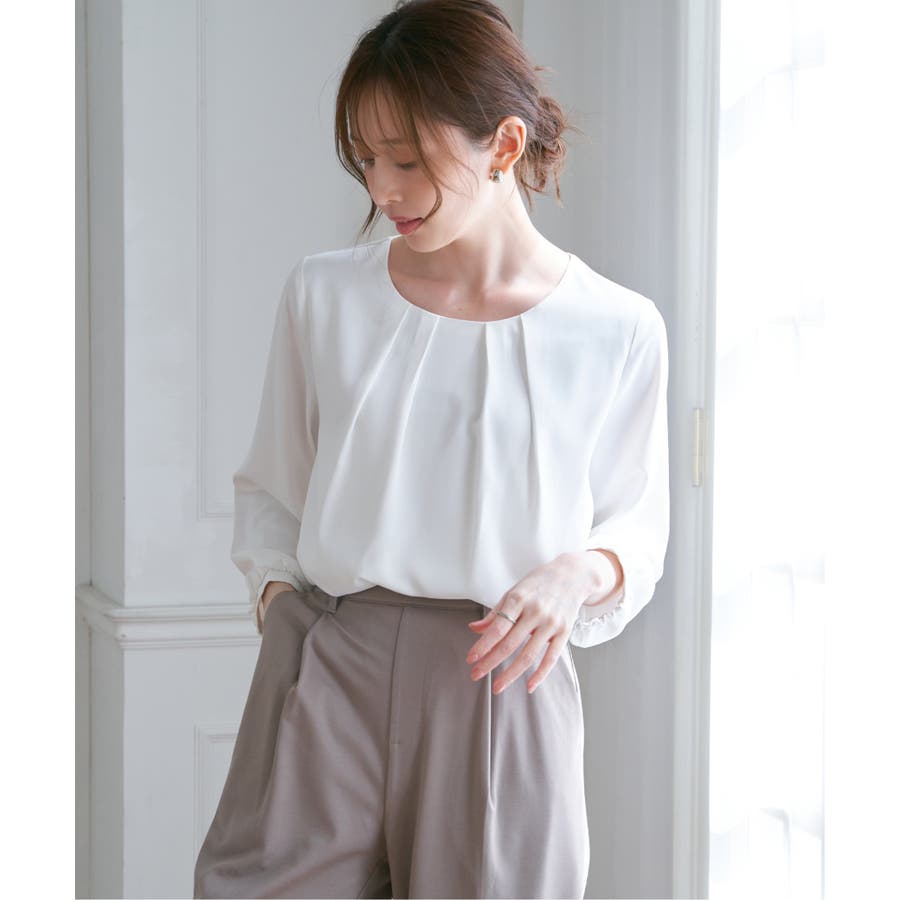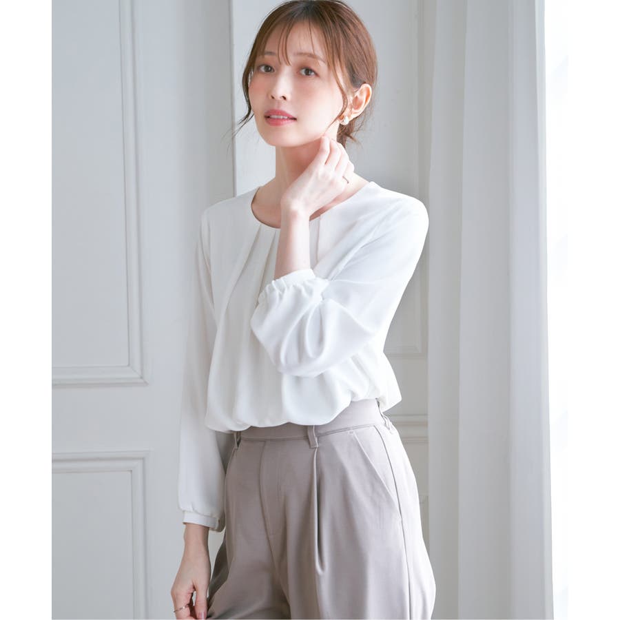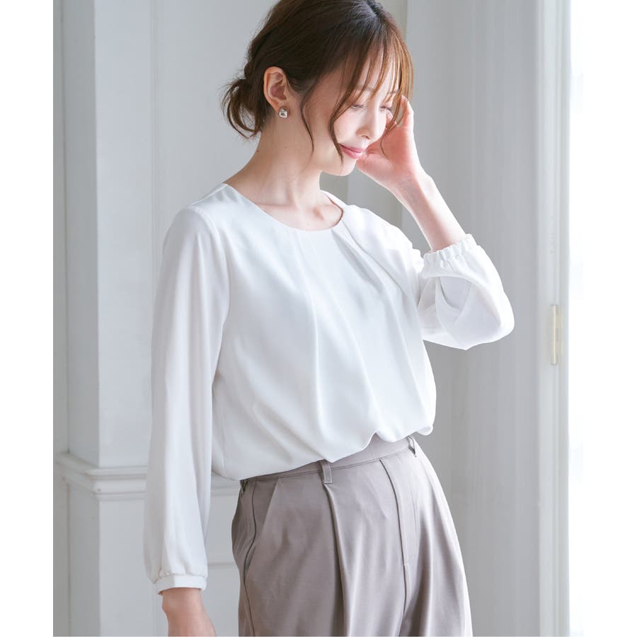 アクセいらずで顔まわりに華やかさを添える、ネックレス風のチャームが付いたブラウス。