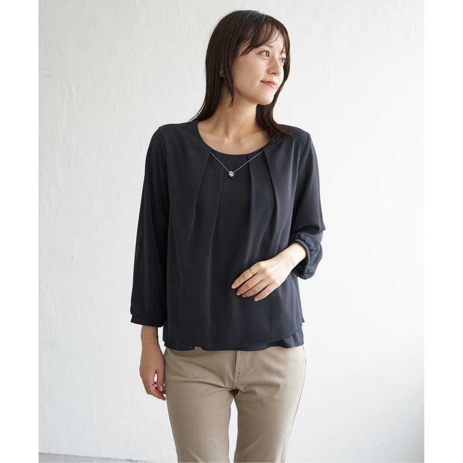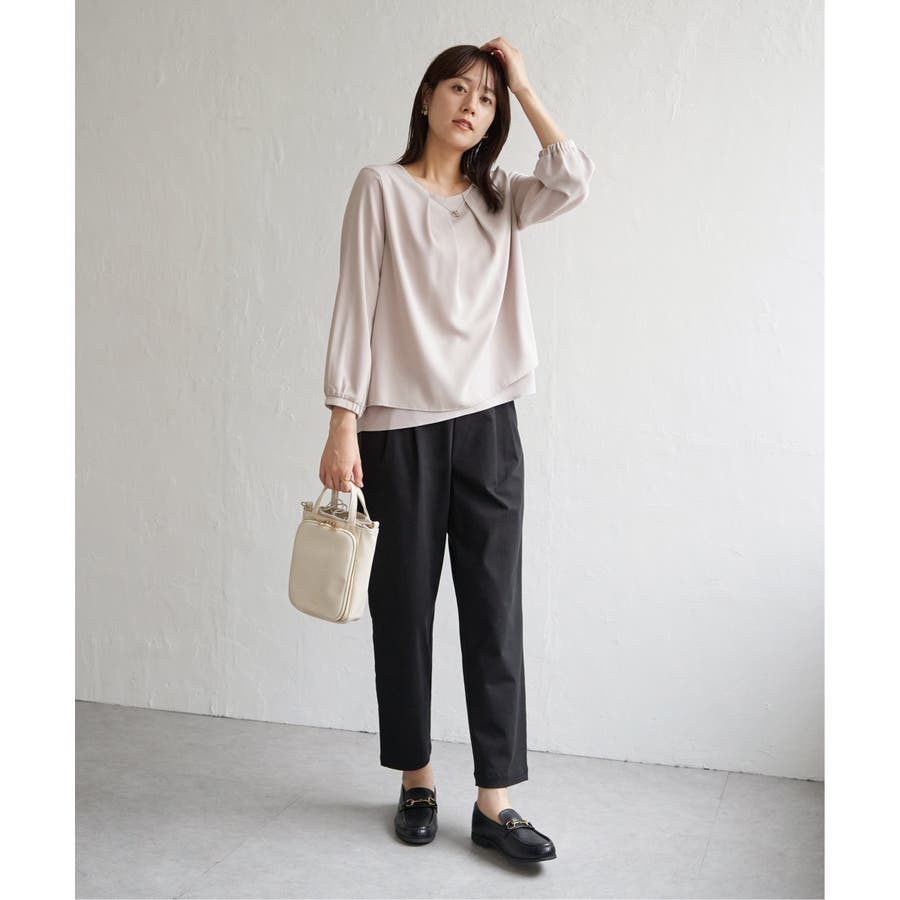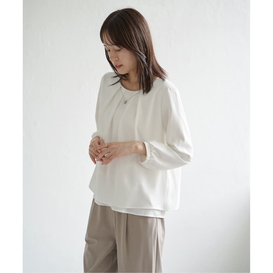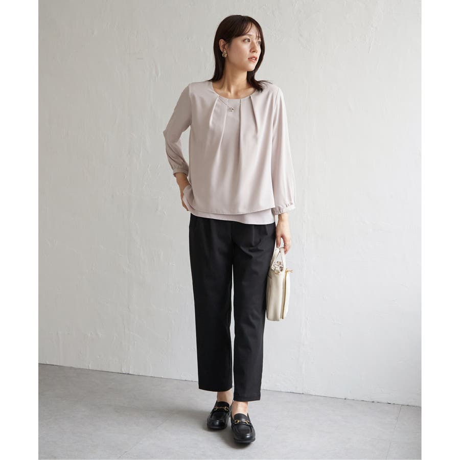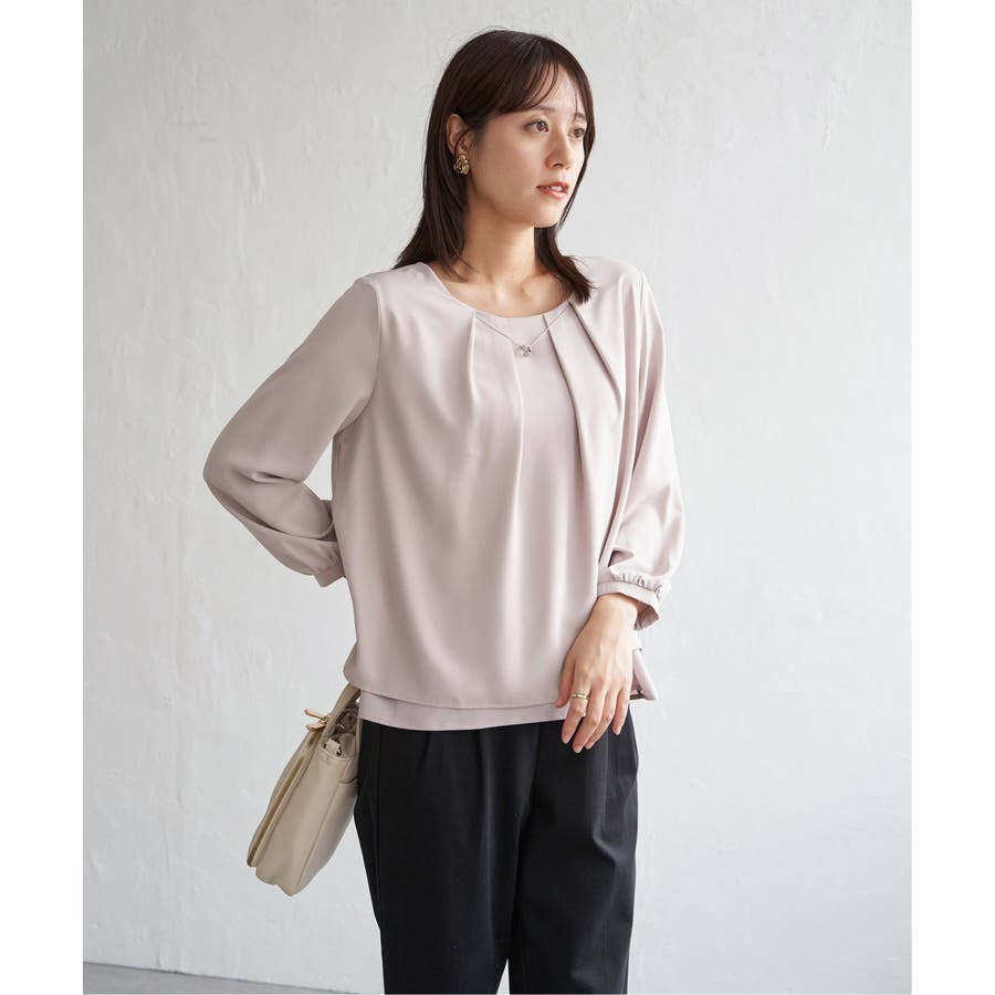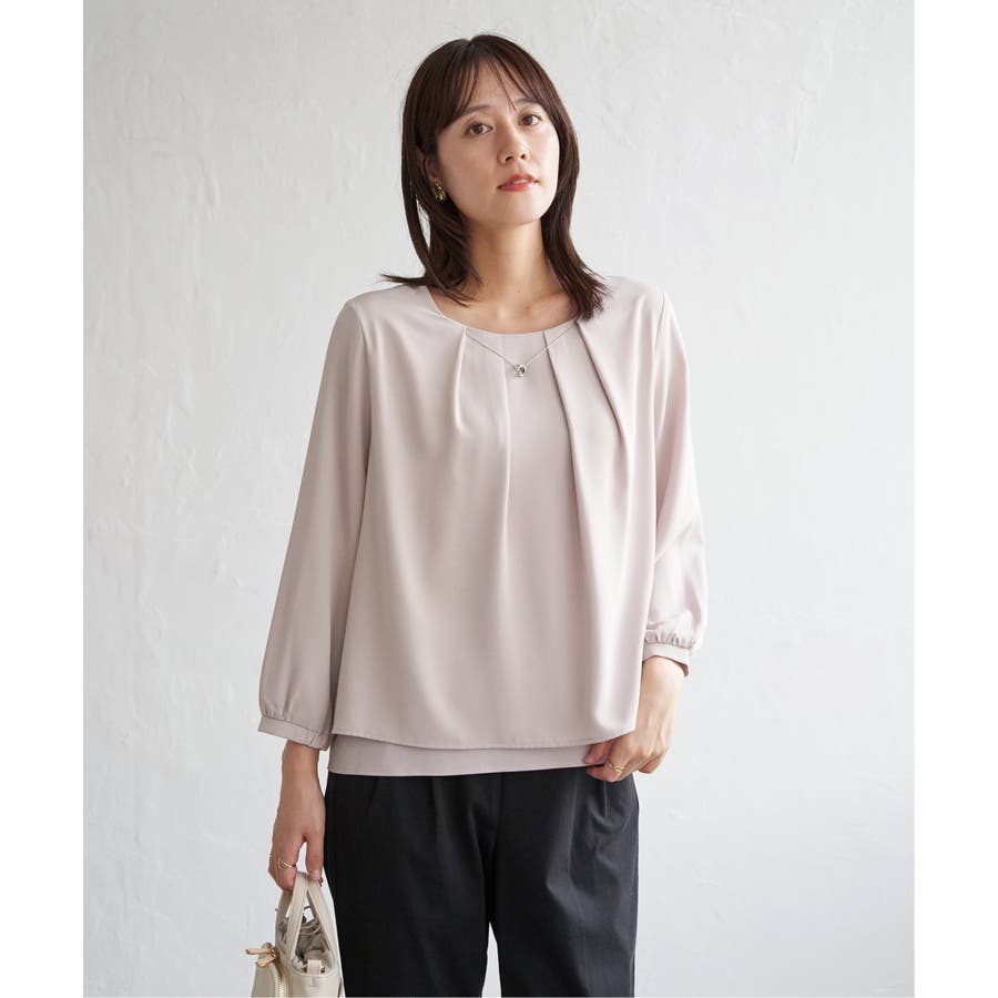 【ピンクベージュ】ネックレス付き裾2段ブラウス