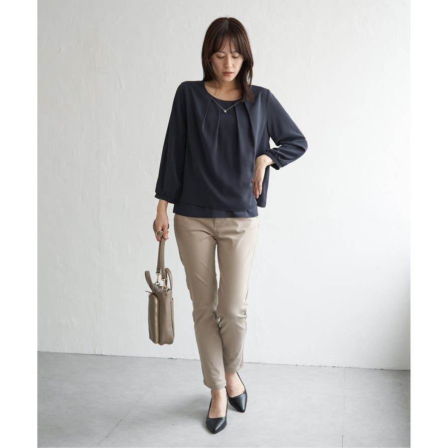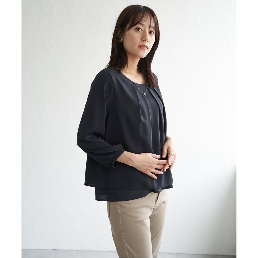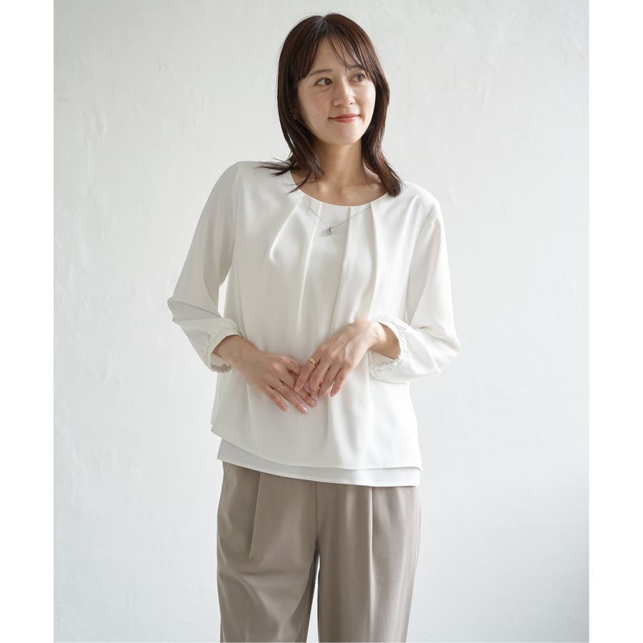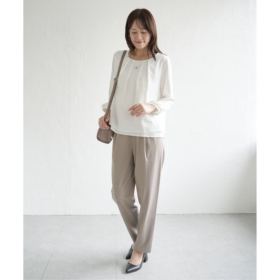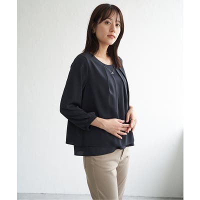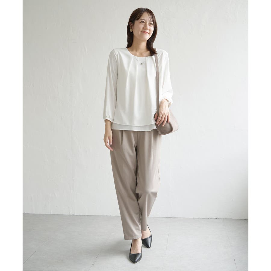 【ピンクベージュ】ネックレス付き裾2段ブラウス