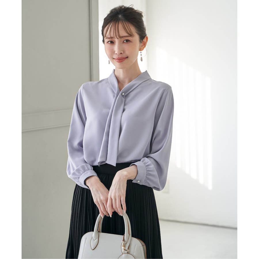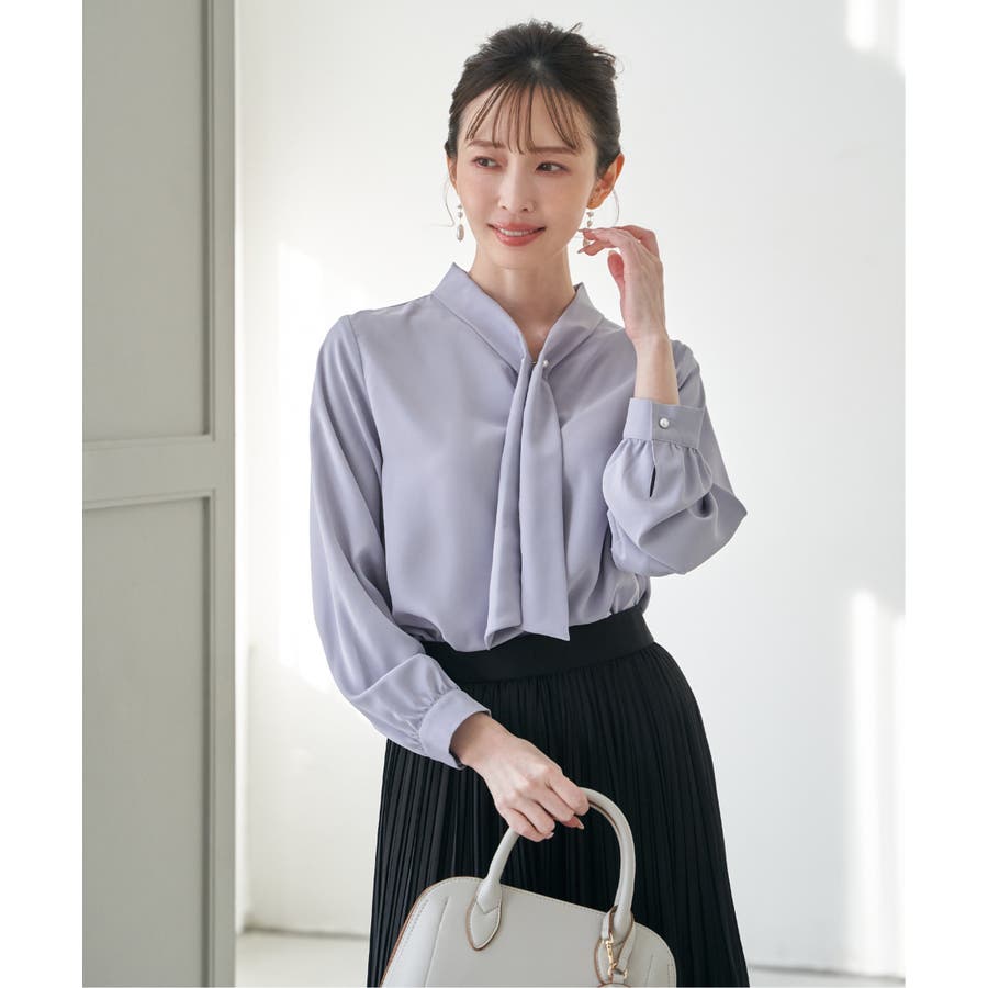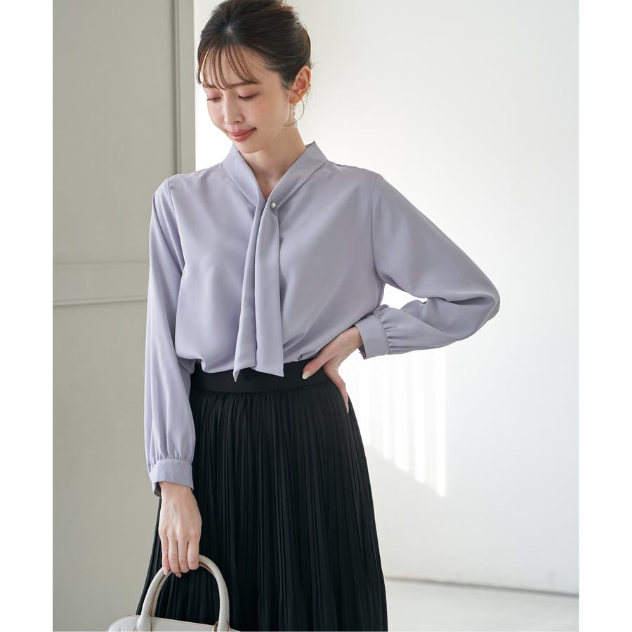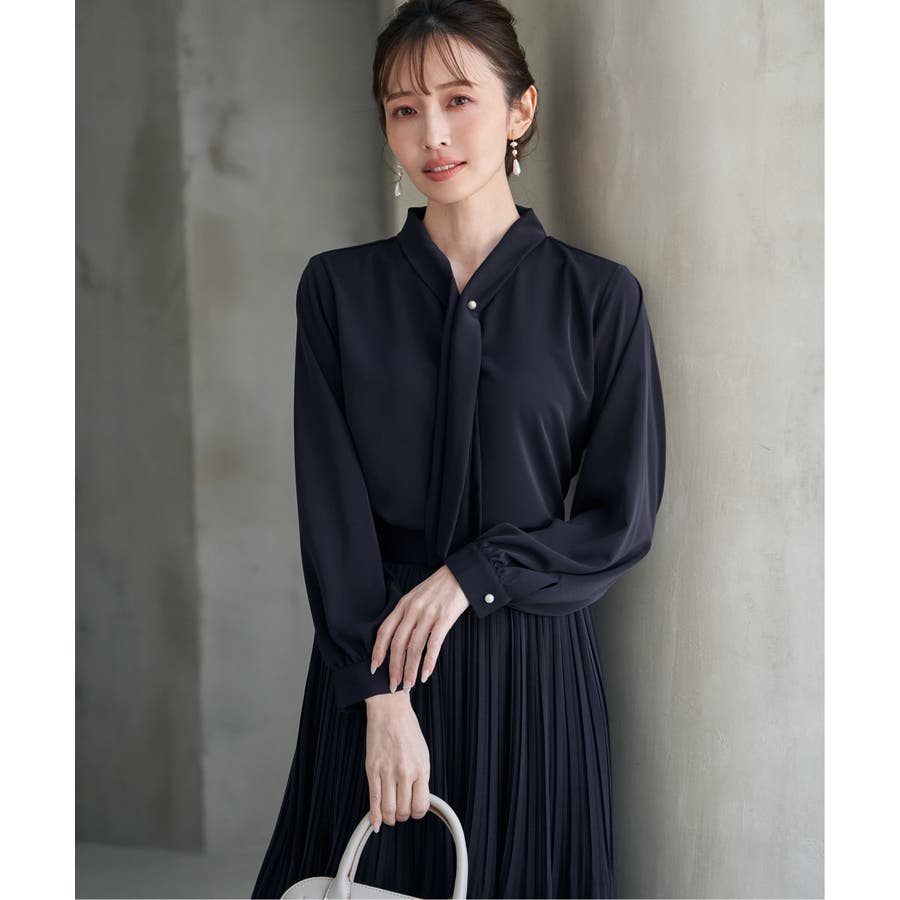 パール付きチャームでボウをとめた、新しいデザインのボウタイブラウス。