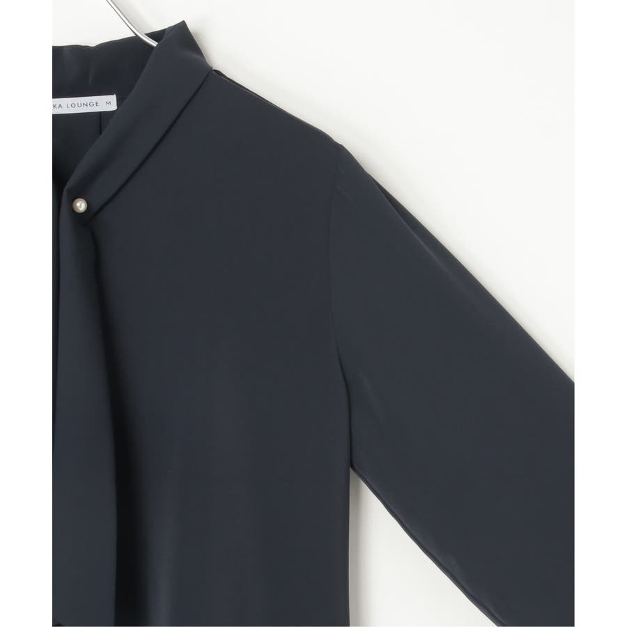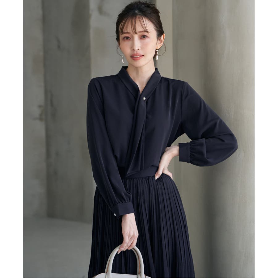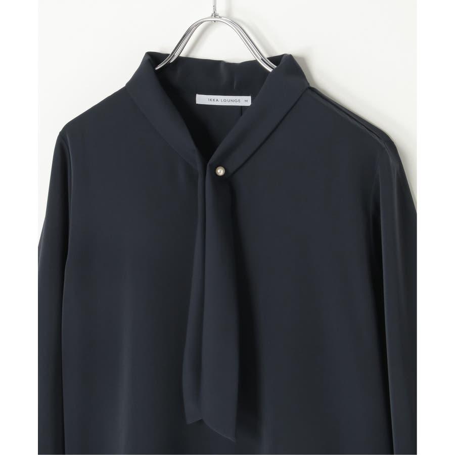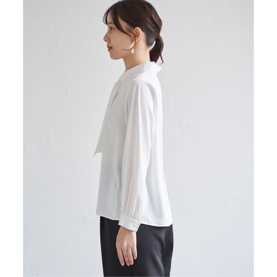 パール付きチャームでボウをとめた、新しいデザインのボウタイブラウス。