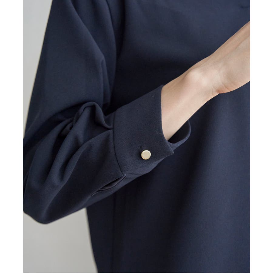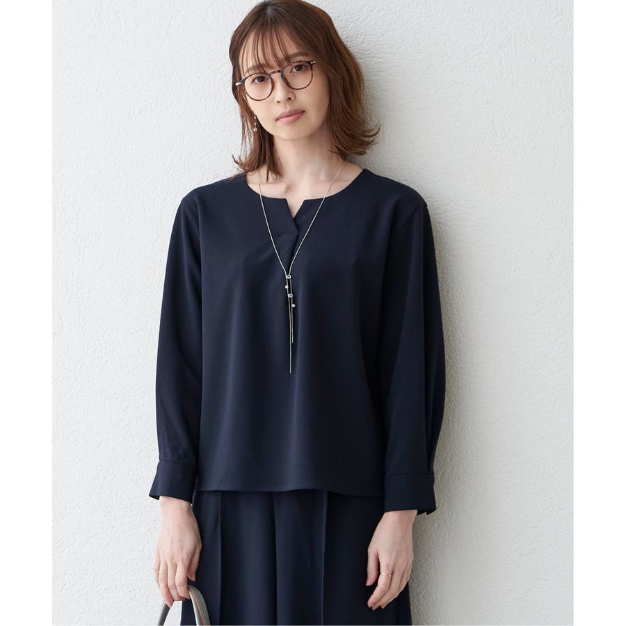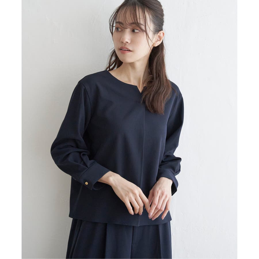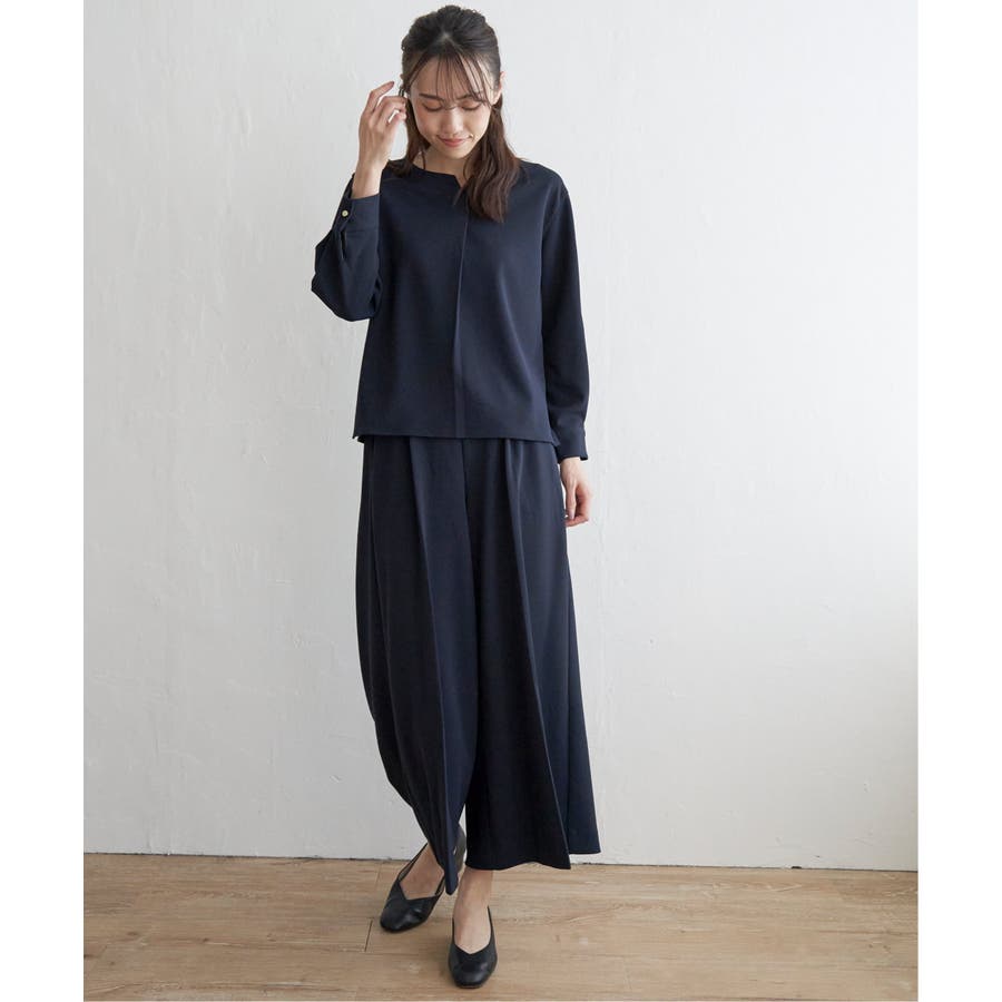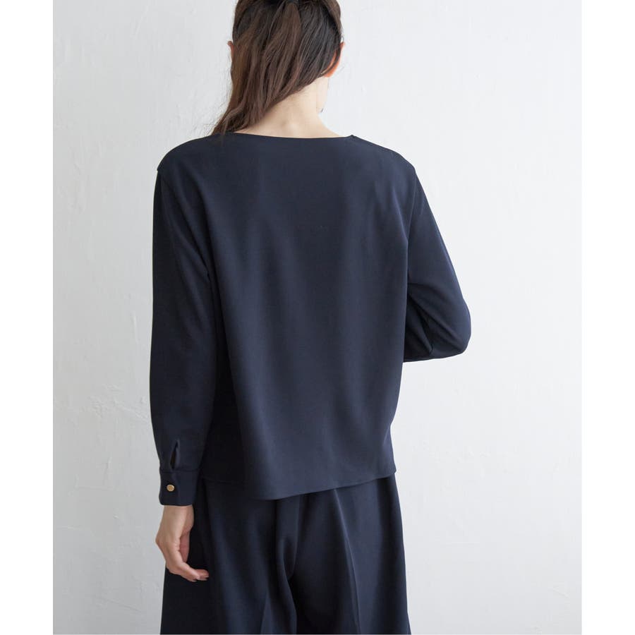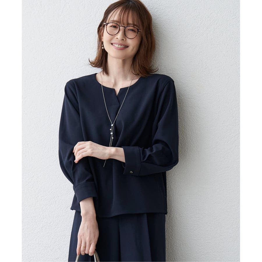 トップスは胸元にポイントがあるので、シンプルなジャケットに合わせやすく、一枚着としても着映え!