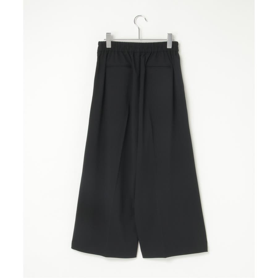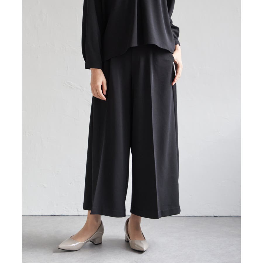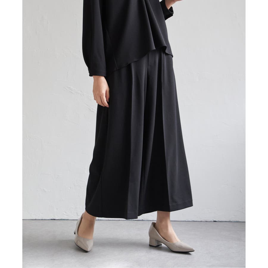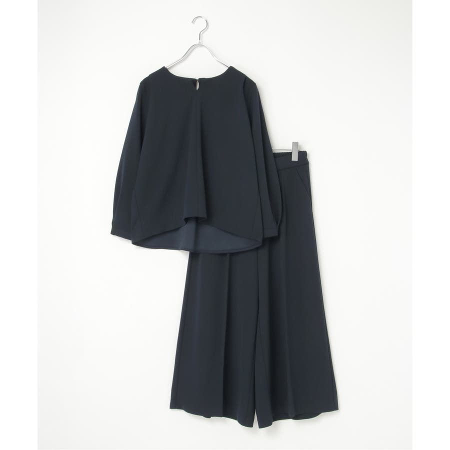 後ろ身頃にタックをふんだんに入れたバックシャントップスとフレアーパンツ。