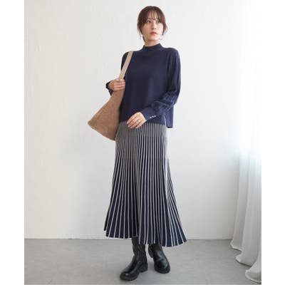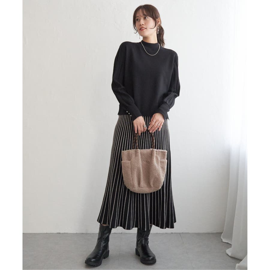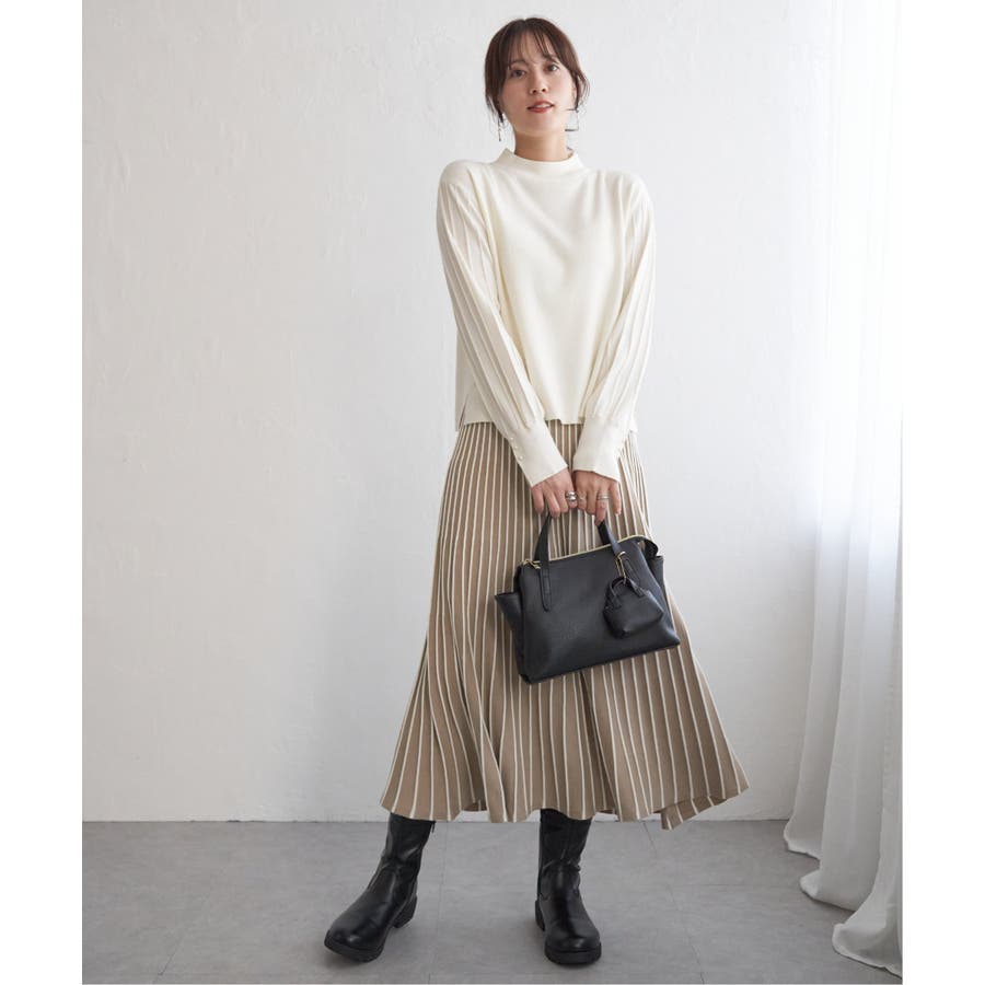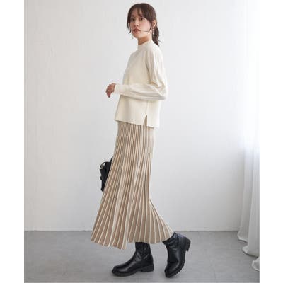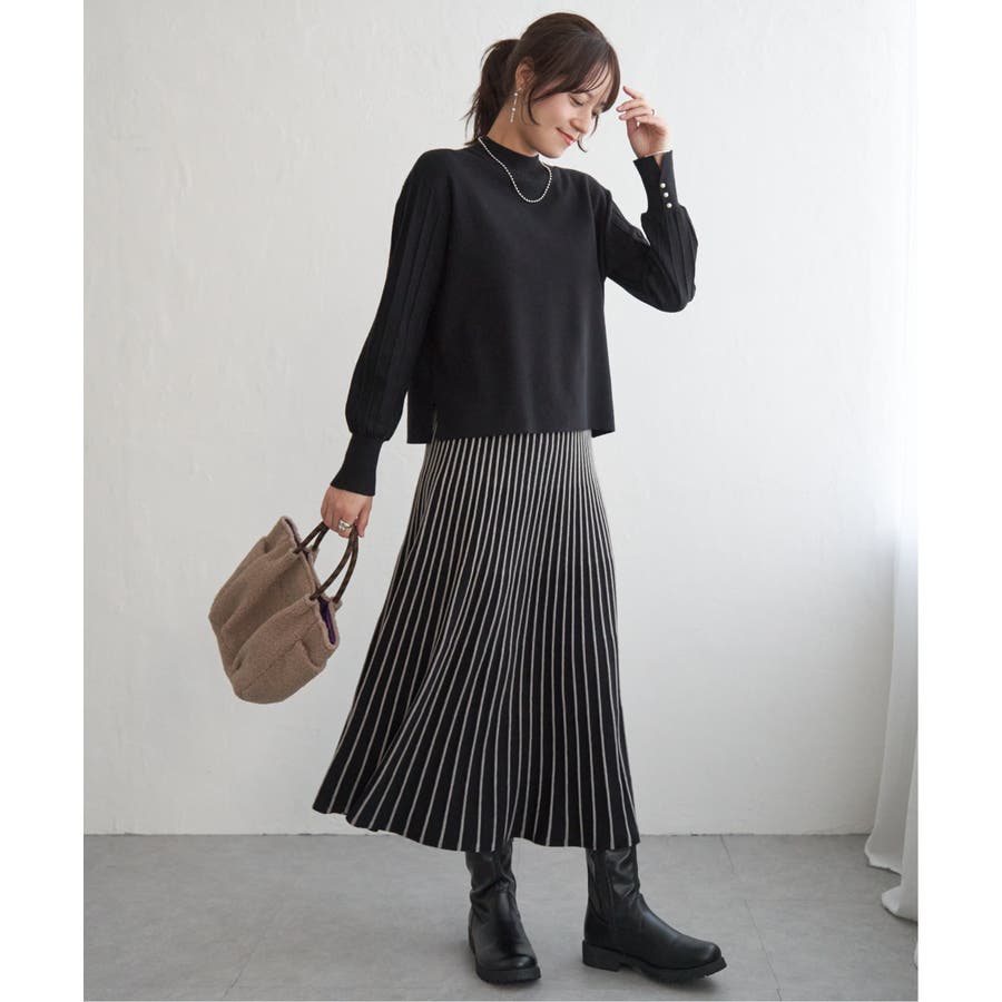 モックネックのトップスとプリーツ風の編地が特徴のフレアスカートのセットアップ。