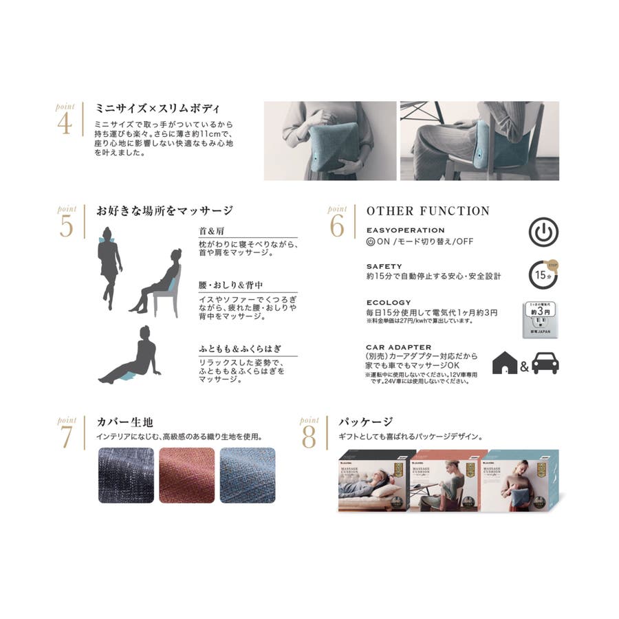 首・肩・腰・おしり・背中・ふともも・ふくらはぎなど、こった部分にあてるだけ。