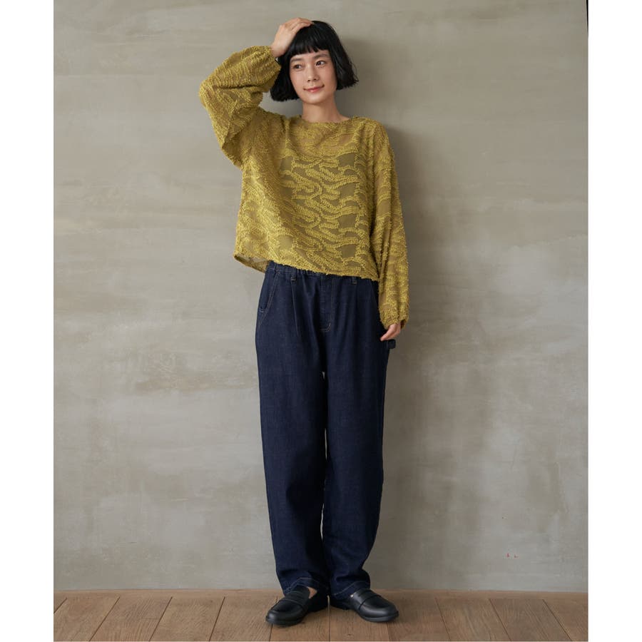 透け感のある軽やかな素材に、波のような模様が浮かぶカットジャカードをあしらったブラウス。