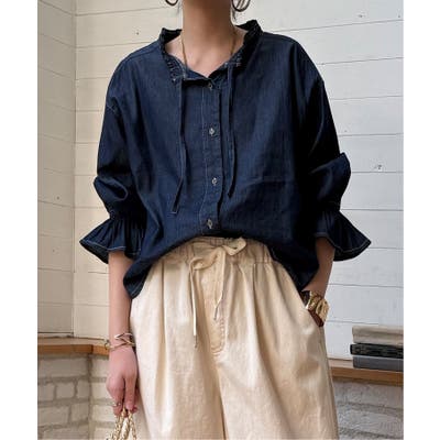 カジュアルなデニムをレディーライクに着られるフリルブラウス。