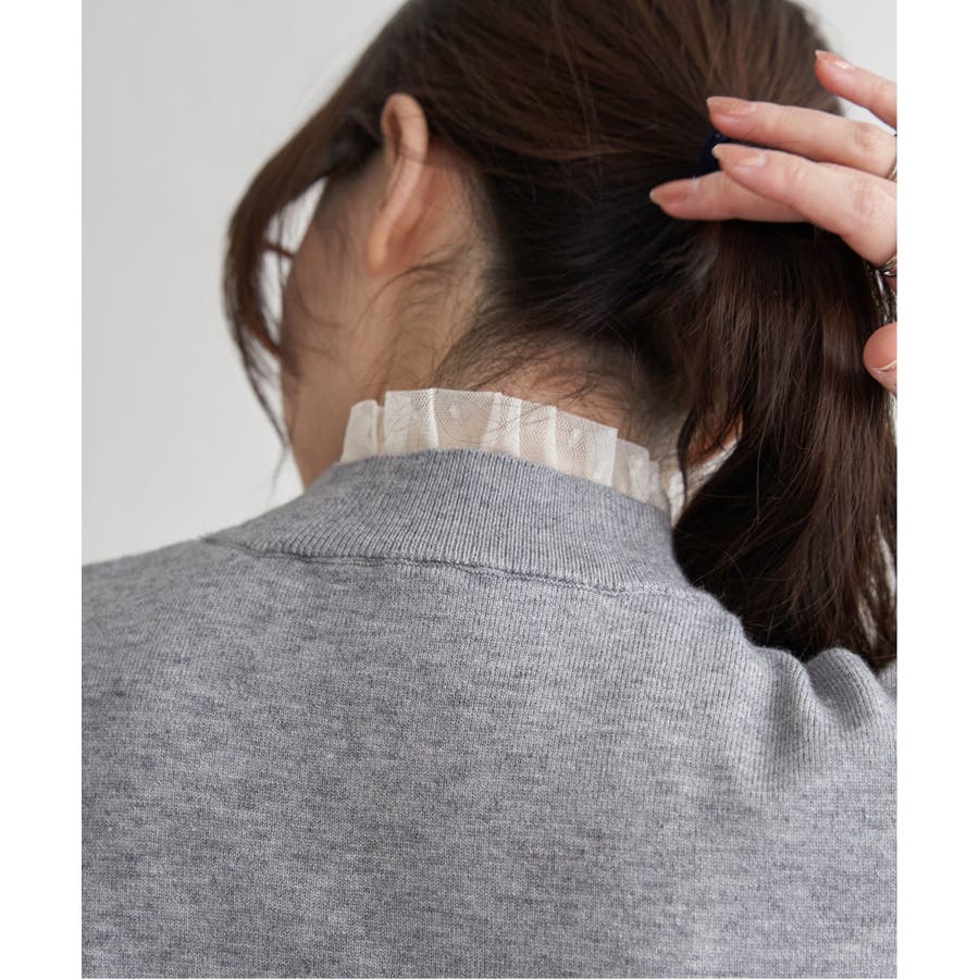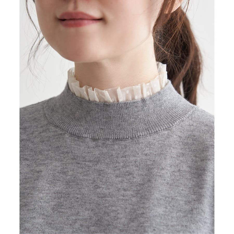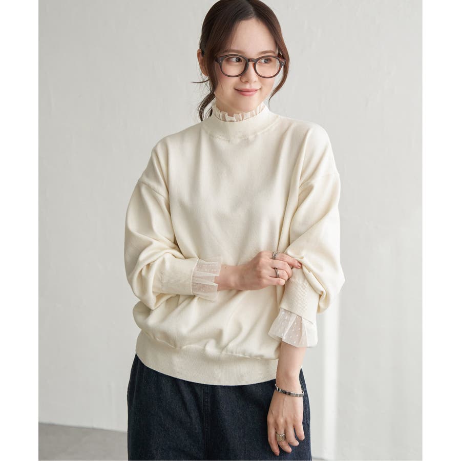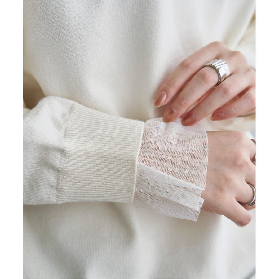 トレンドのチュール素材を襟と袖に使用したデザインニット。