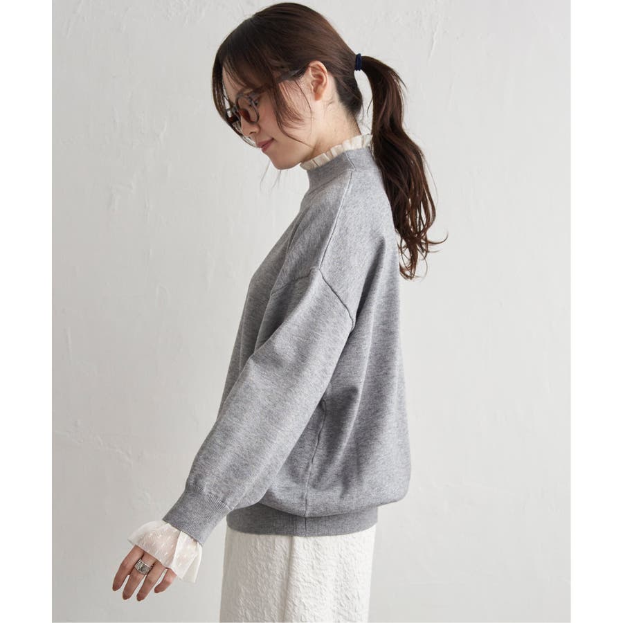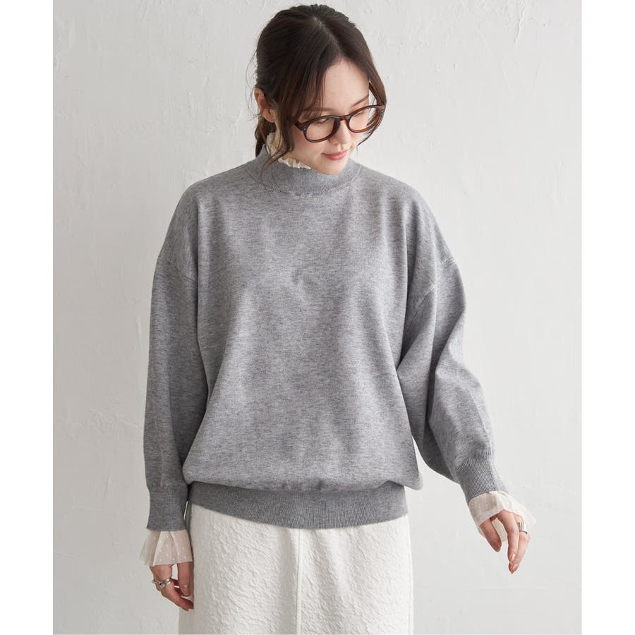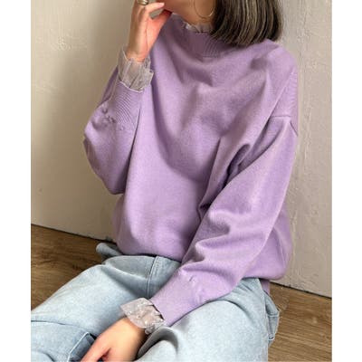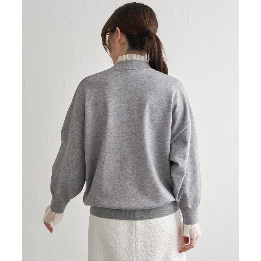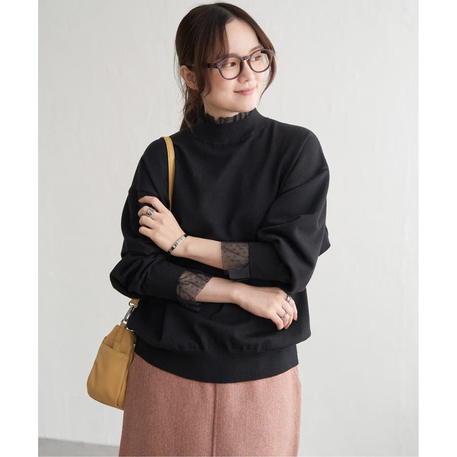 トレンドのチュール素材を襟と袖に使用したデザインニット。