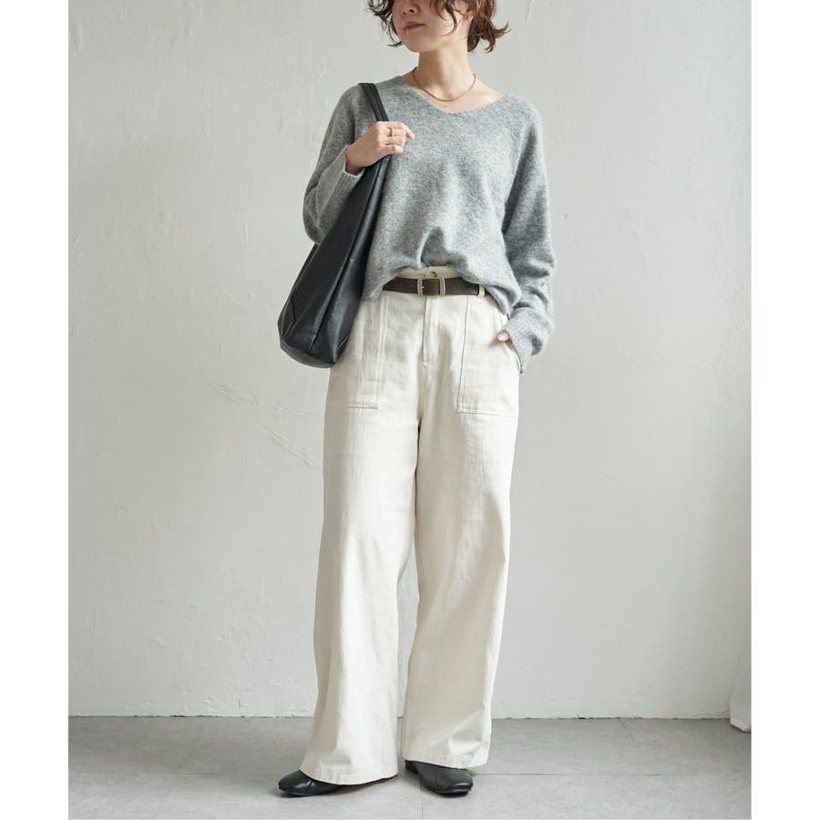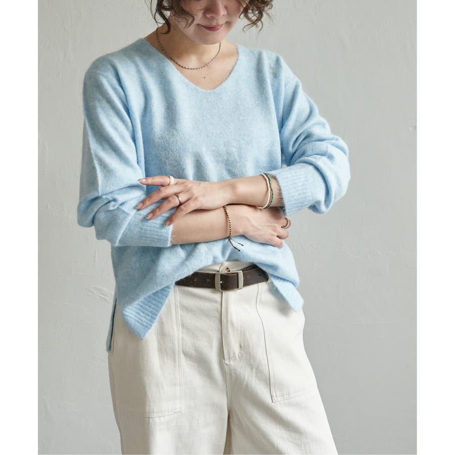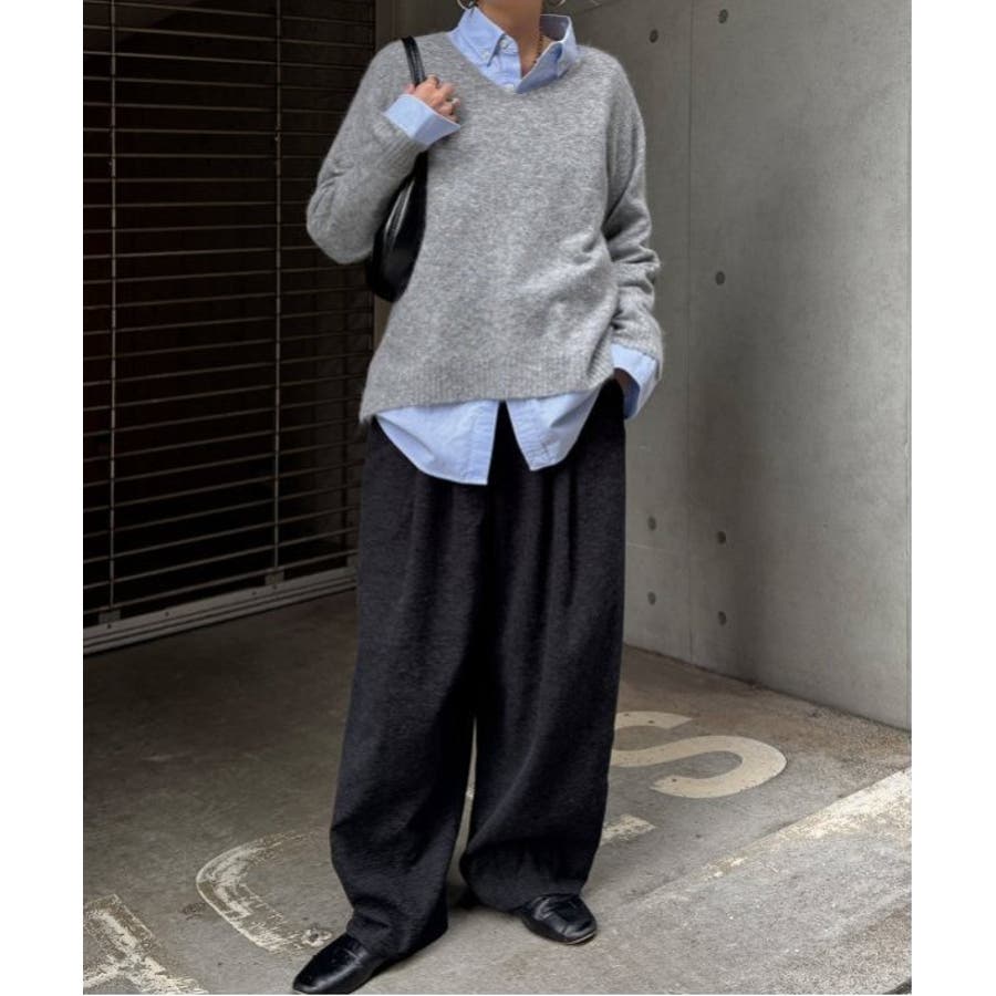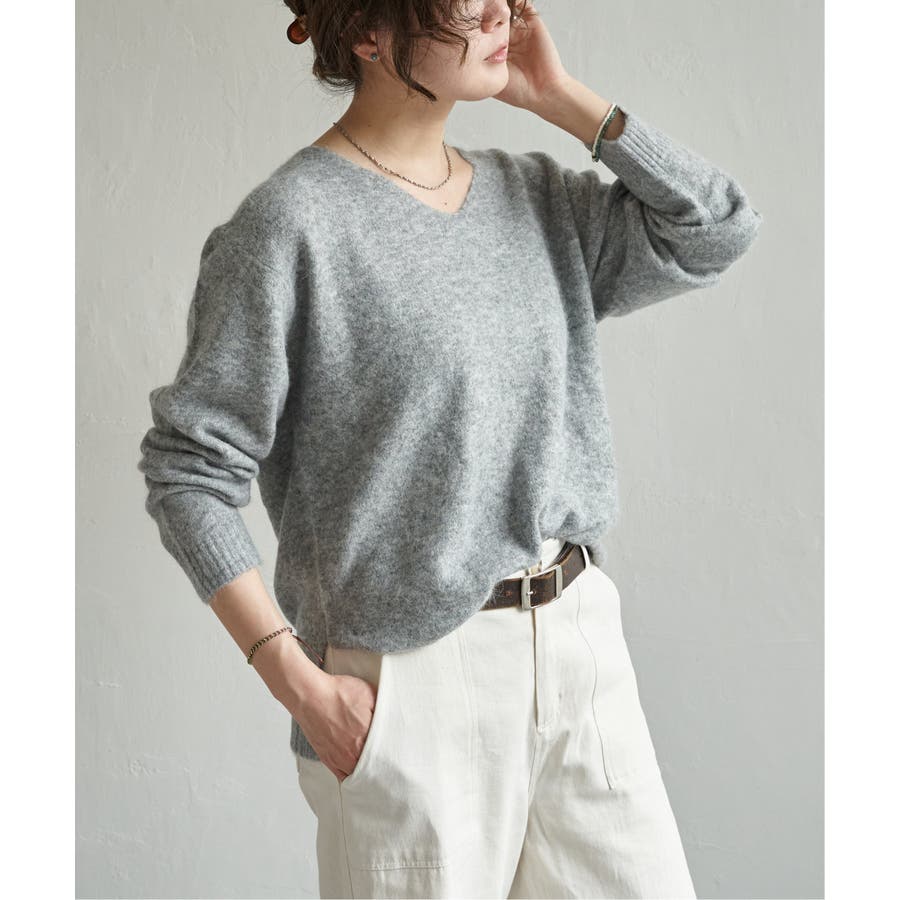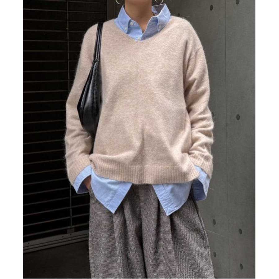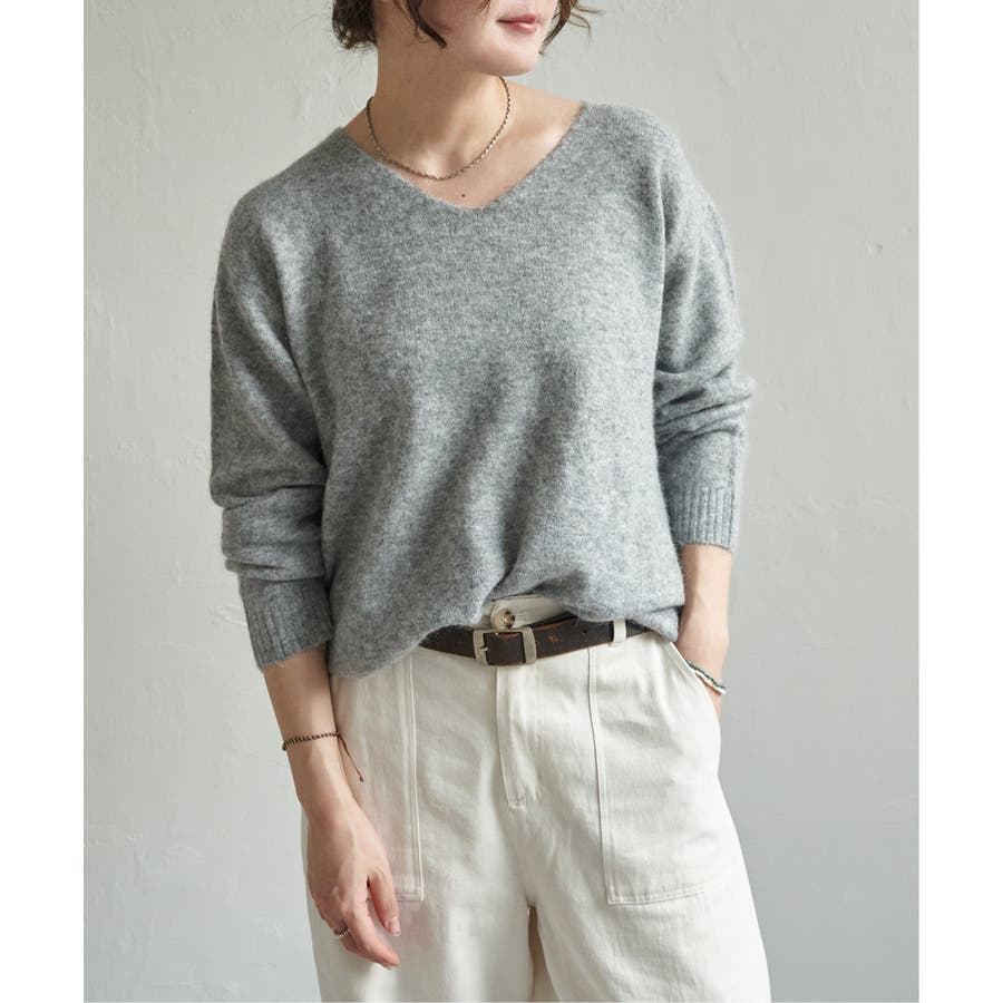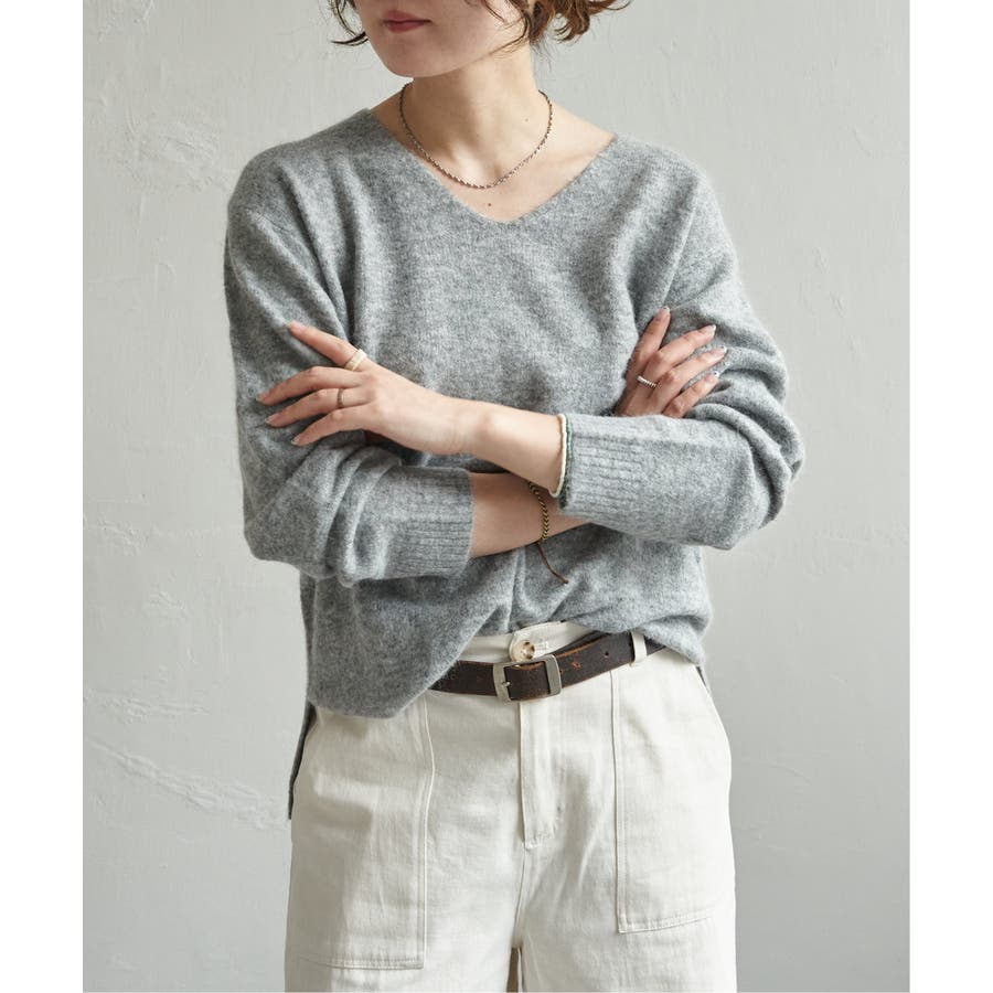 深すぎないVネックが顔まわりをすっきり見せ、インナーを選ばず着まわせる万能な一着です。