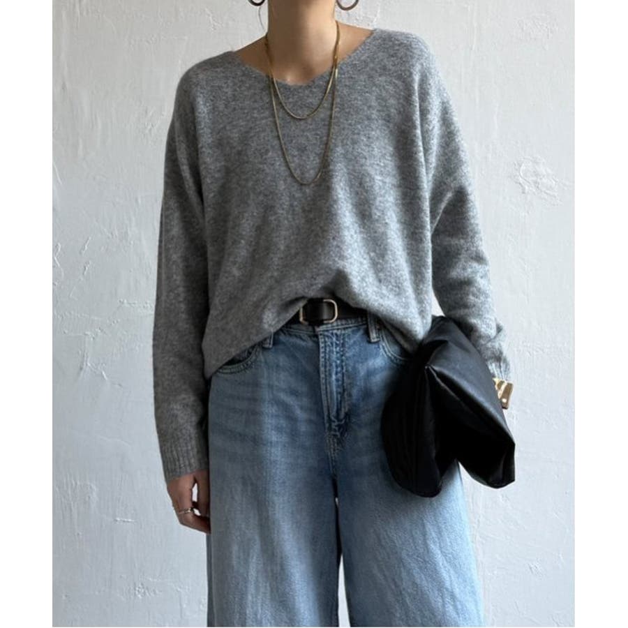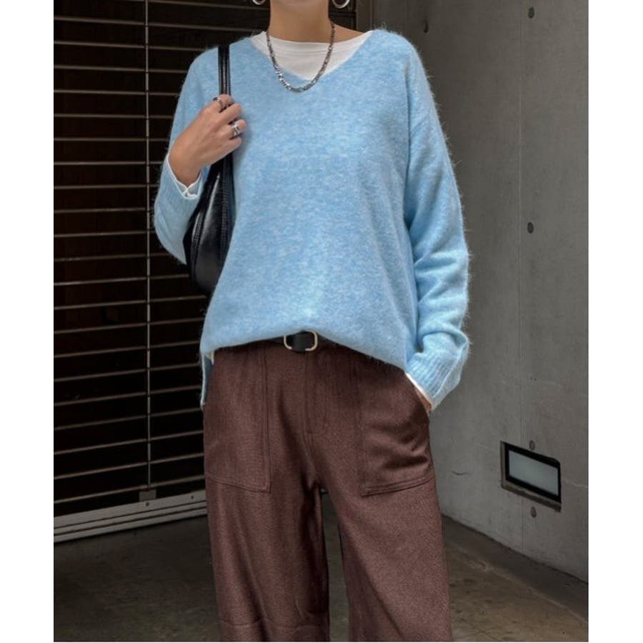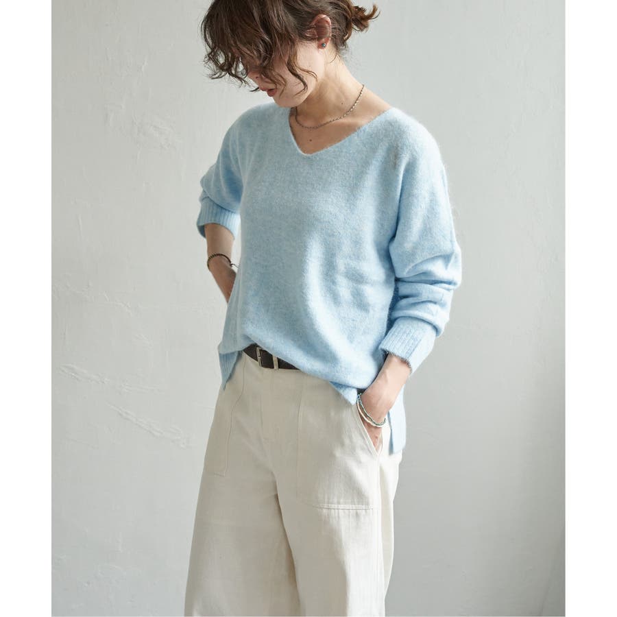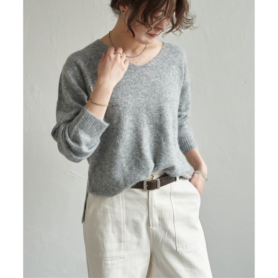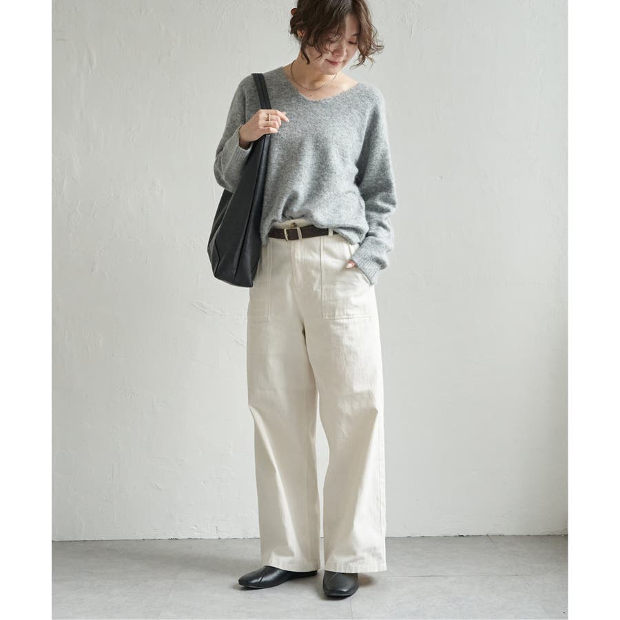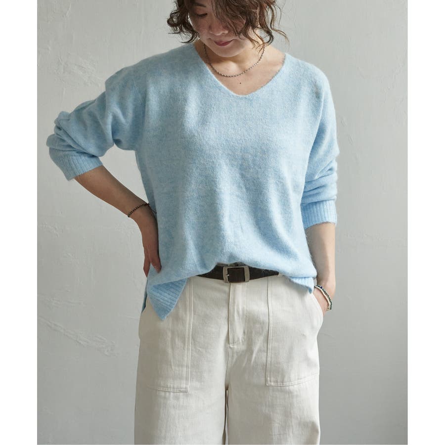 深すぎないVネックが顔まわりをすっきり見せ、インナーを選ばず着まわせる万能な一着です。