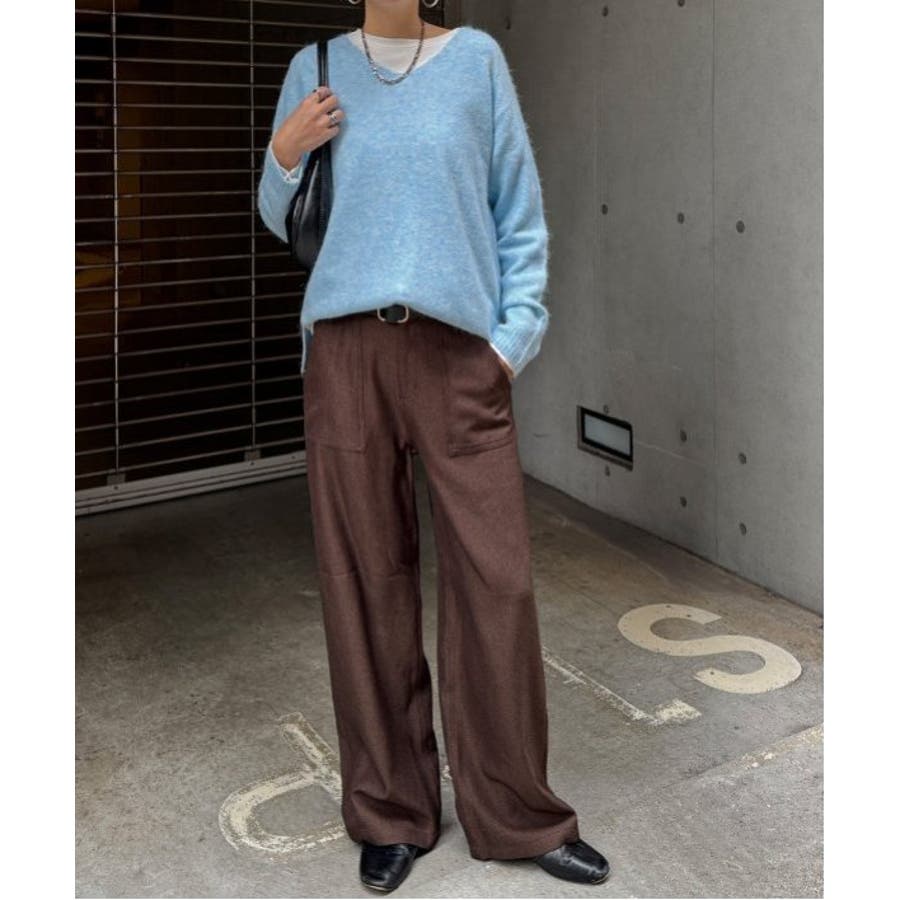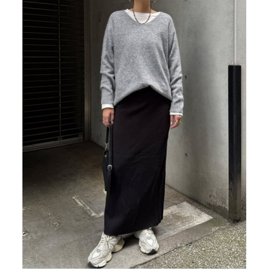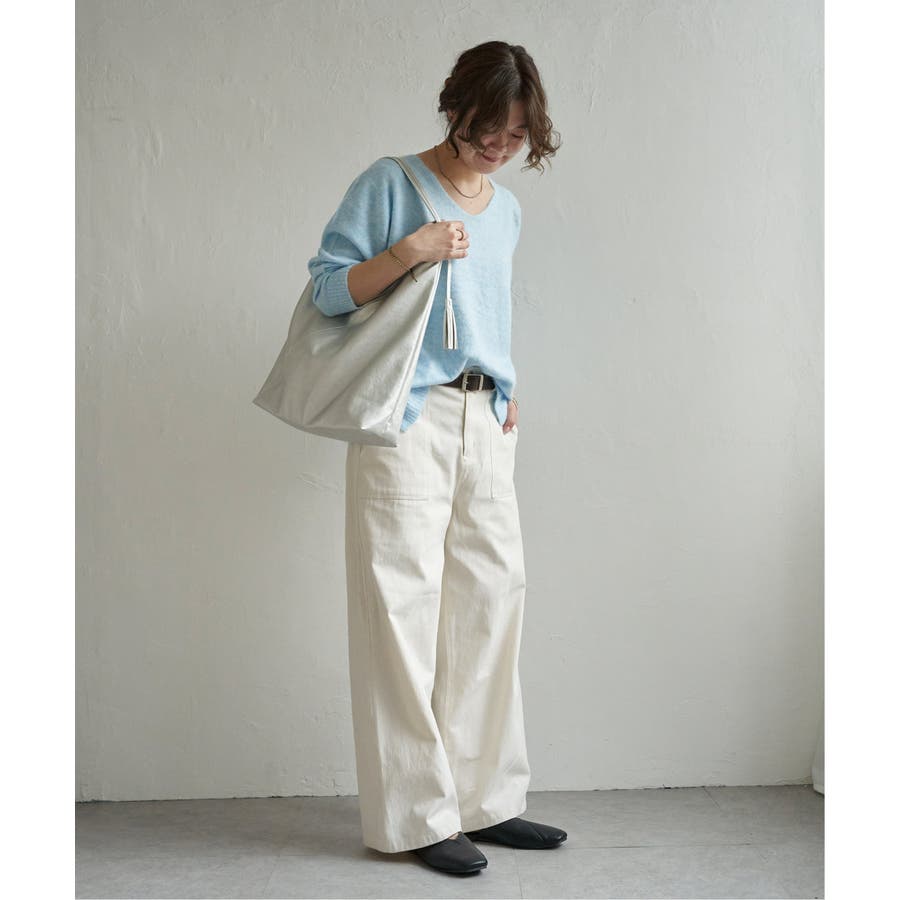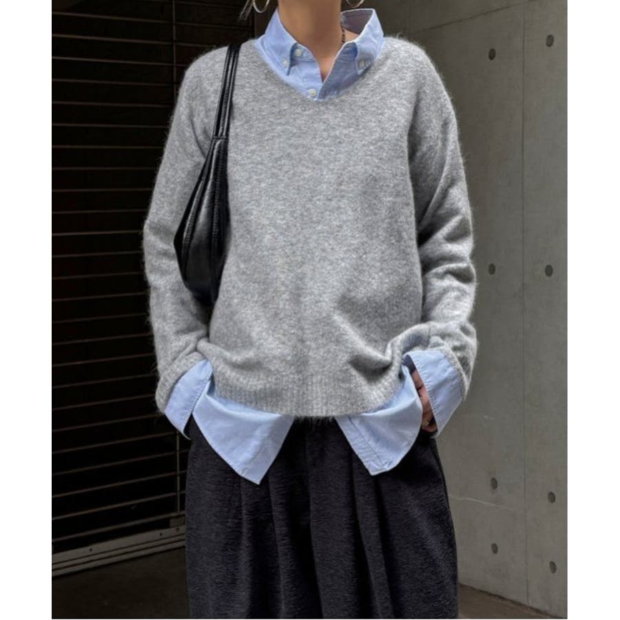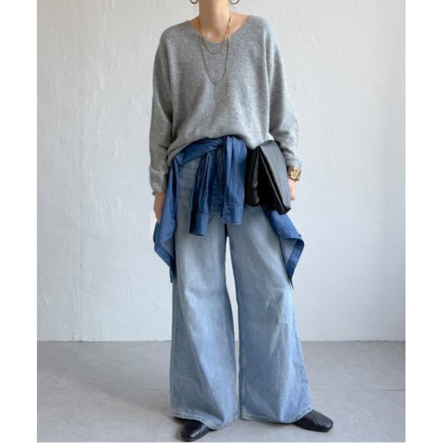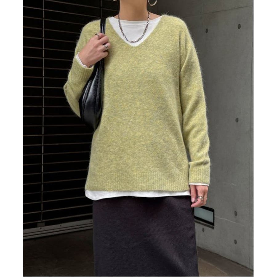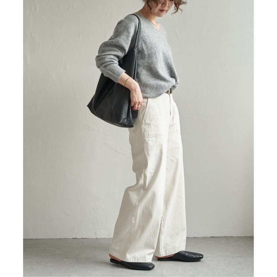 深すぎないVネックが顔まわりをすっきり見せ、インナーを選ばず着まわせる万能な一着です。