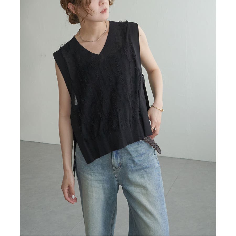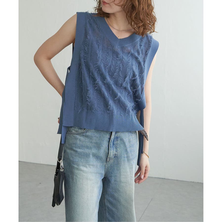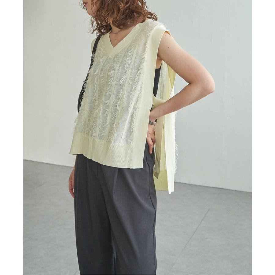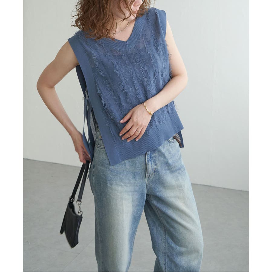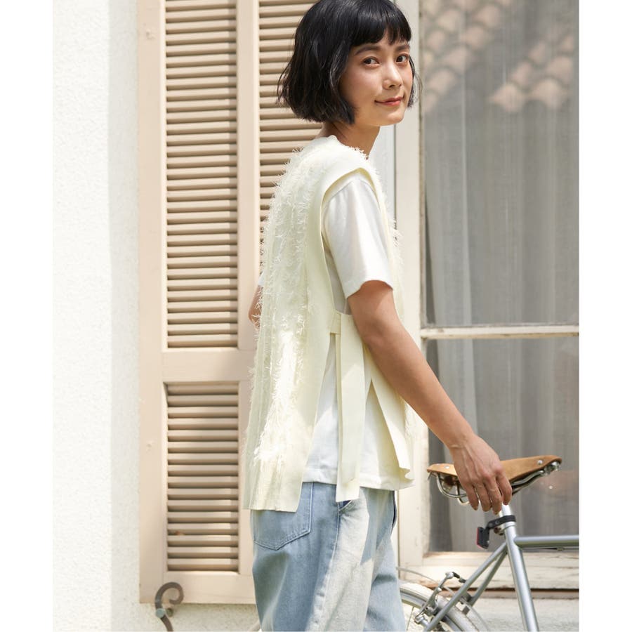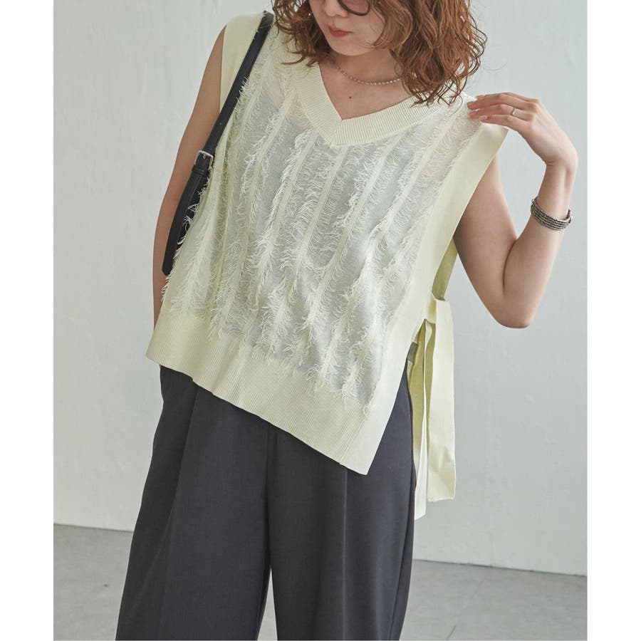 繊細な透け感が魅力のシアーニットに、さりげないフリンジ使いで表情を添えたフリンジシアーサイドリボンベスト。
