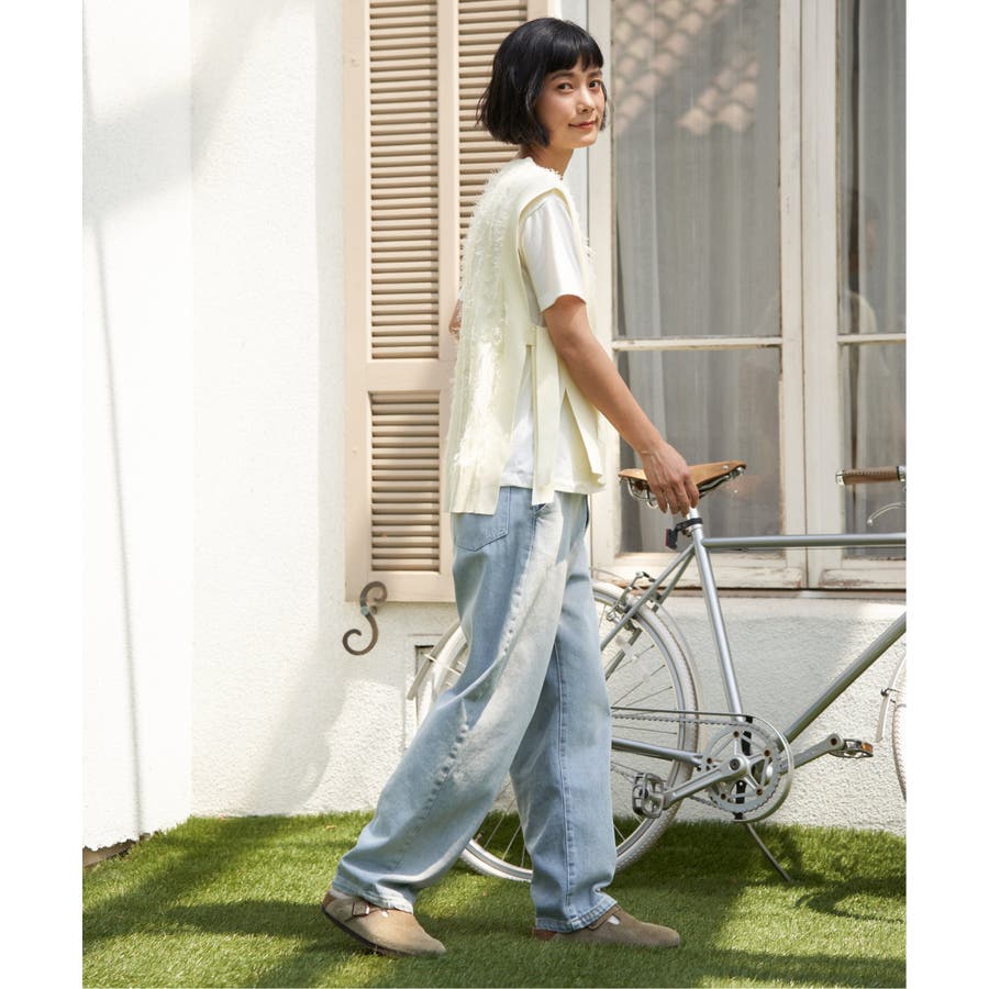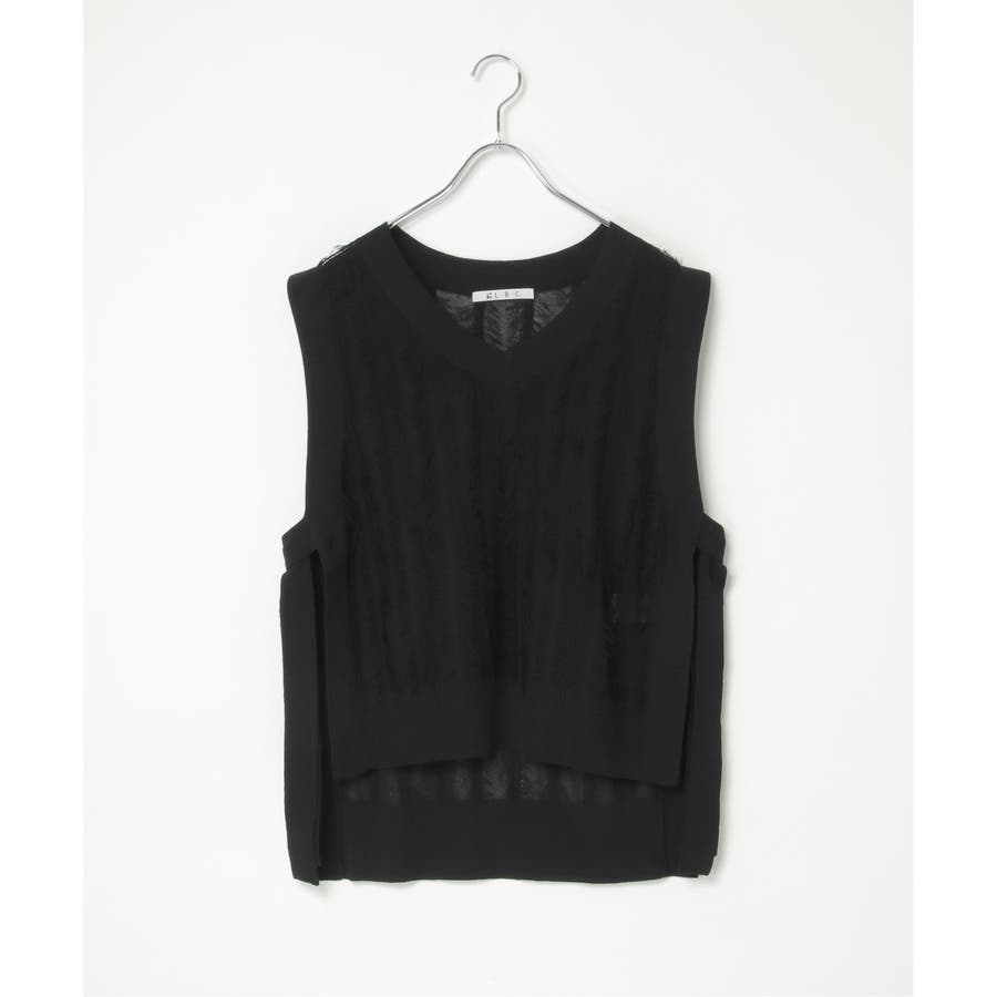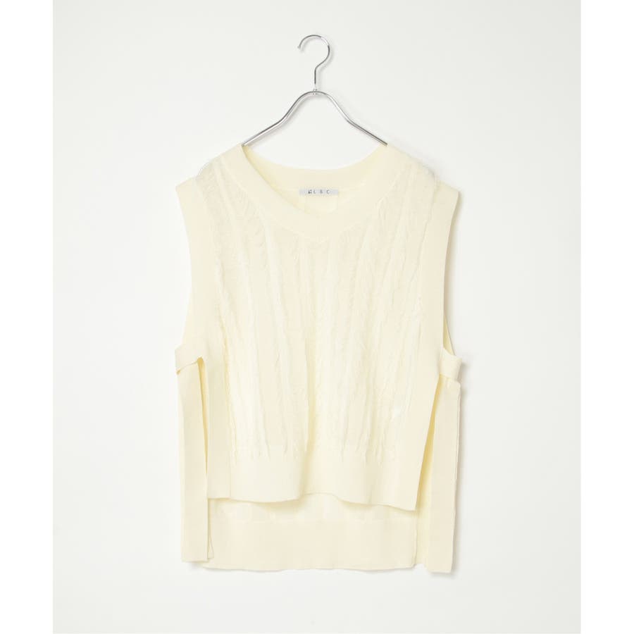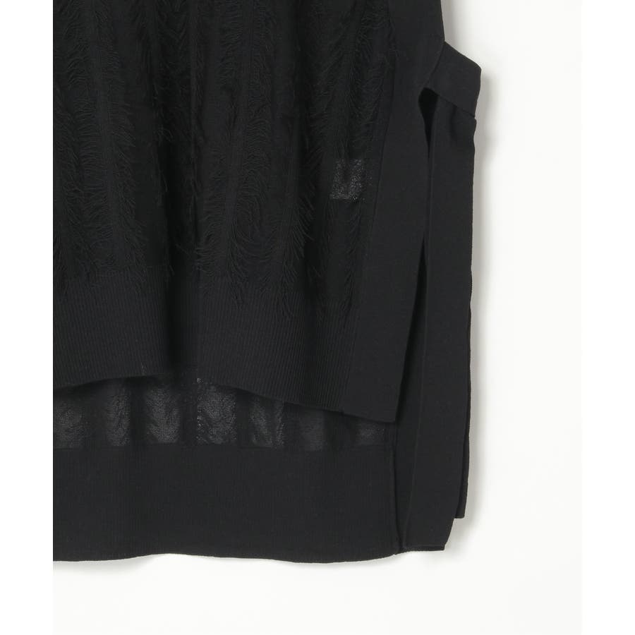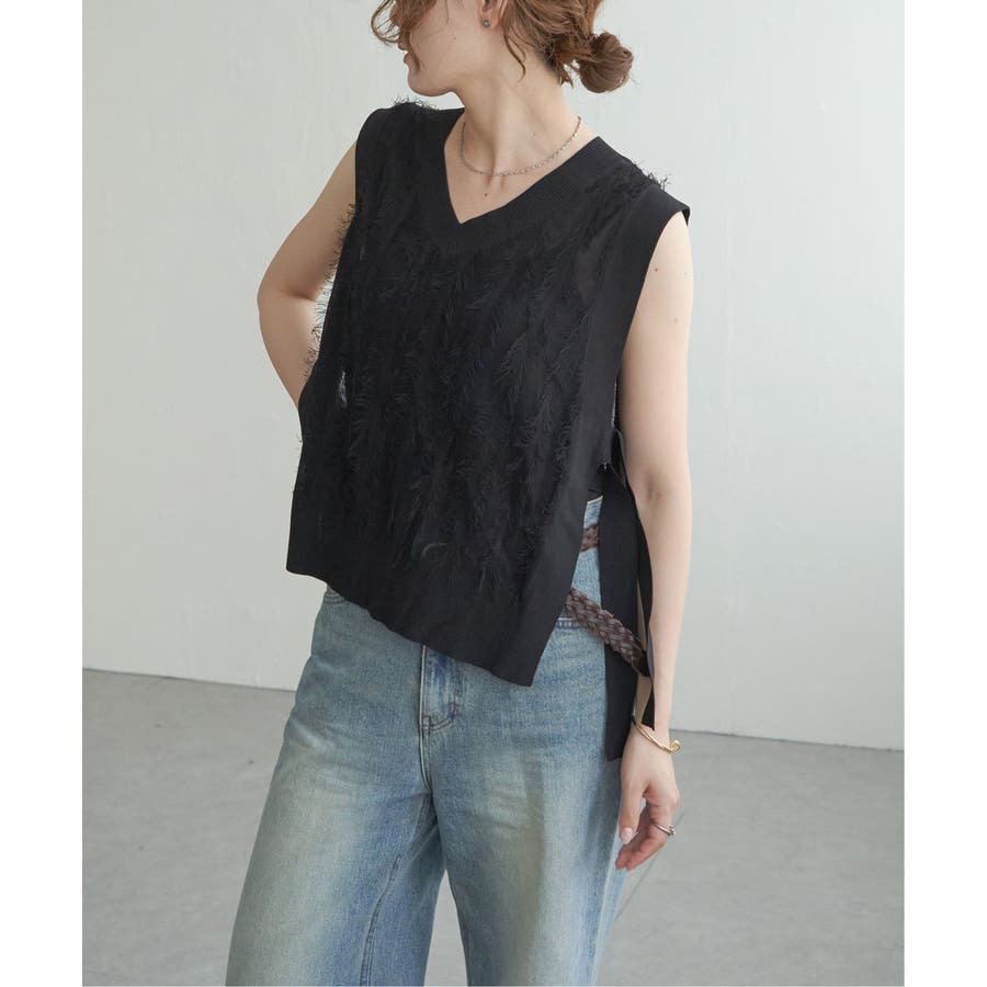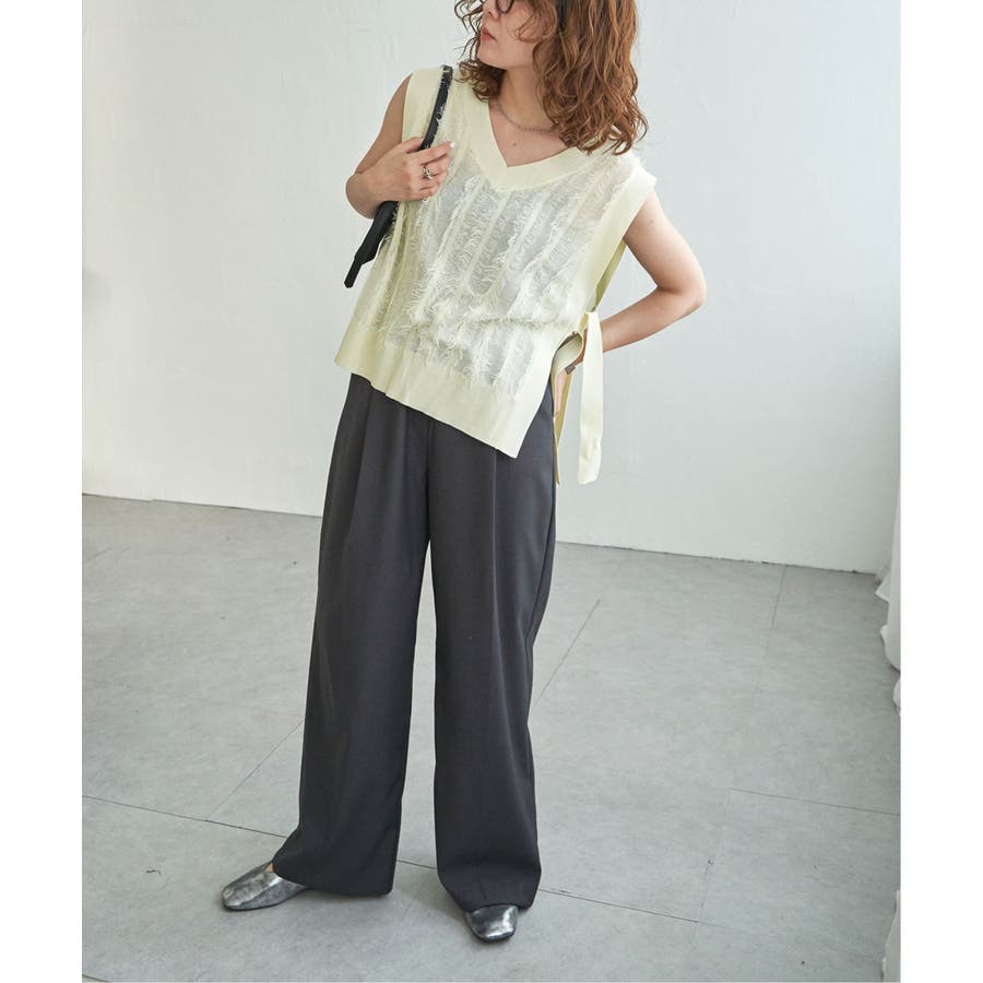 繊細な透け感が魅力のシアーニットに、さりげないフリンジ使いで表情を添えたフリンジシアーサイドリボンベスト。