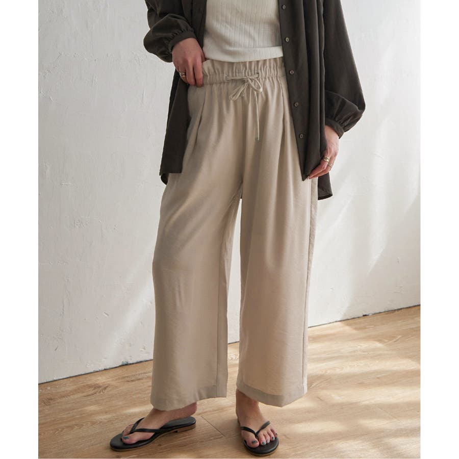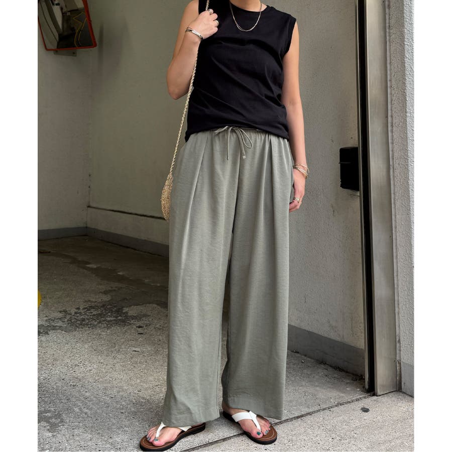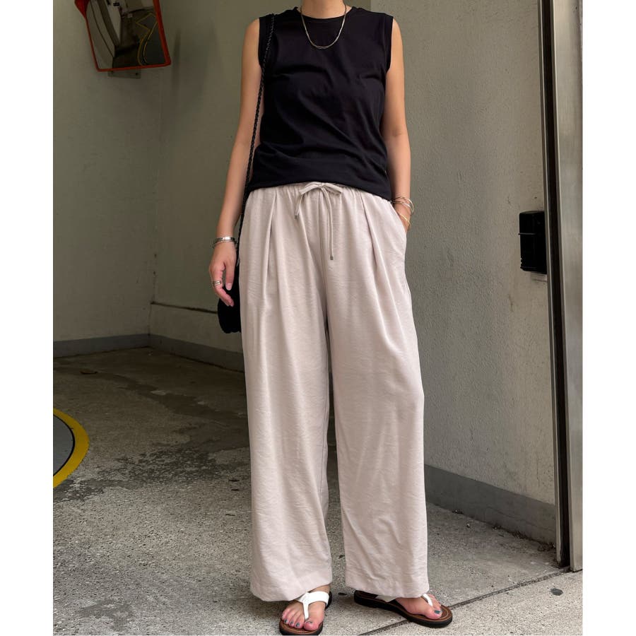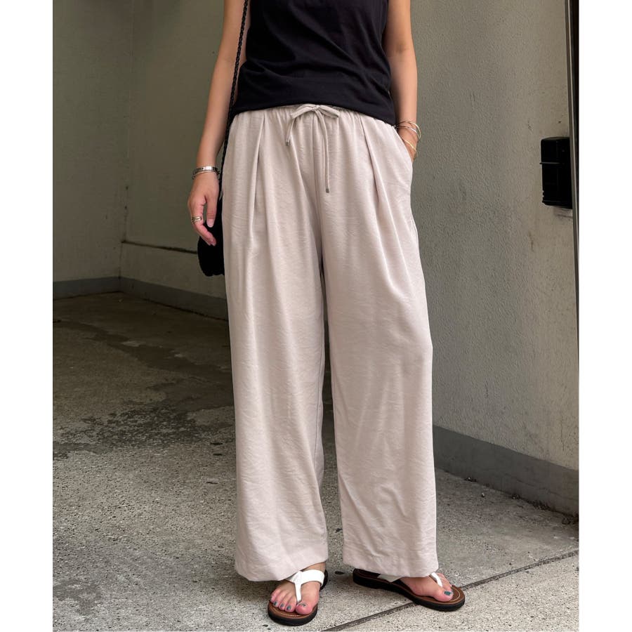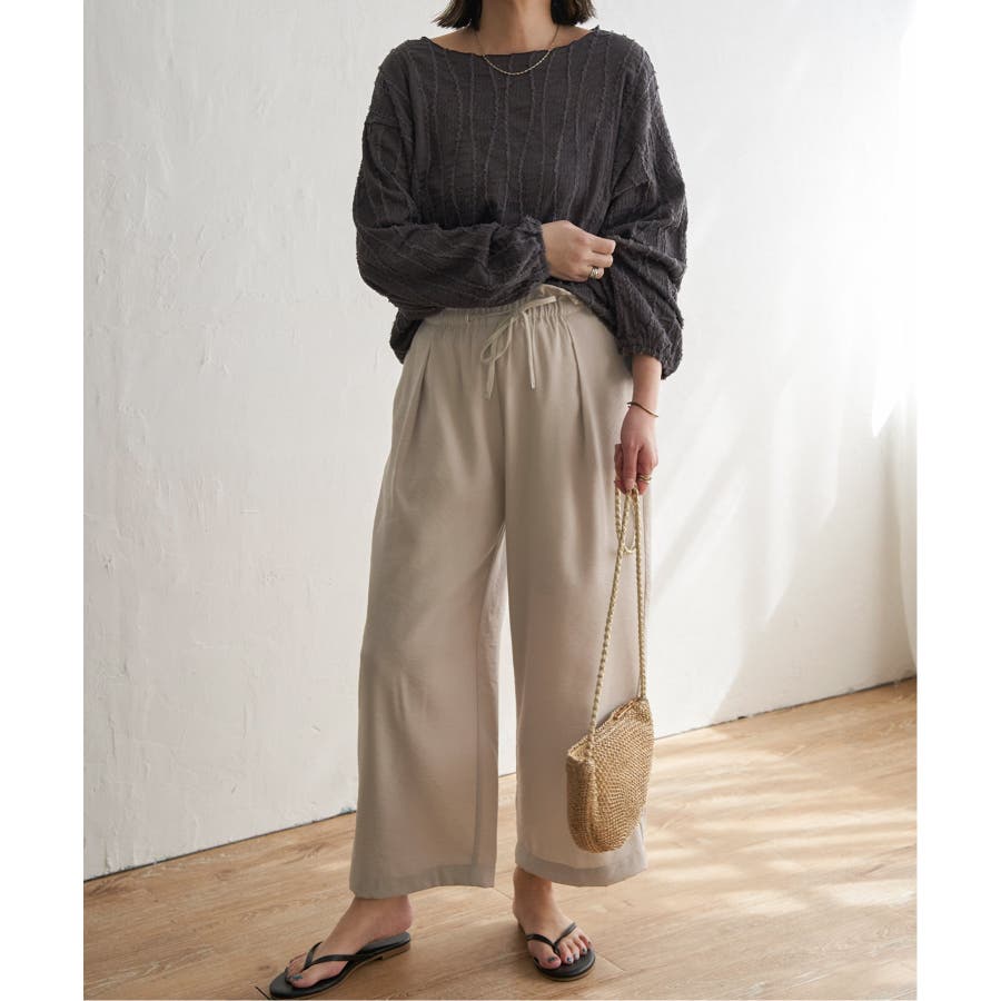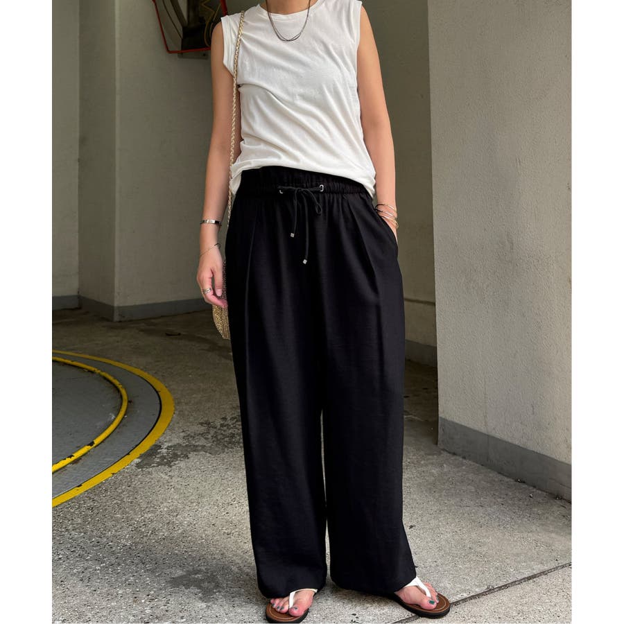 トップスインもサマになる、ウエストシャーリングデザインのワイドパンツ。