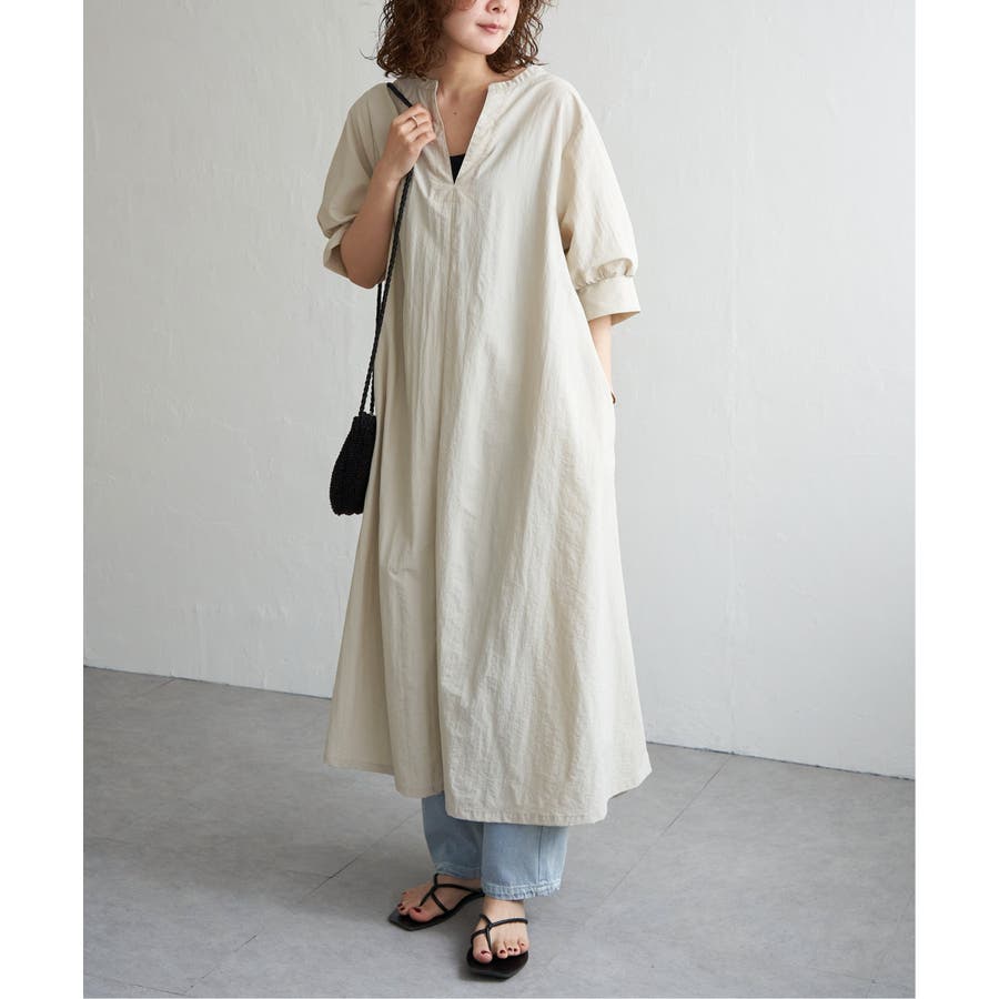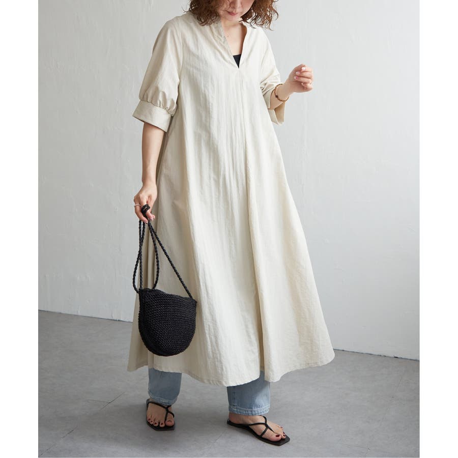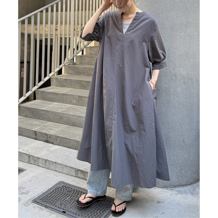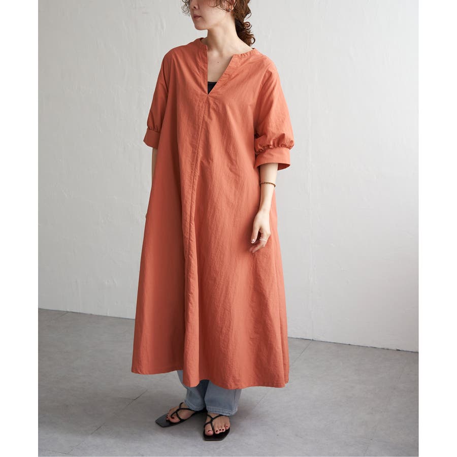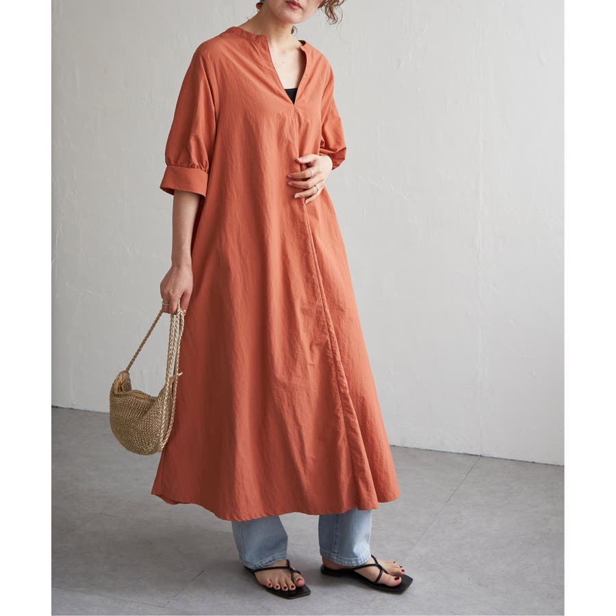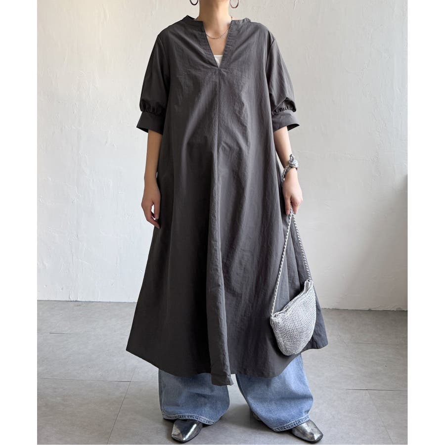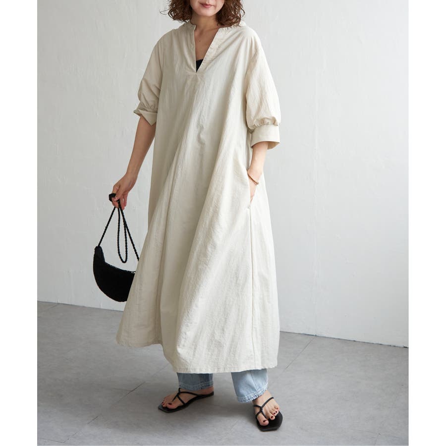 軽やかなナイロン素材が魅力のスキッパーロングワンピース。