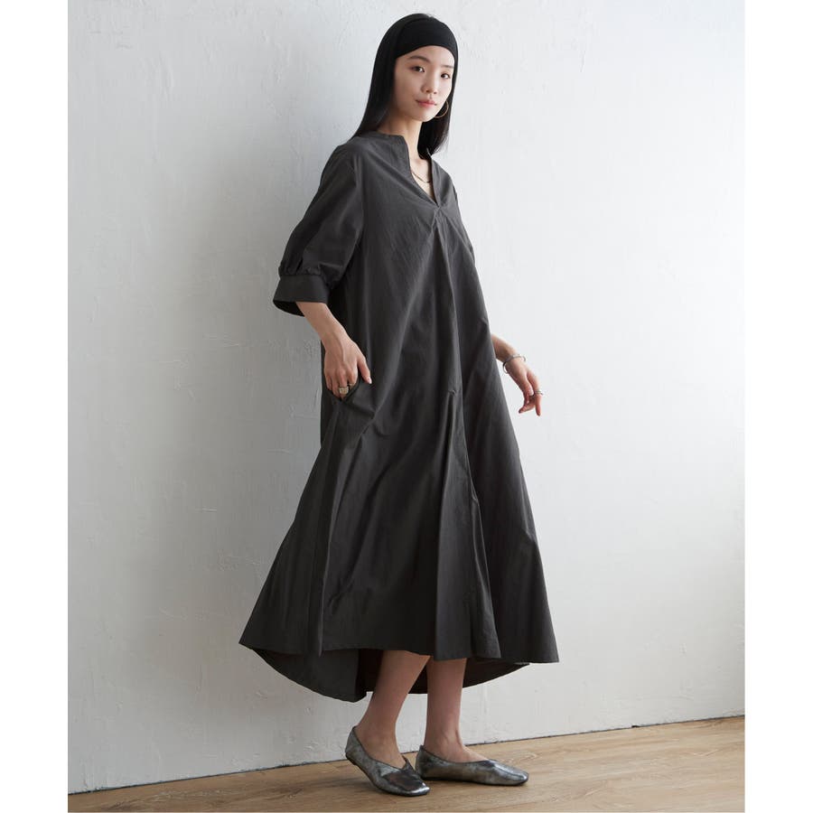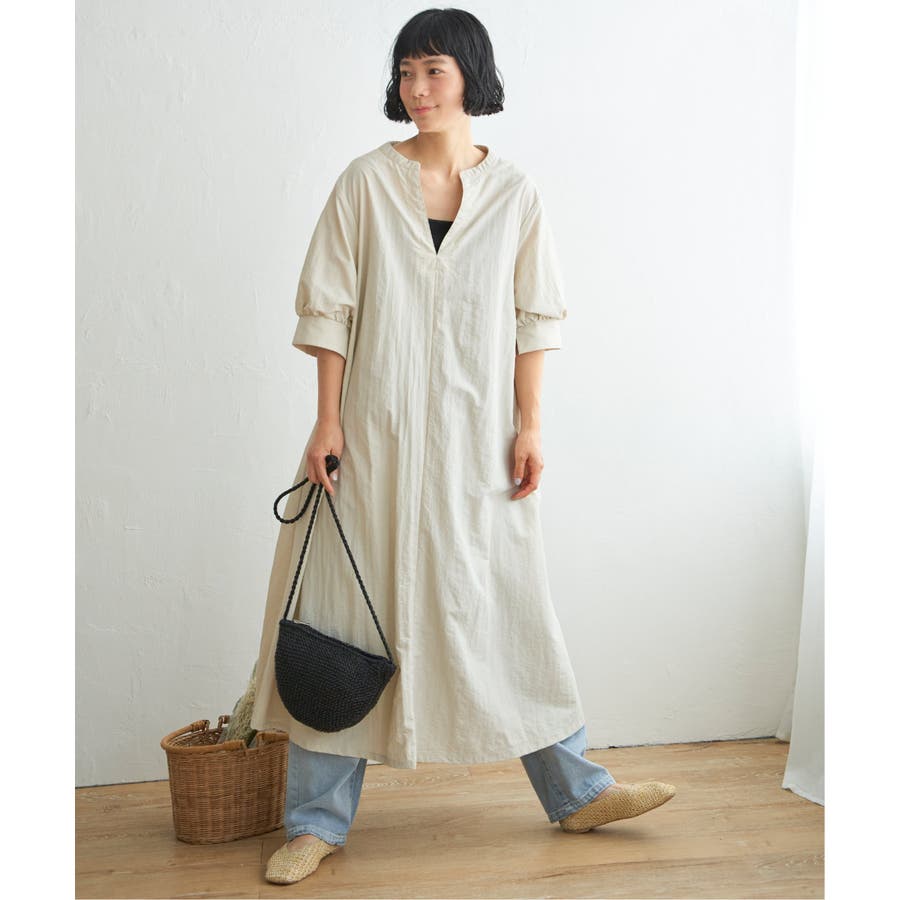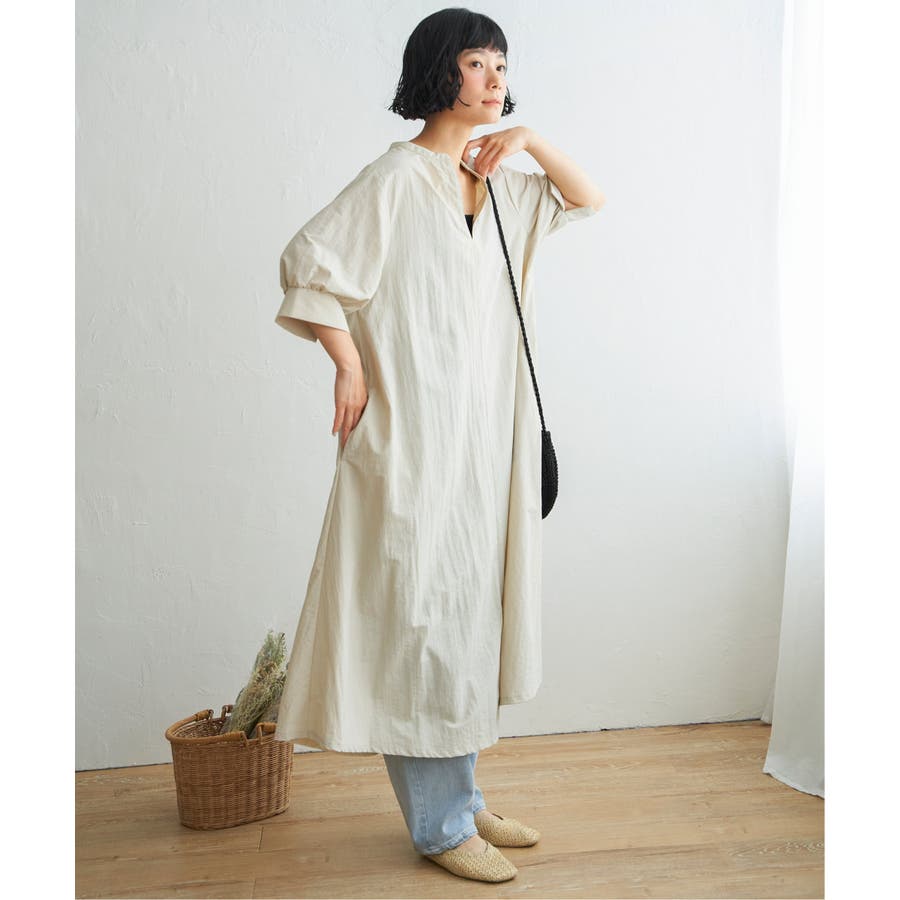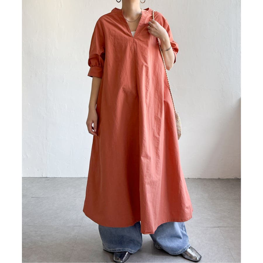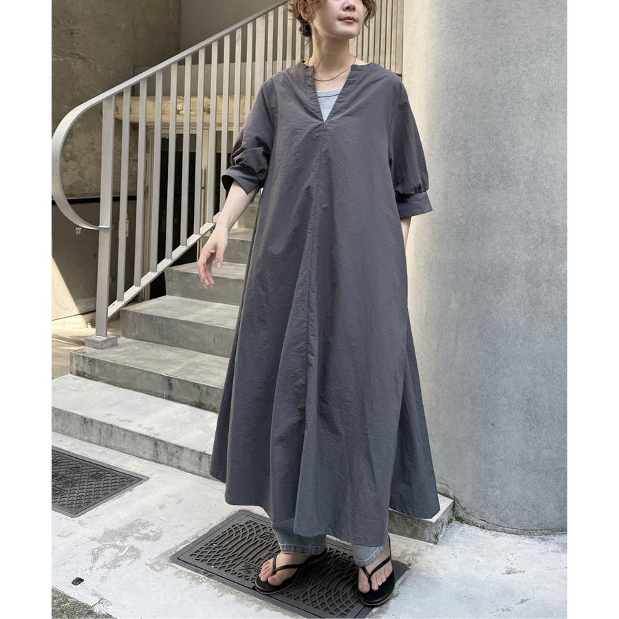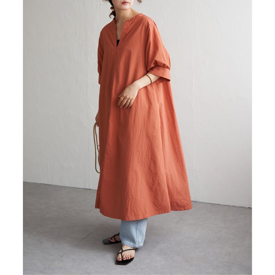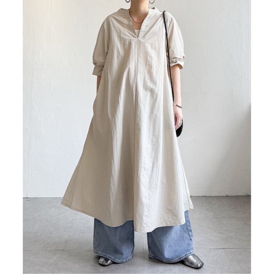 軽やかなナイロン素材が魅力のスキッパーロングワンピース。