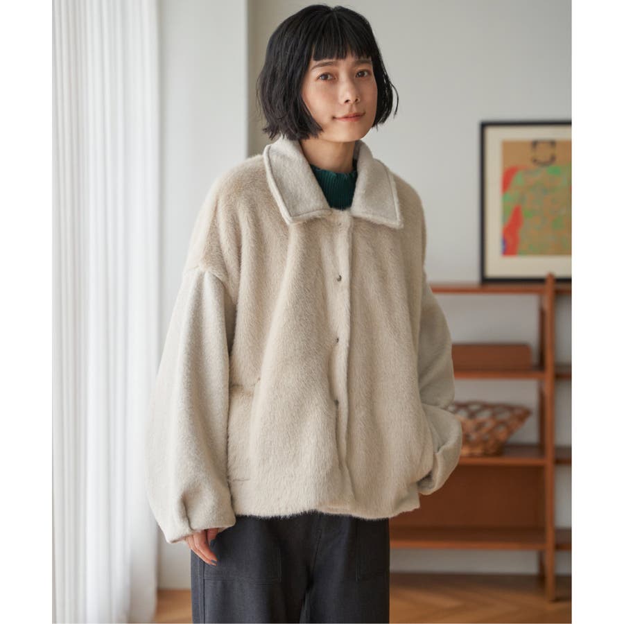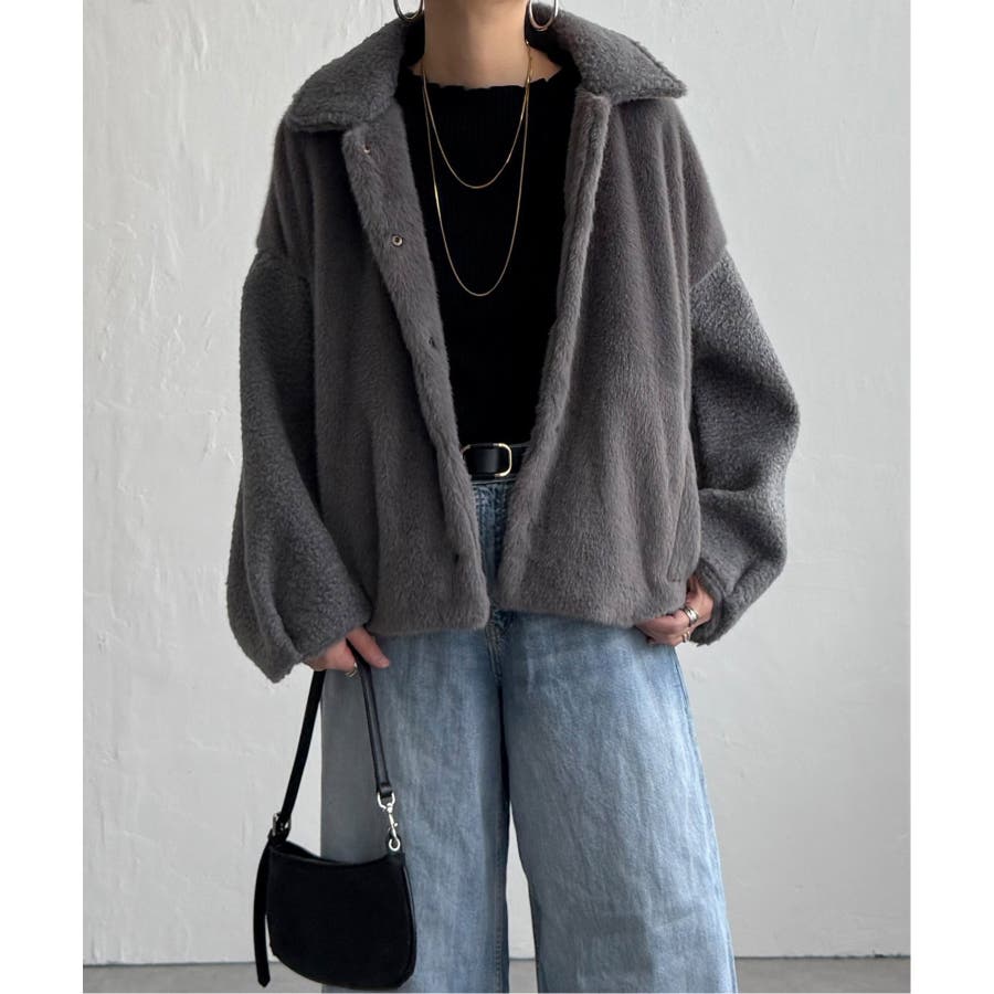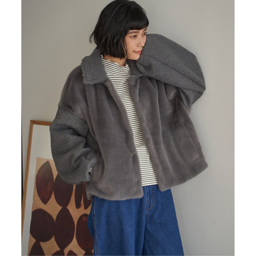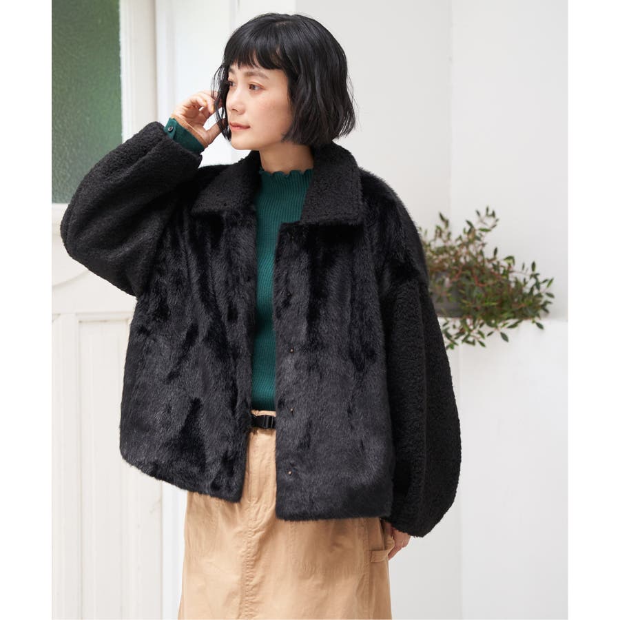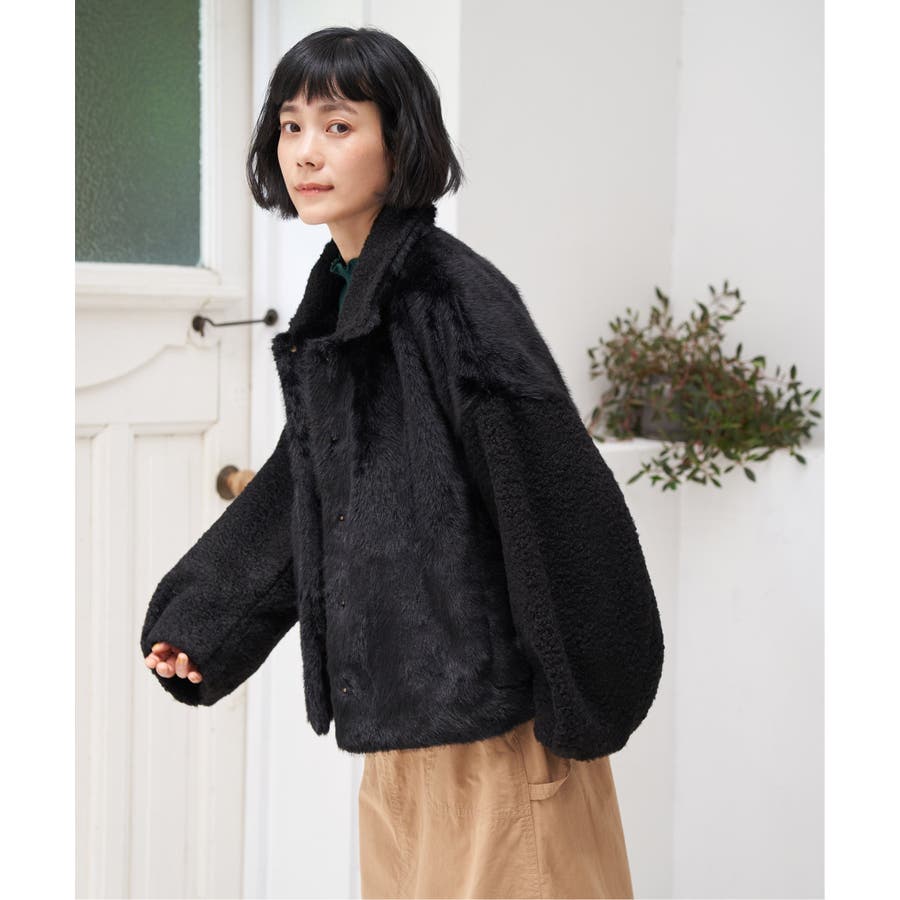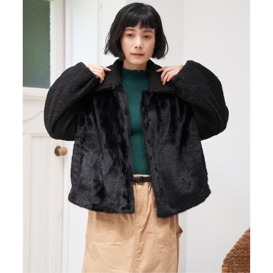 やや大きめの襟と袖で切り替えたボア使いがポイントのブルゾン。