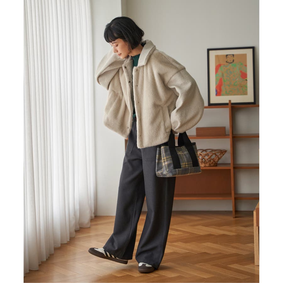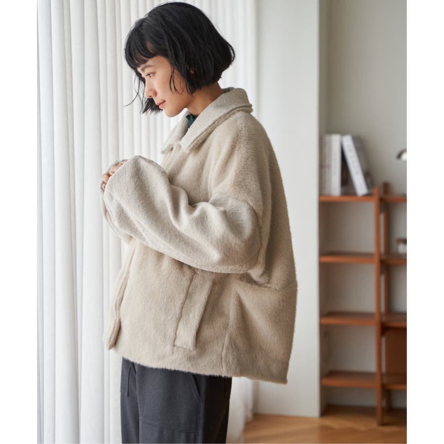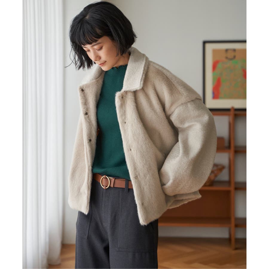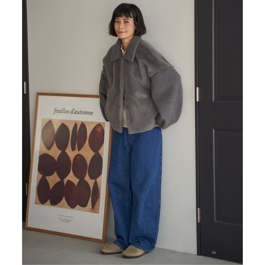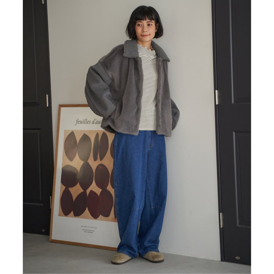やや大きめの襟と袖で切り替えたボア使いがポイントのブルゾン。