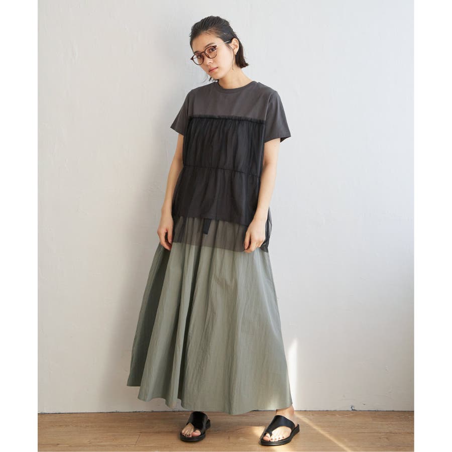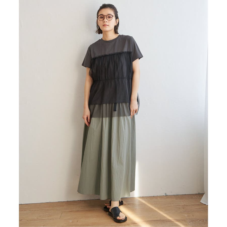 チュールをドッキングさせたTシャツ。