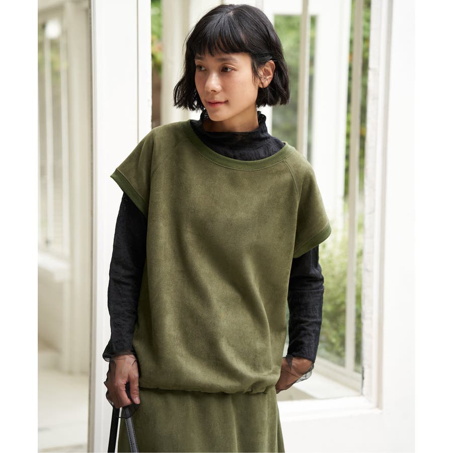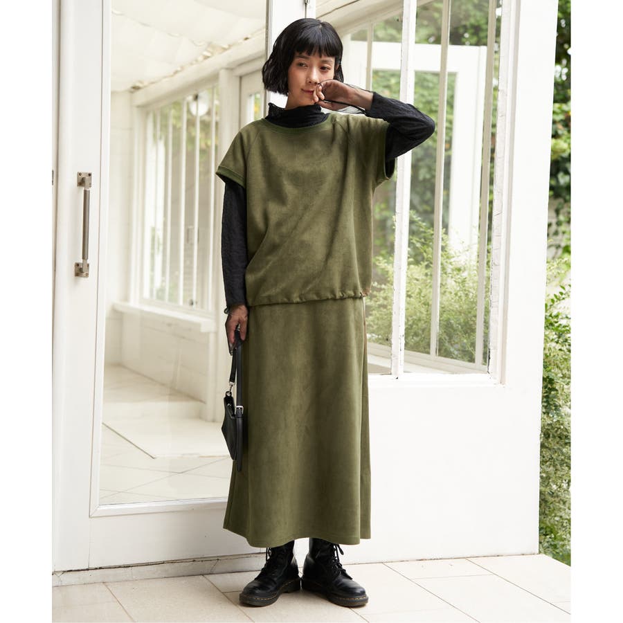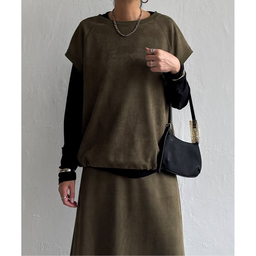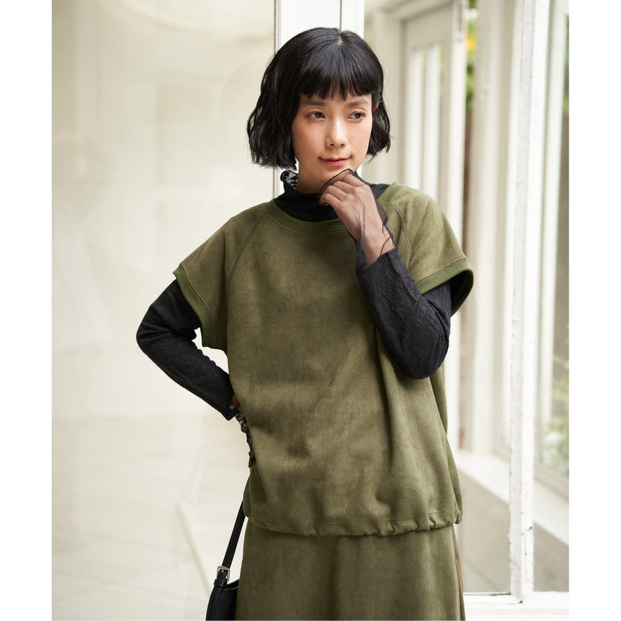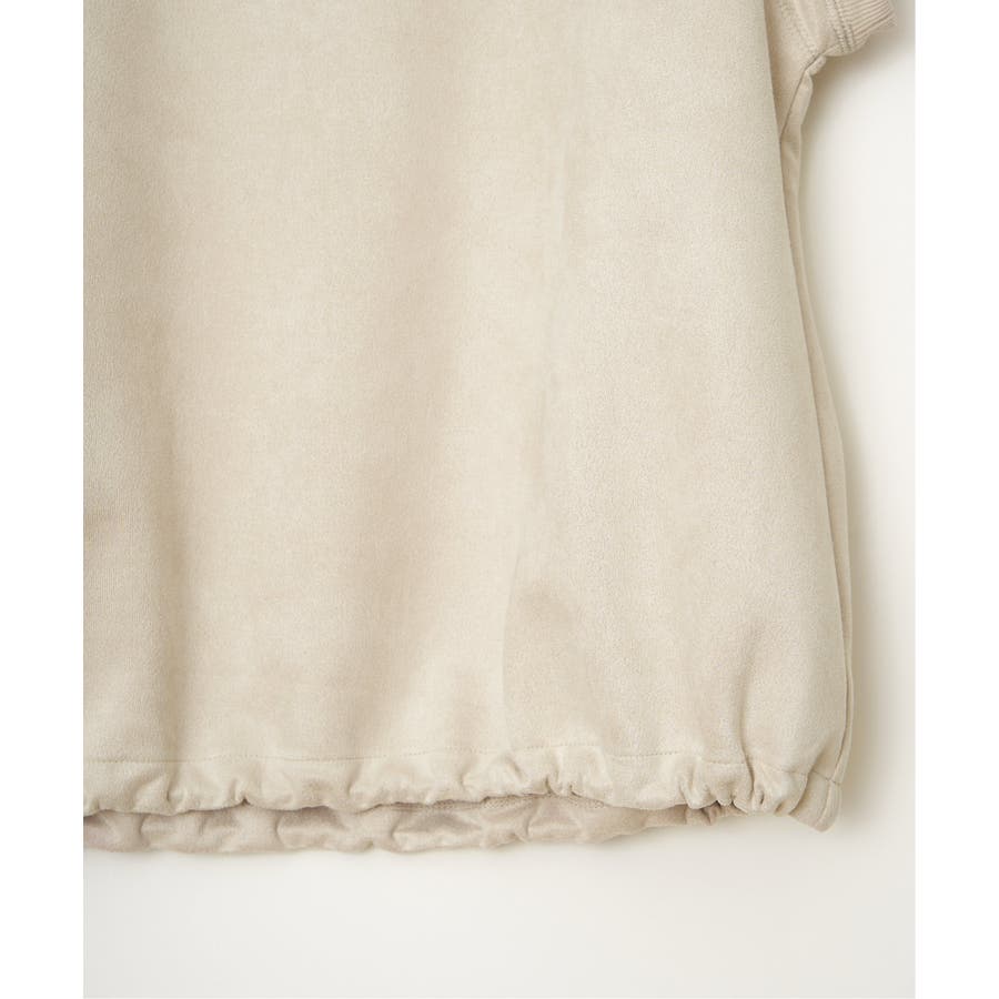 トレンドのスエード見えのベストプルオーバーで、裾にドロストがあるのでお好みのバルーンシルエットに調整することができます。