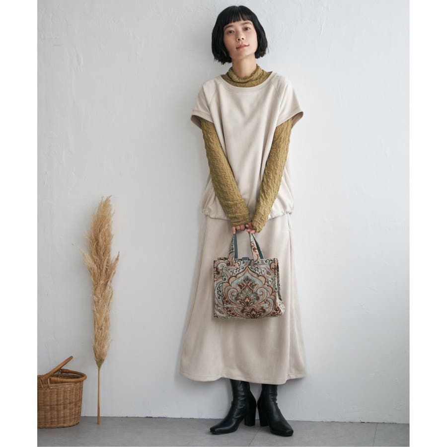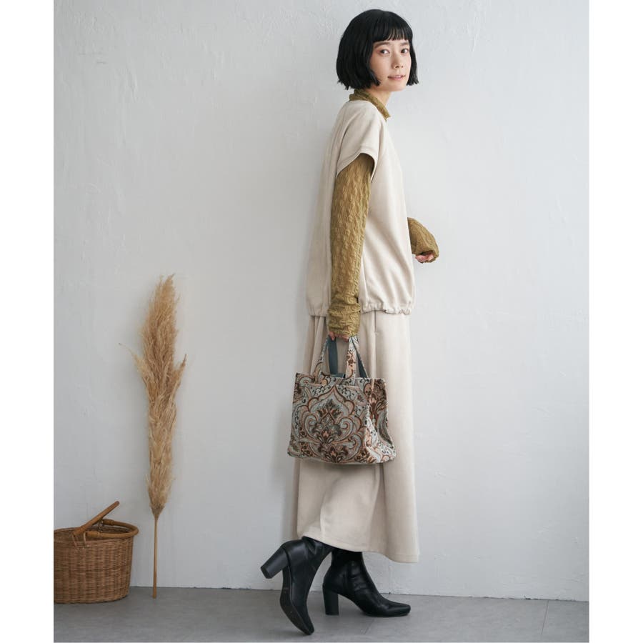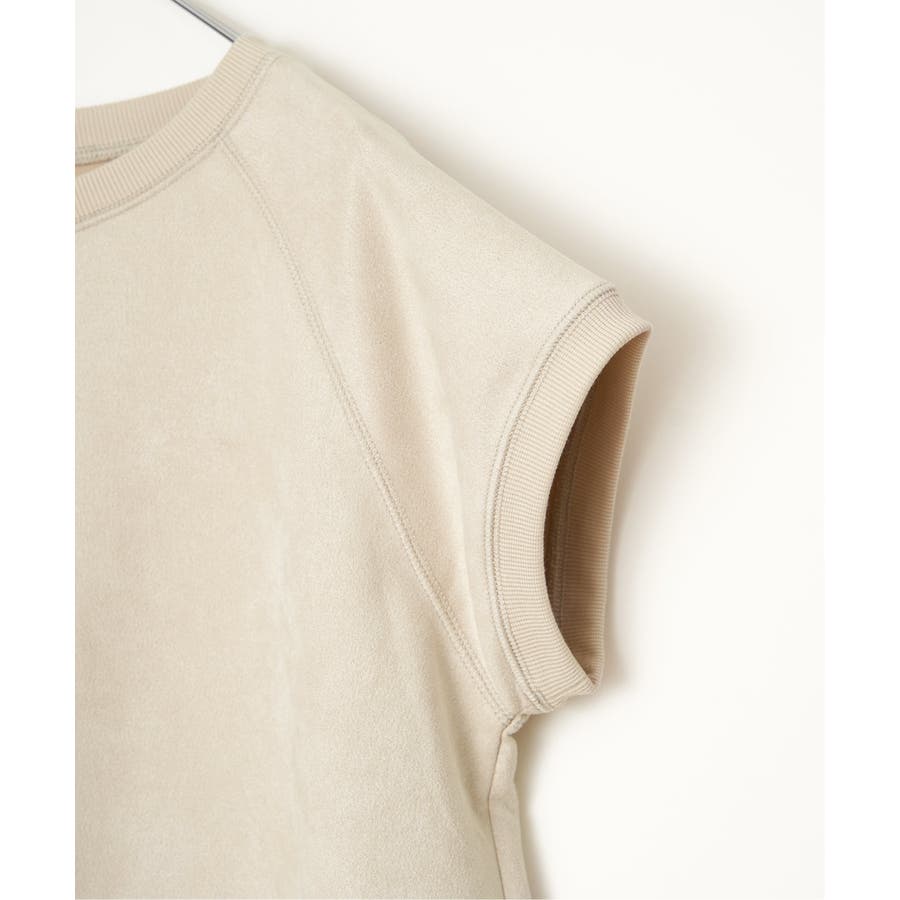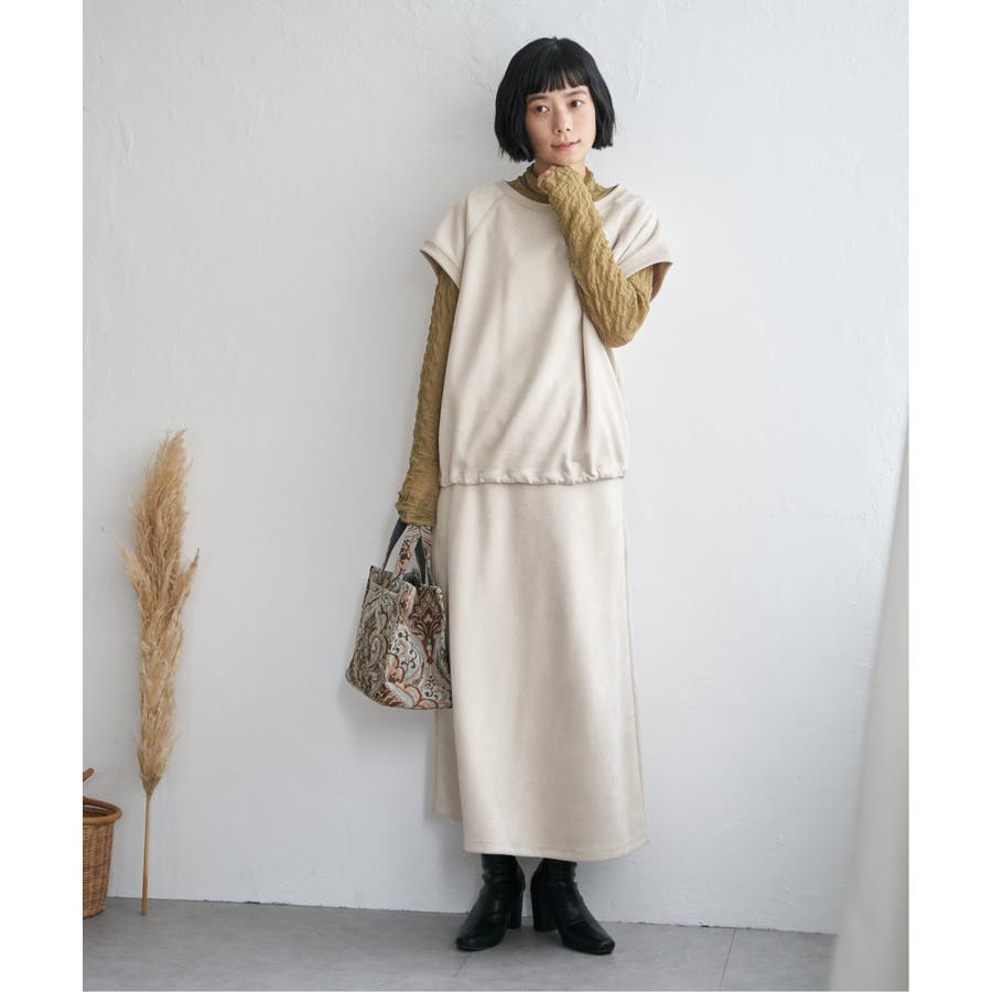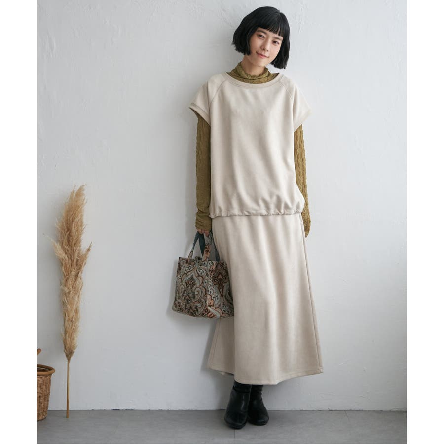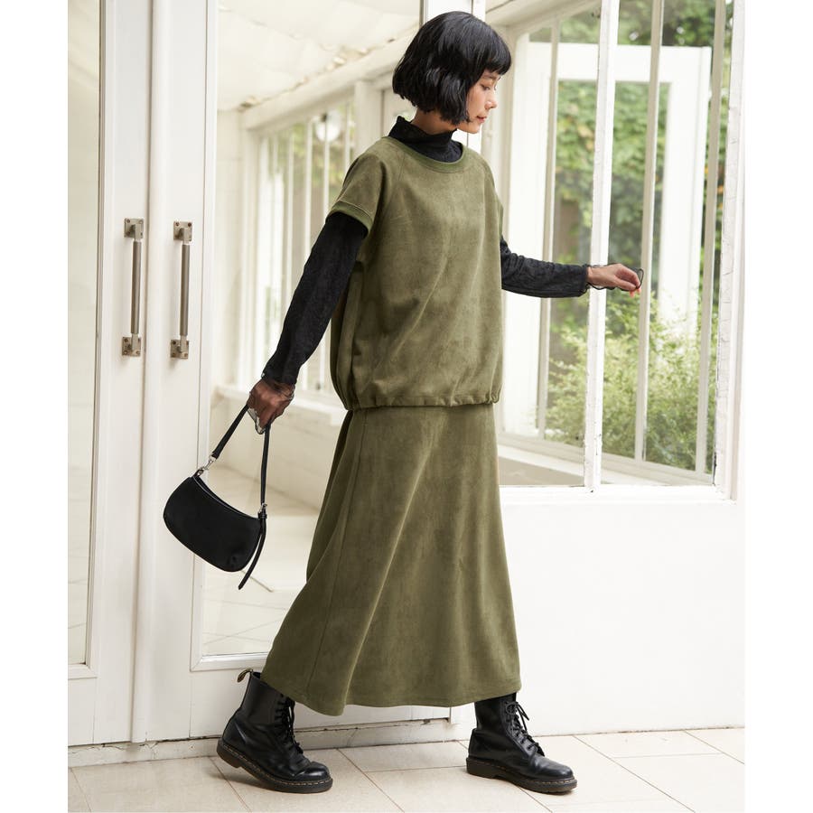 トレンドのスエード見えのベストプルオーバーで、裾にドロストがあるのでお好みのバルーンシルエットに調整することができます。