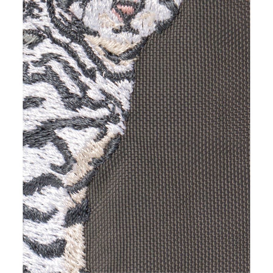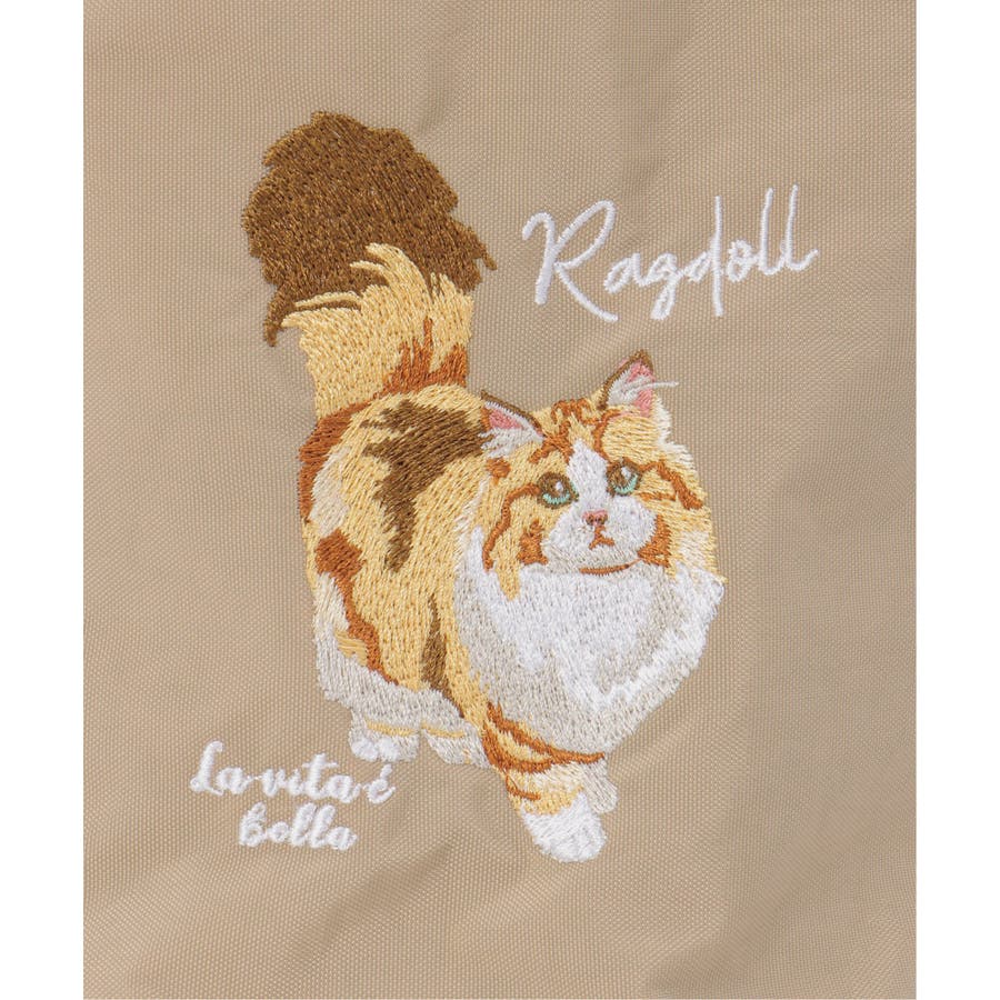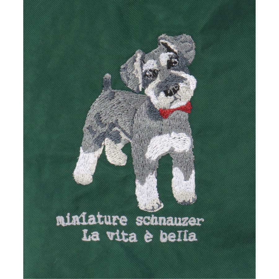 犬と猫のリアルな刺繍がバッグのフロントに施され、あたたかみのあるデザインが特徴です。
