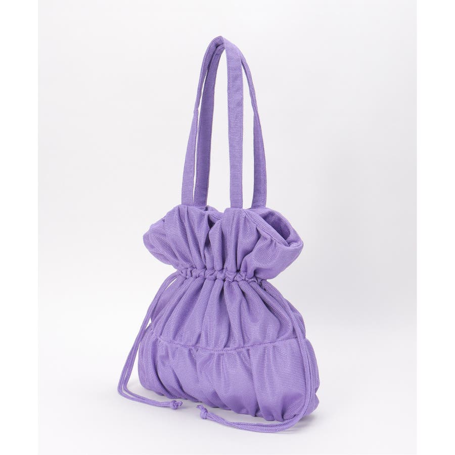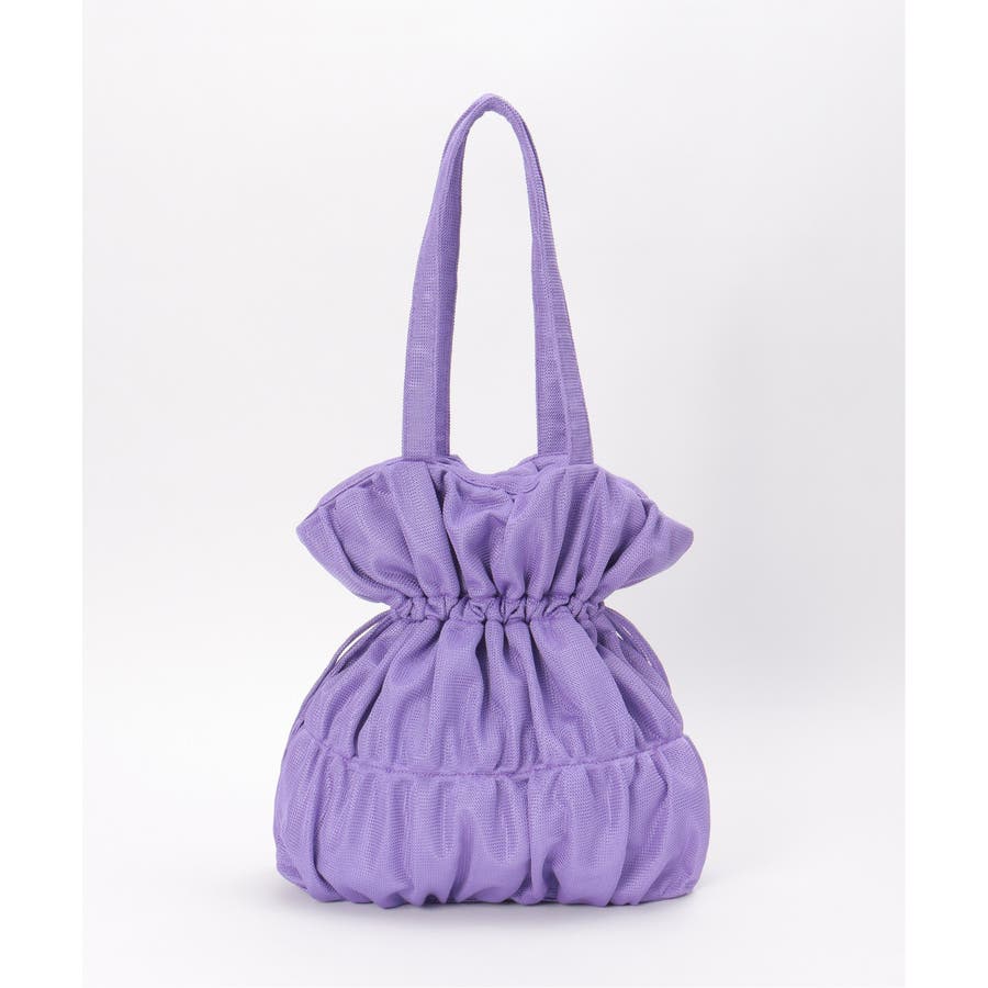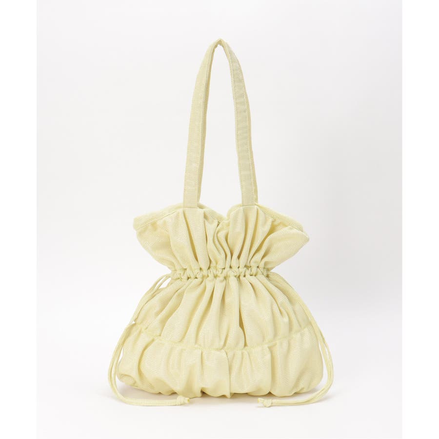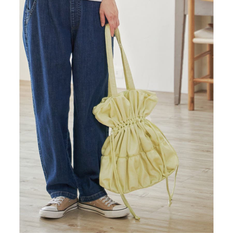 バッグ全体のギャザーと、きゅっと絞った巾着の形が愛らしいデザインです。