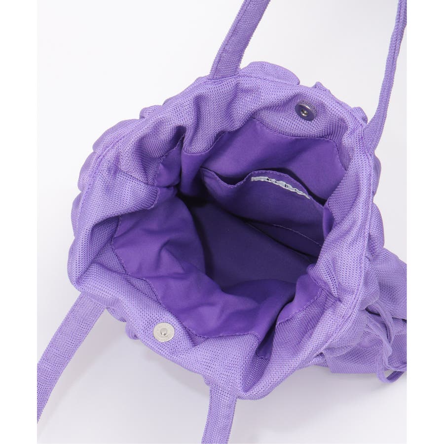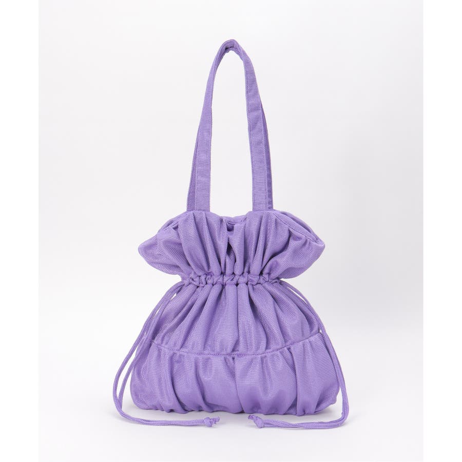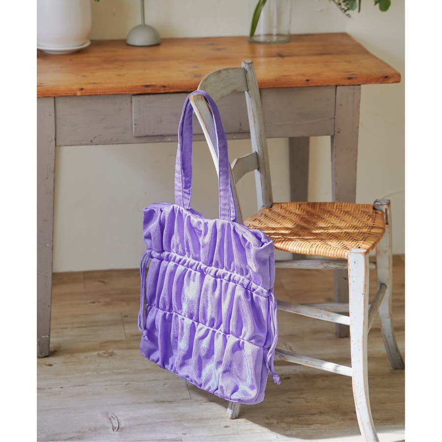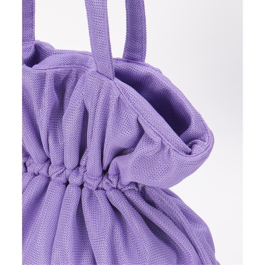 バッグ全体のギャザーと、きゅっと絞った巾着の形が愛らしいデザインです。