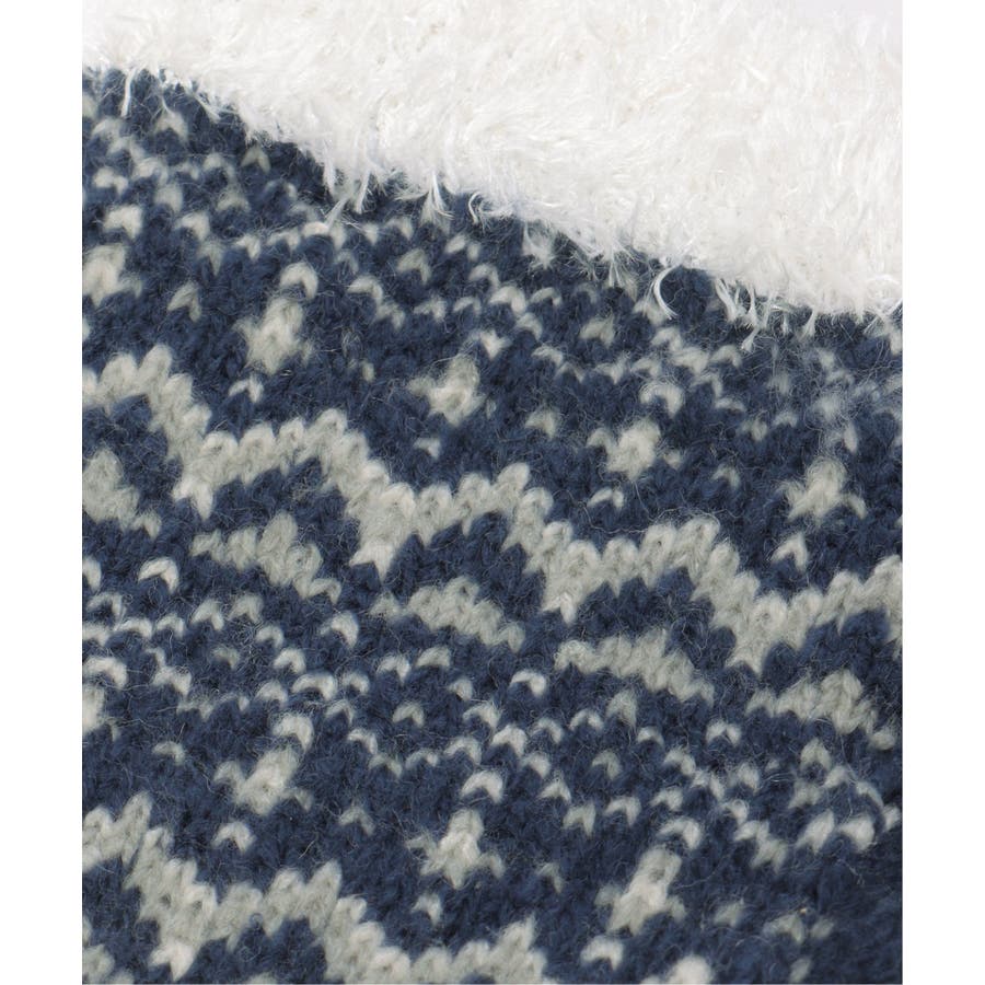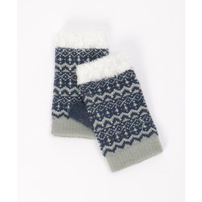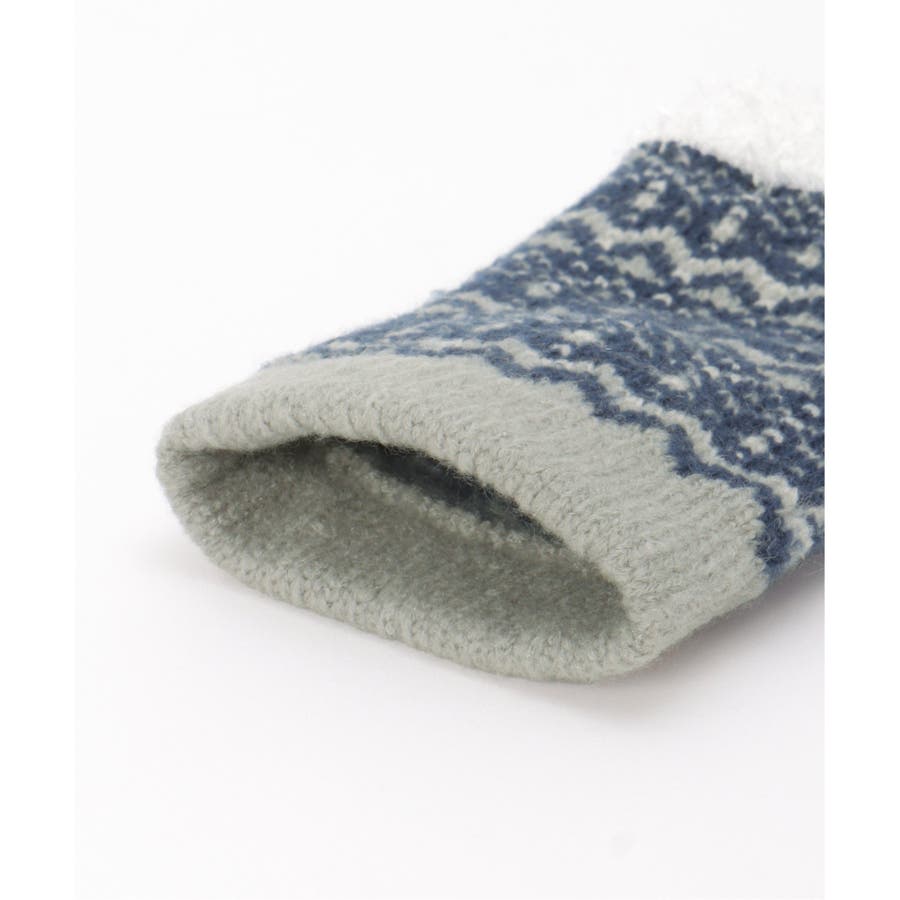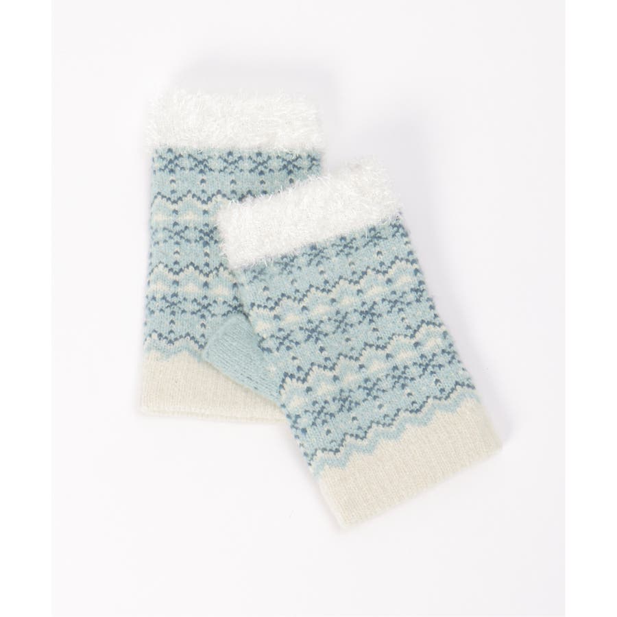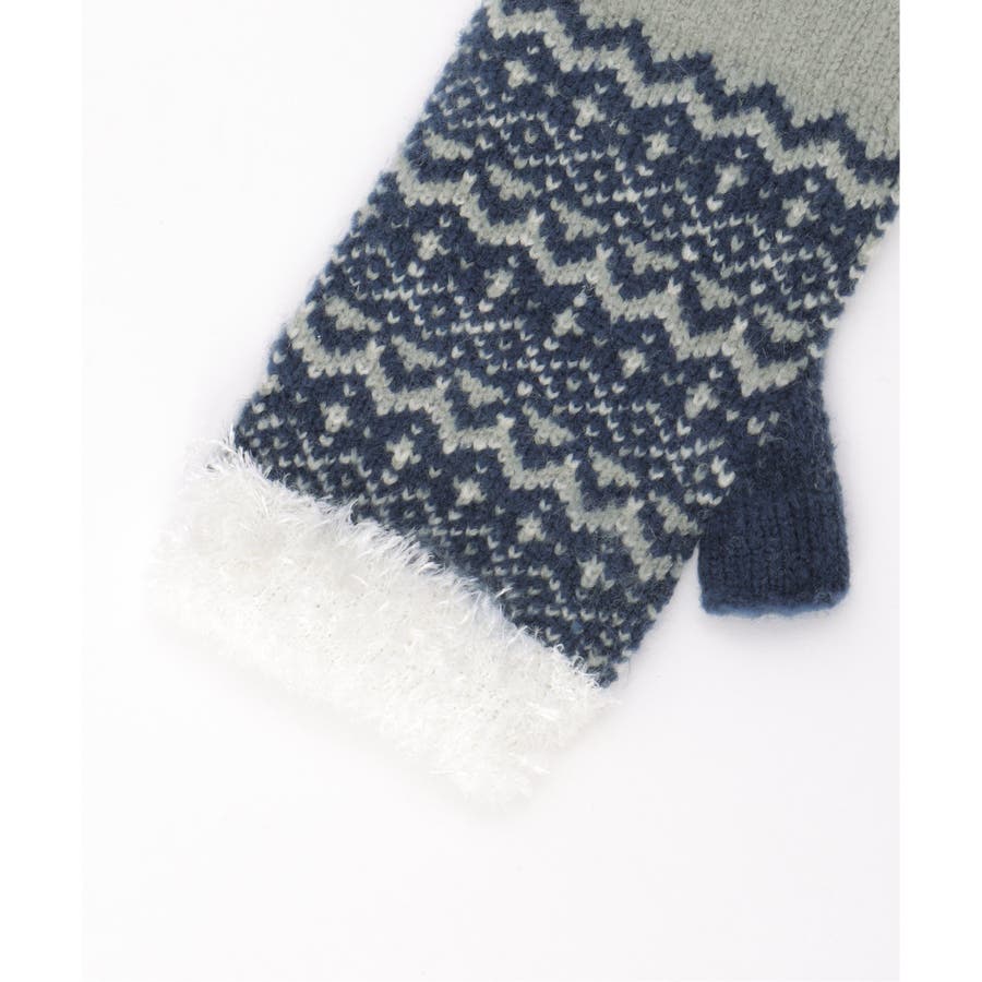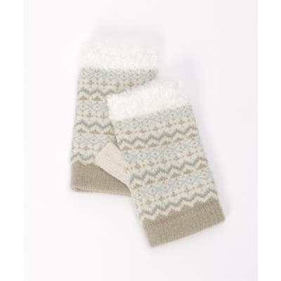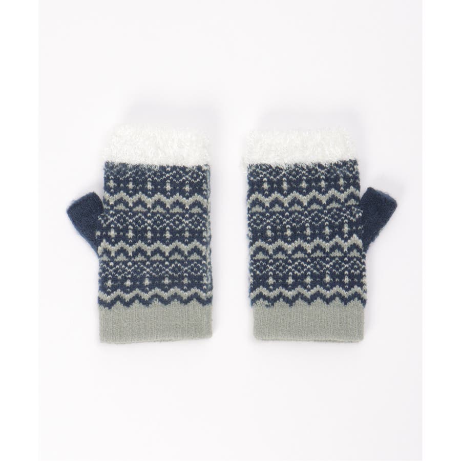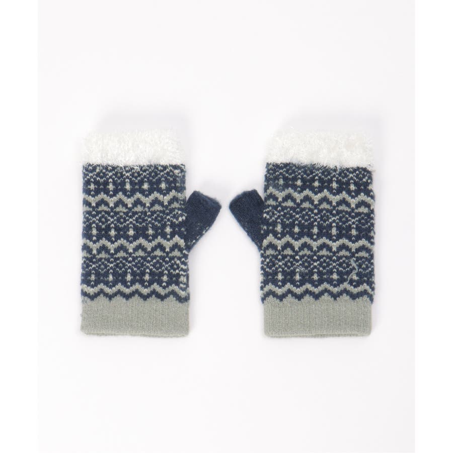 ジャガード柄の編地に、指先部分へ短いボアをあしらった指なしタイプのニット手袋。