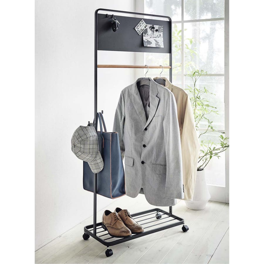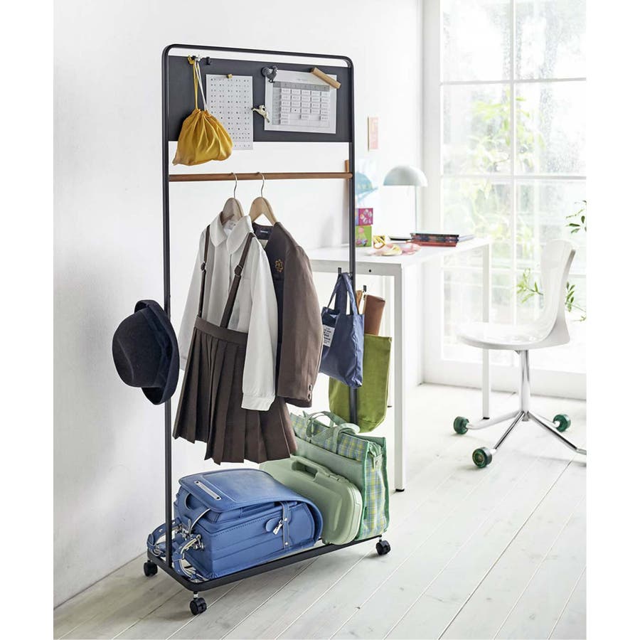 ランドセル、バッグ、制服といった通園・通学品を揃えて収納できる、パネル付きハンガーラックです。