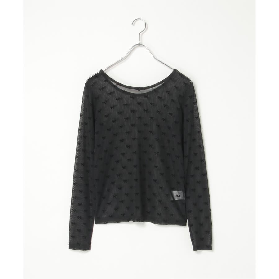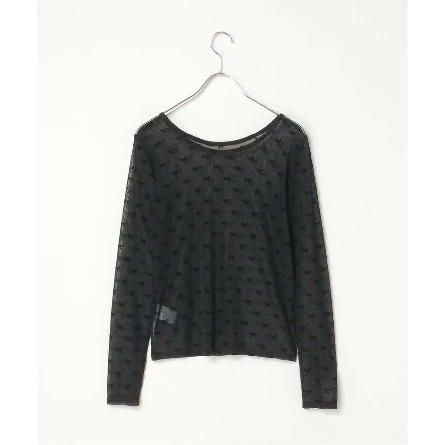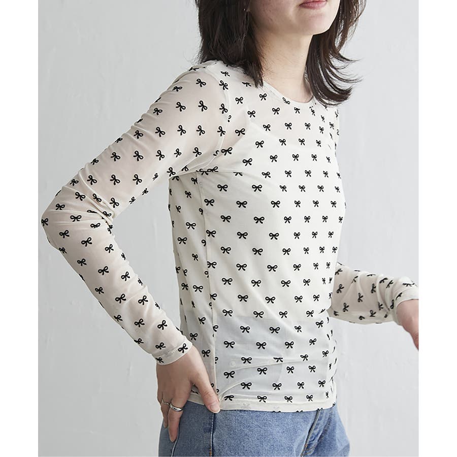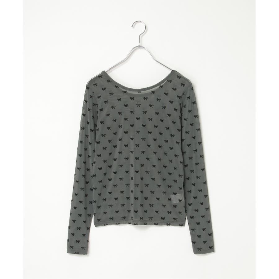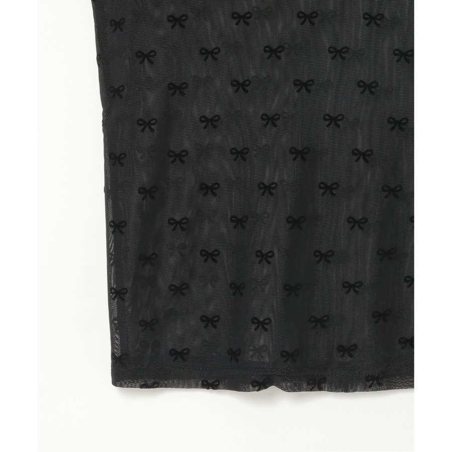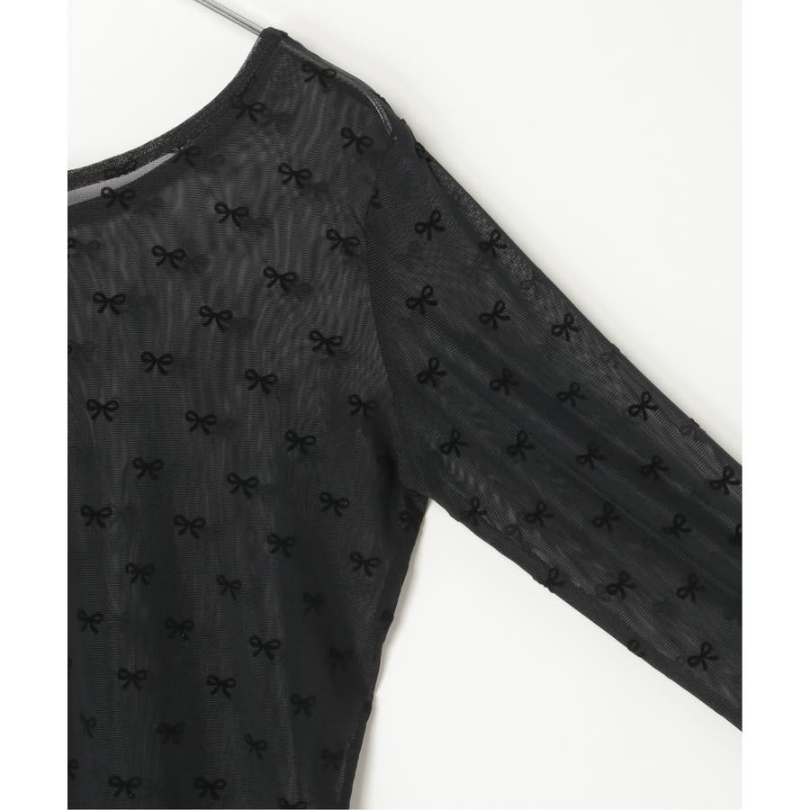 シアー素材に繊細なリボンのフロッキープリントを施したトップス。