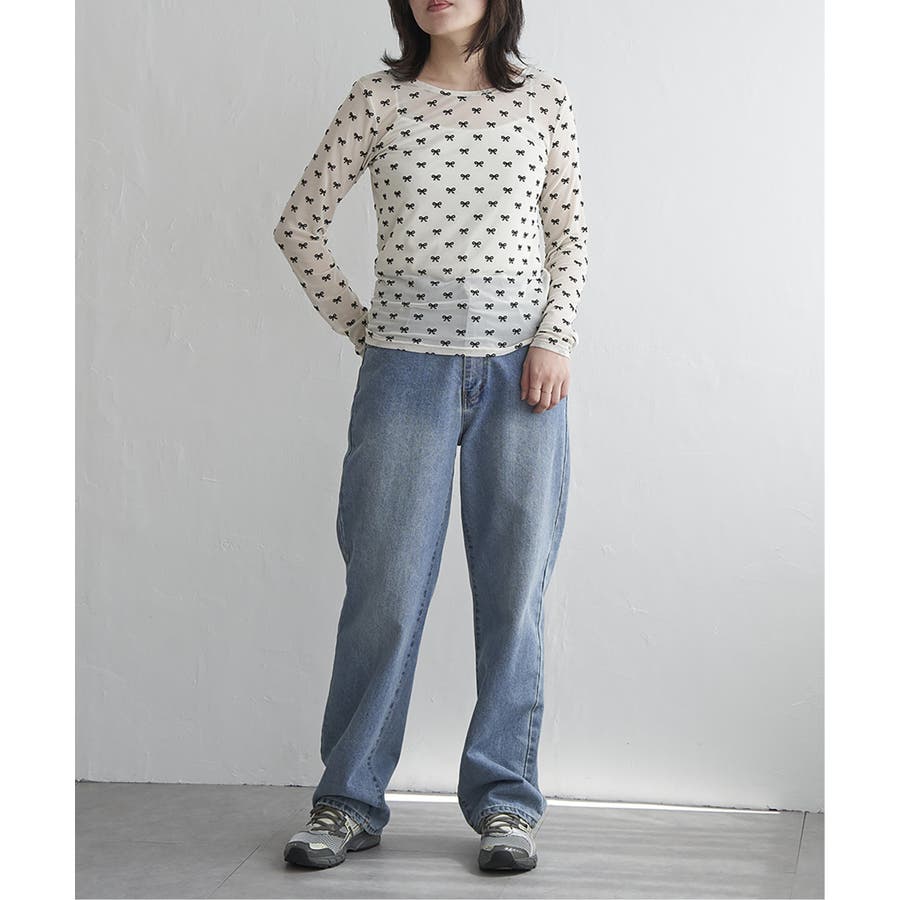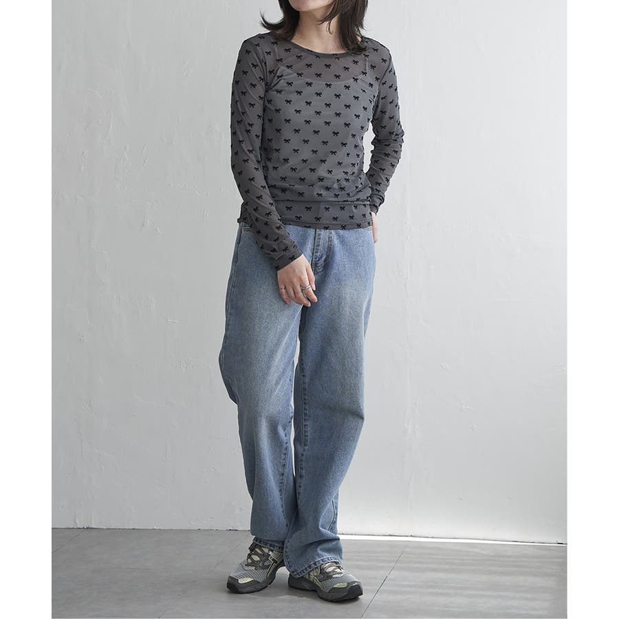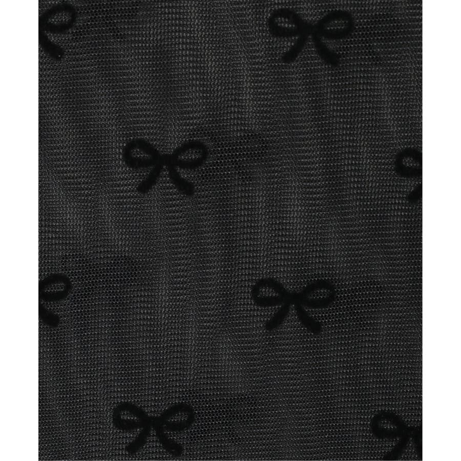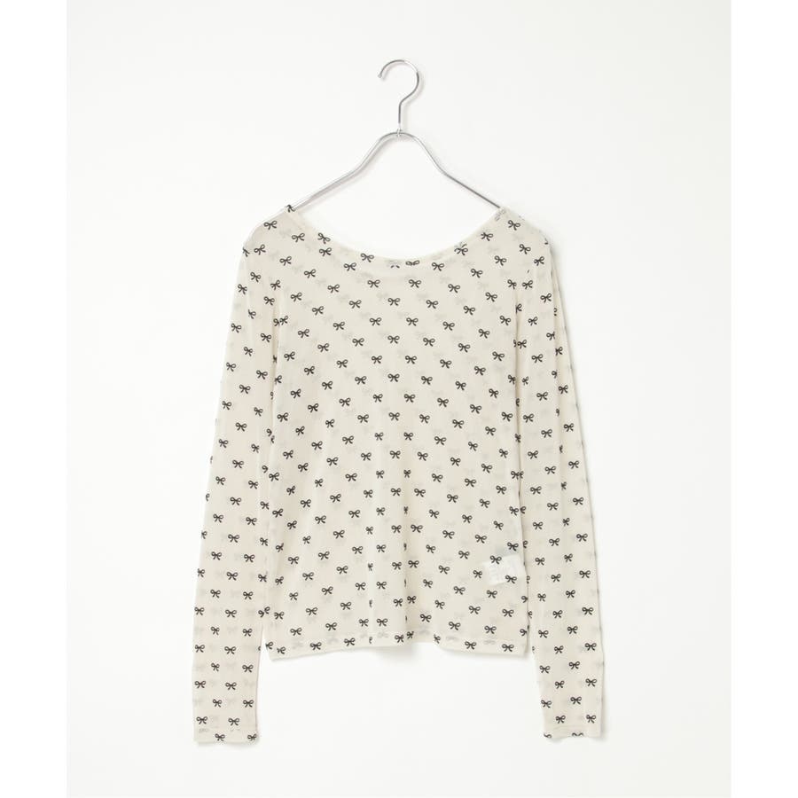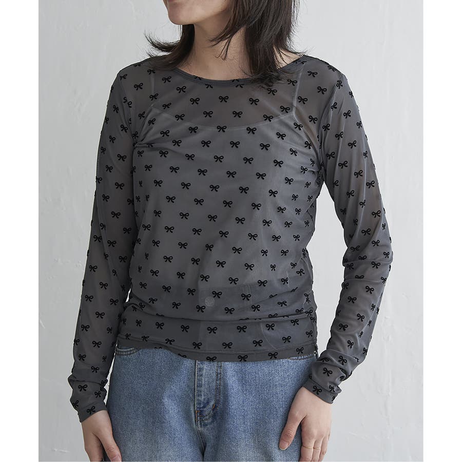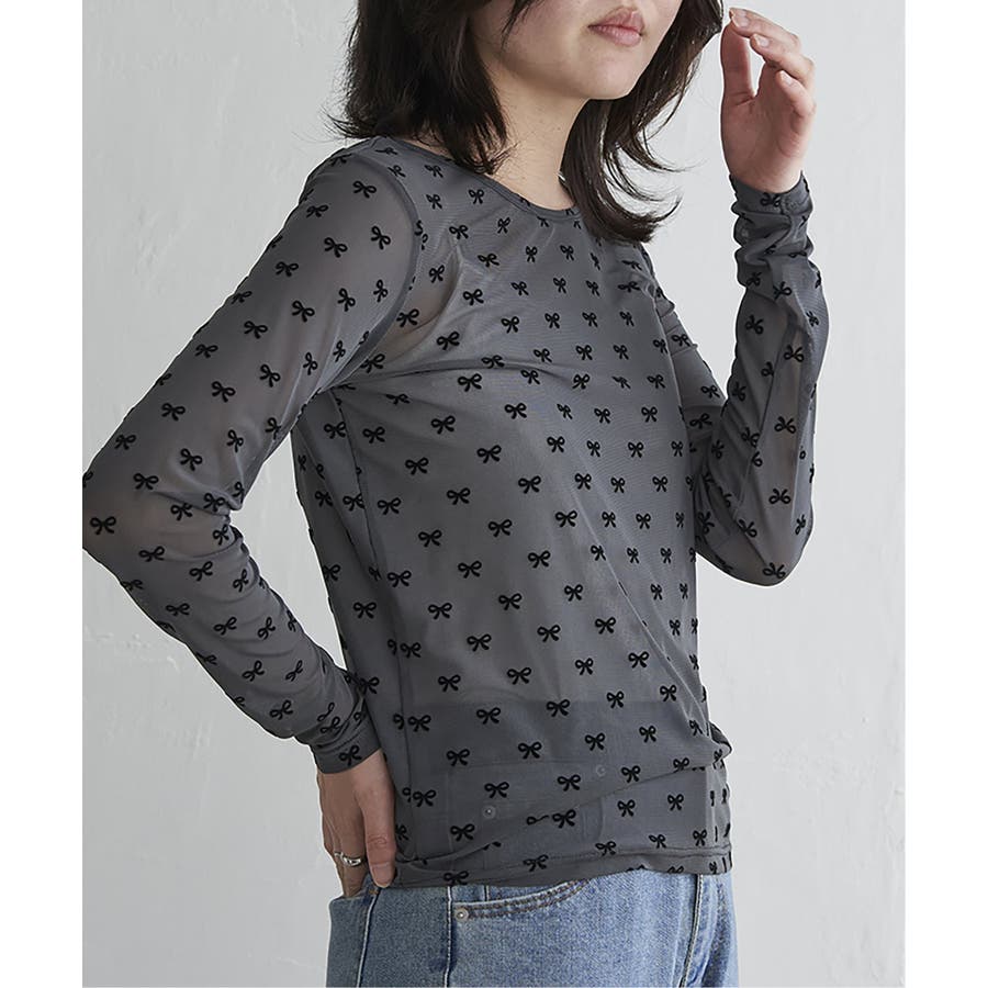 シアー素材に繊細なリボンのフロッキープリントを施したトップス。