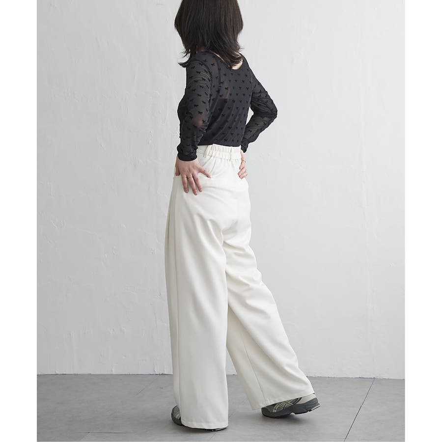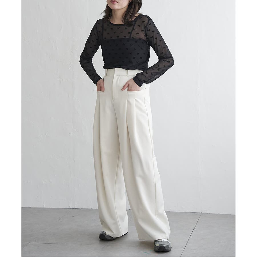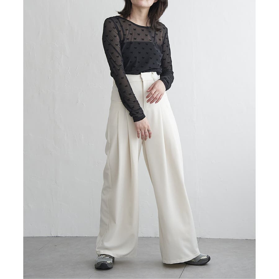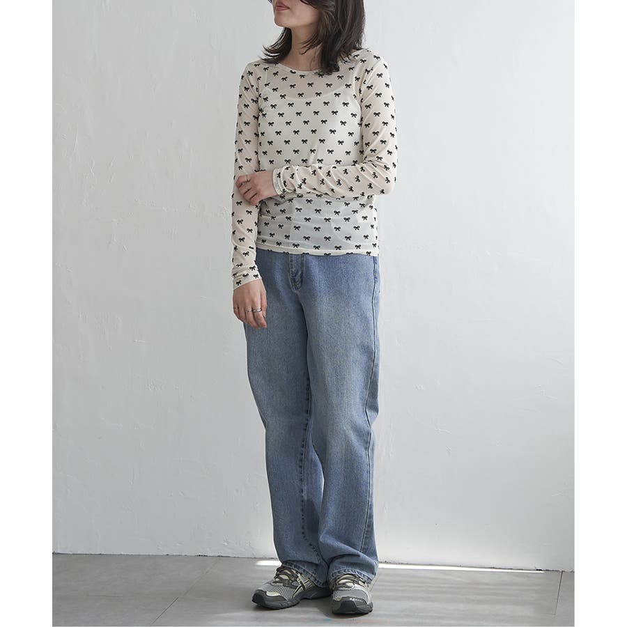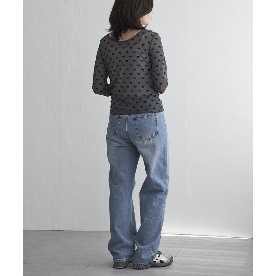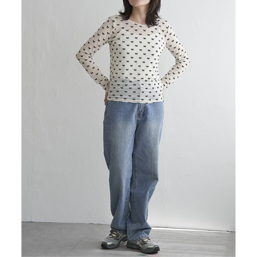 シアー素材に繊細なリボンのフロッキープリントを施したトップス。