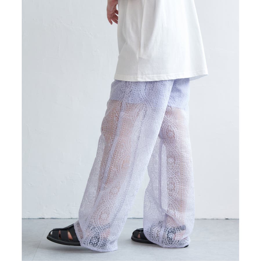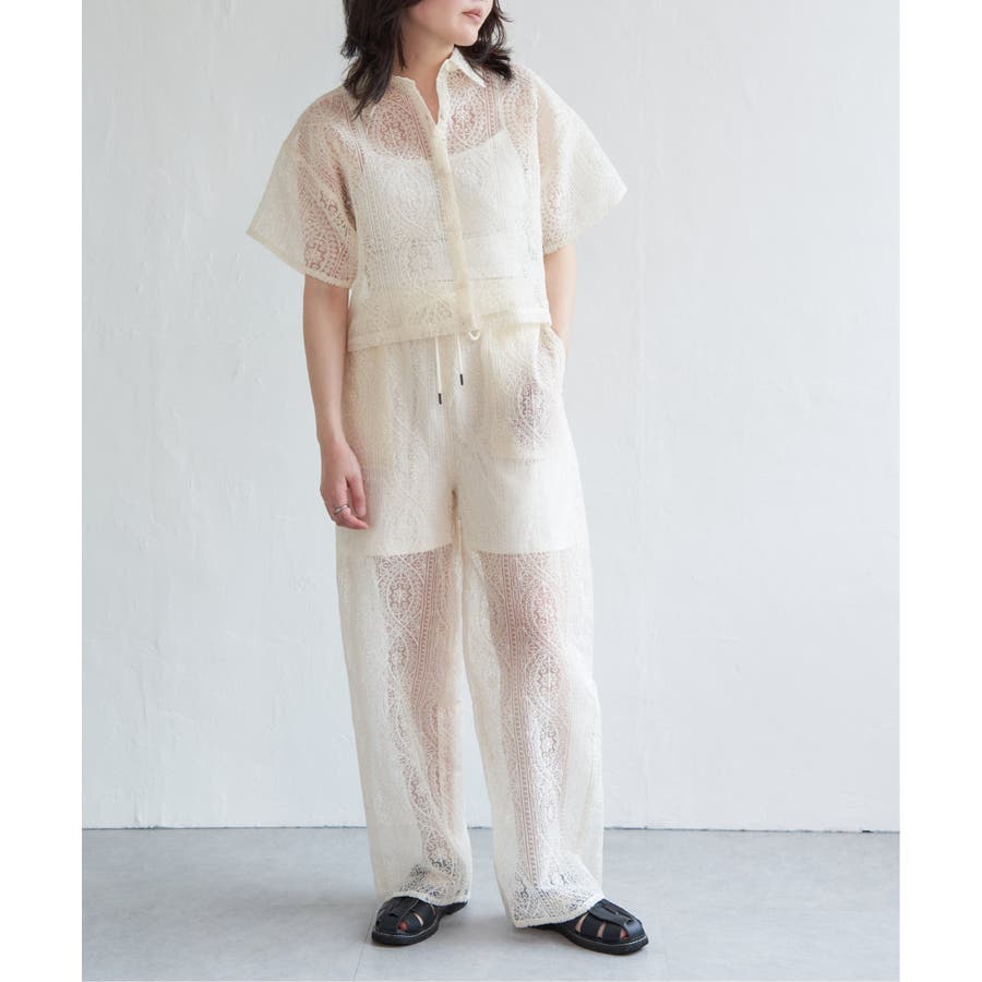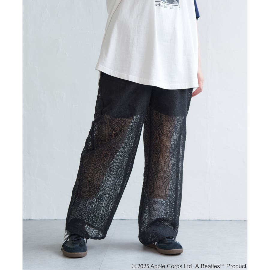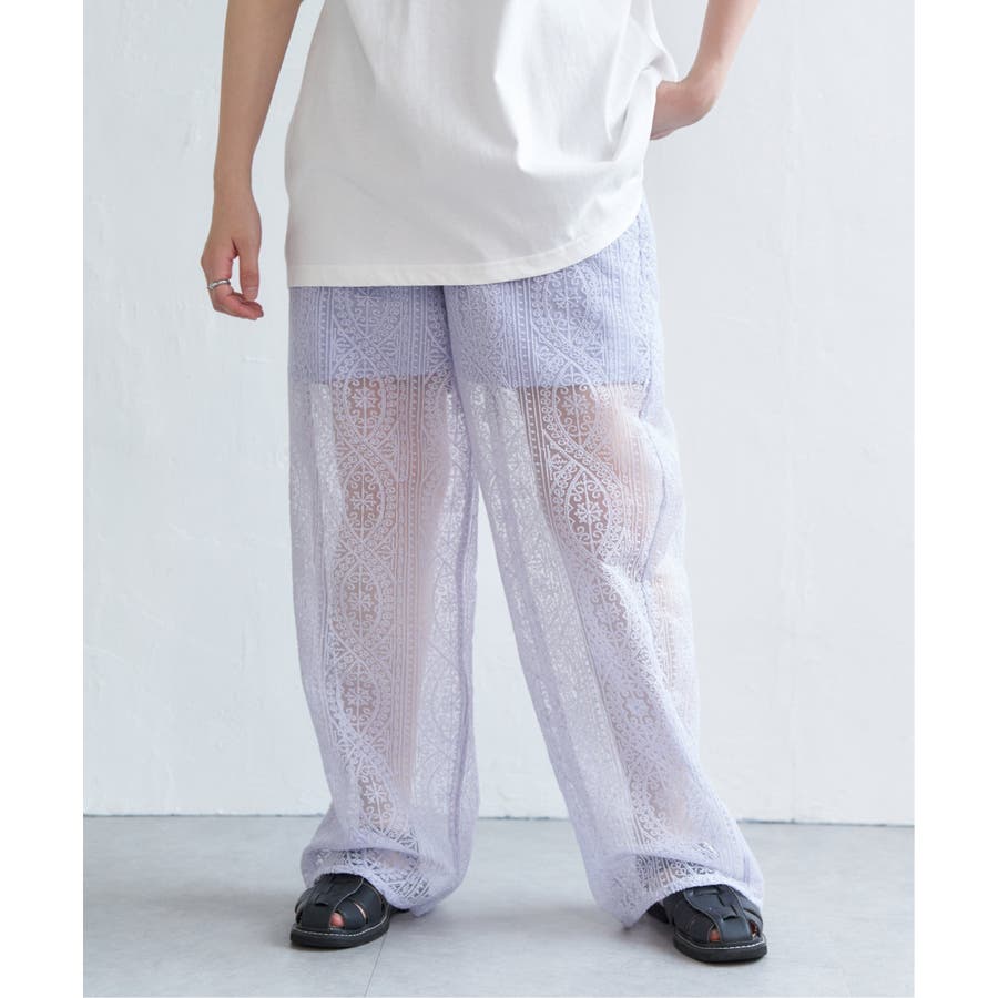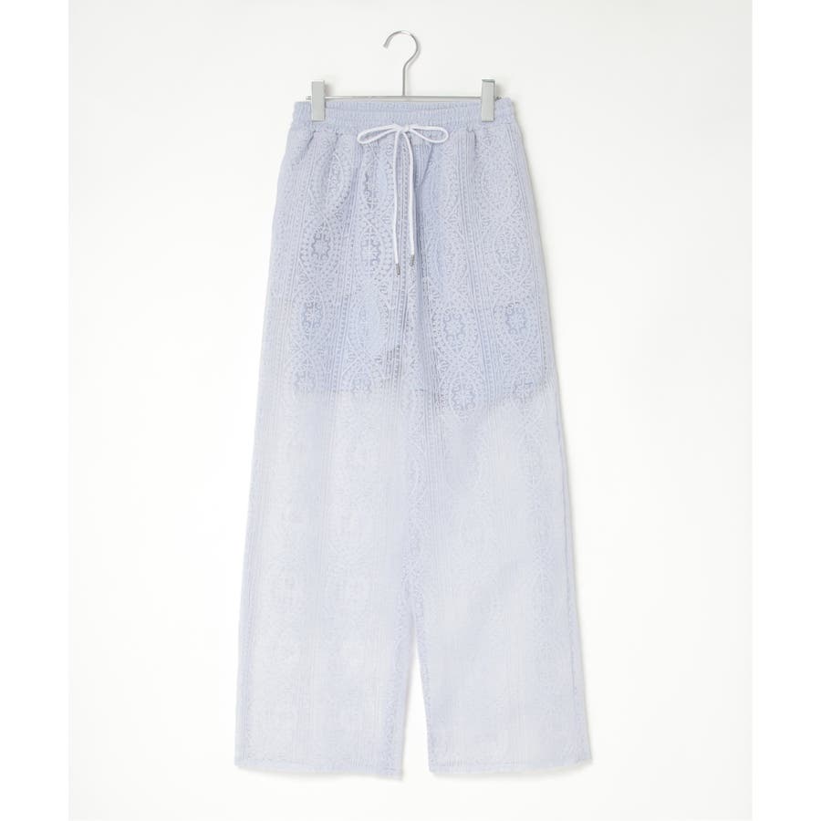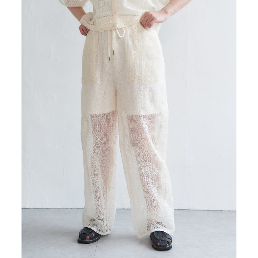 繊細な総レースが目を引く、ワイドシルエットのイージーパンツ。