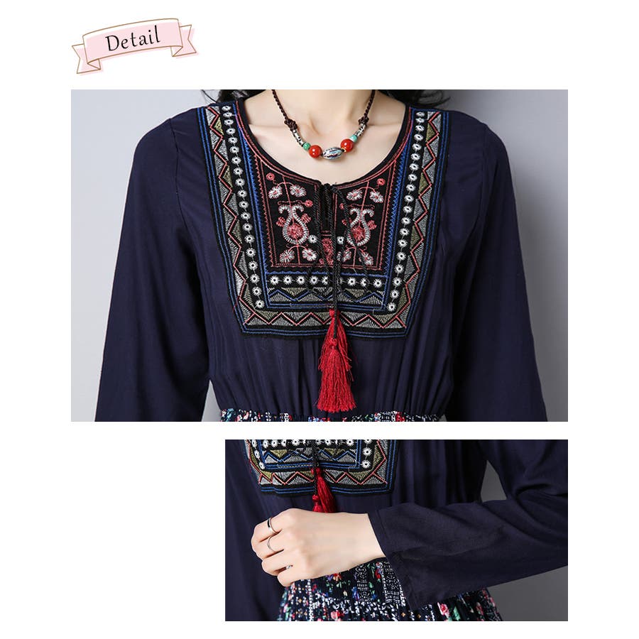 胸元の刺繍使いと紐リボンがおしゃれな異国風デザイン。