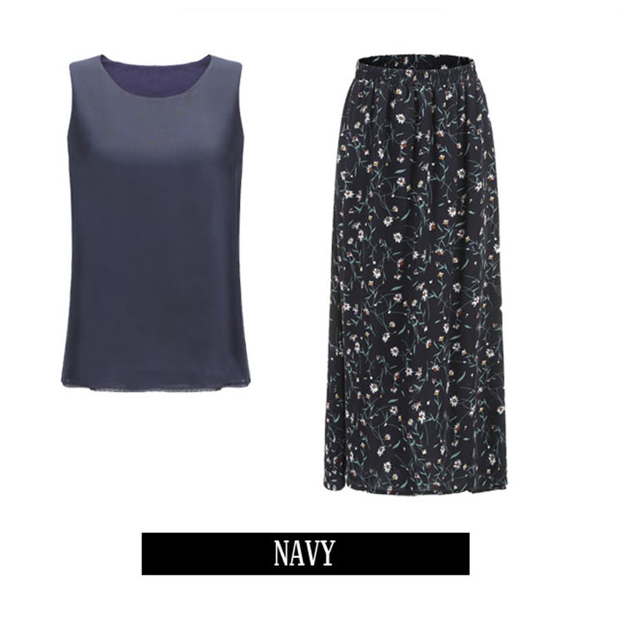 シフォン素材を重ねたブラウス&花柄ギャザースカートのセットです