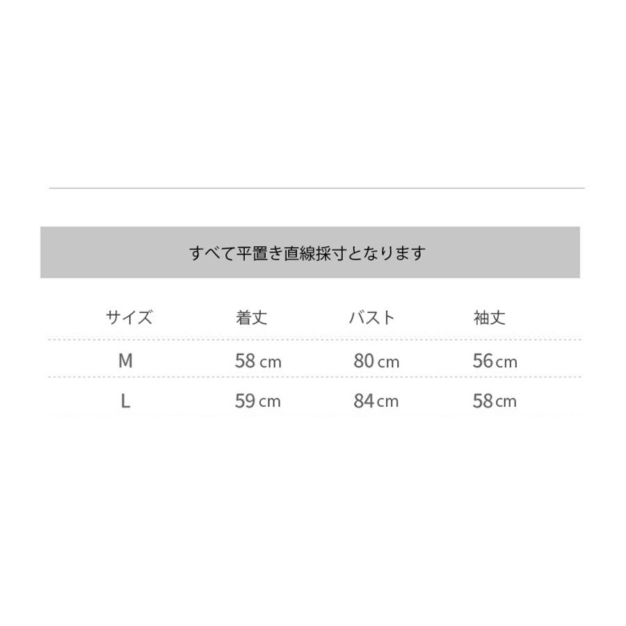 | サイズ | 【M】 着丈:58cm/バスト80cm/袖丈:54cm 【L】 着丈:59cmバスト84cm袖丈:56cm ※すべて平置き直線採寸となります。 ※採寸位置により若干の誤差が生じる場合が御座います。 |