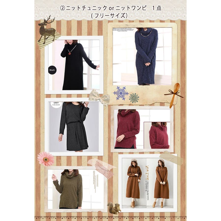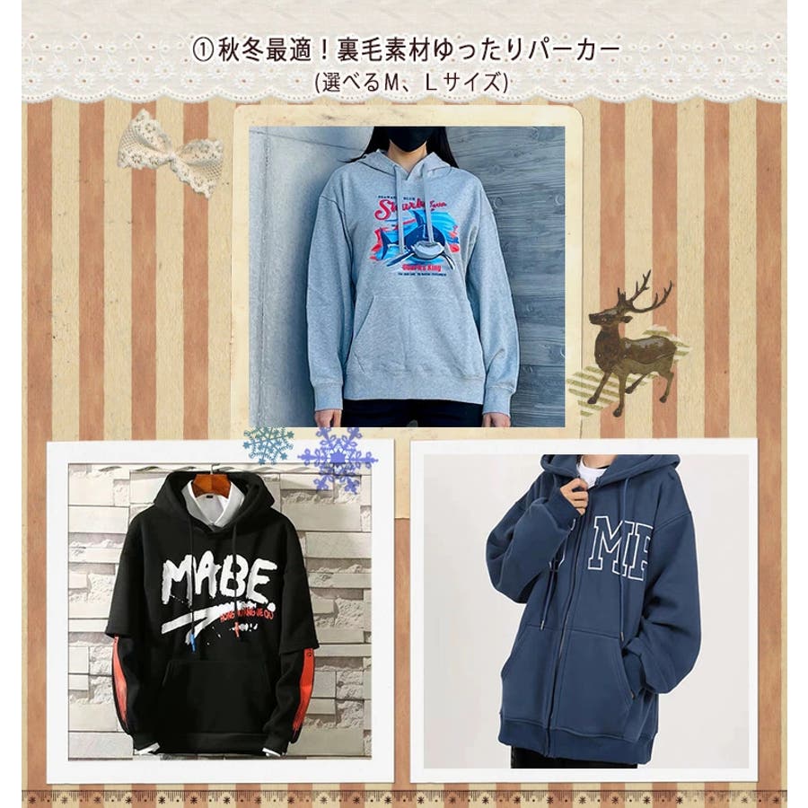 | 福袋内容 | (1)秋冬最適!トレーナー、パーカー 1点 (選べるM、Lサイズ) (2)ニットチュニックorニットワンピ 1点 (フリーサイズ ) (3)レギンスorレギパンorジョガーパンツ 1点 (4)洗えるマスク 2枚 (5)着圧 ハイカット デザインソックス 1点 (6)その他 1点 |